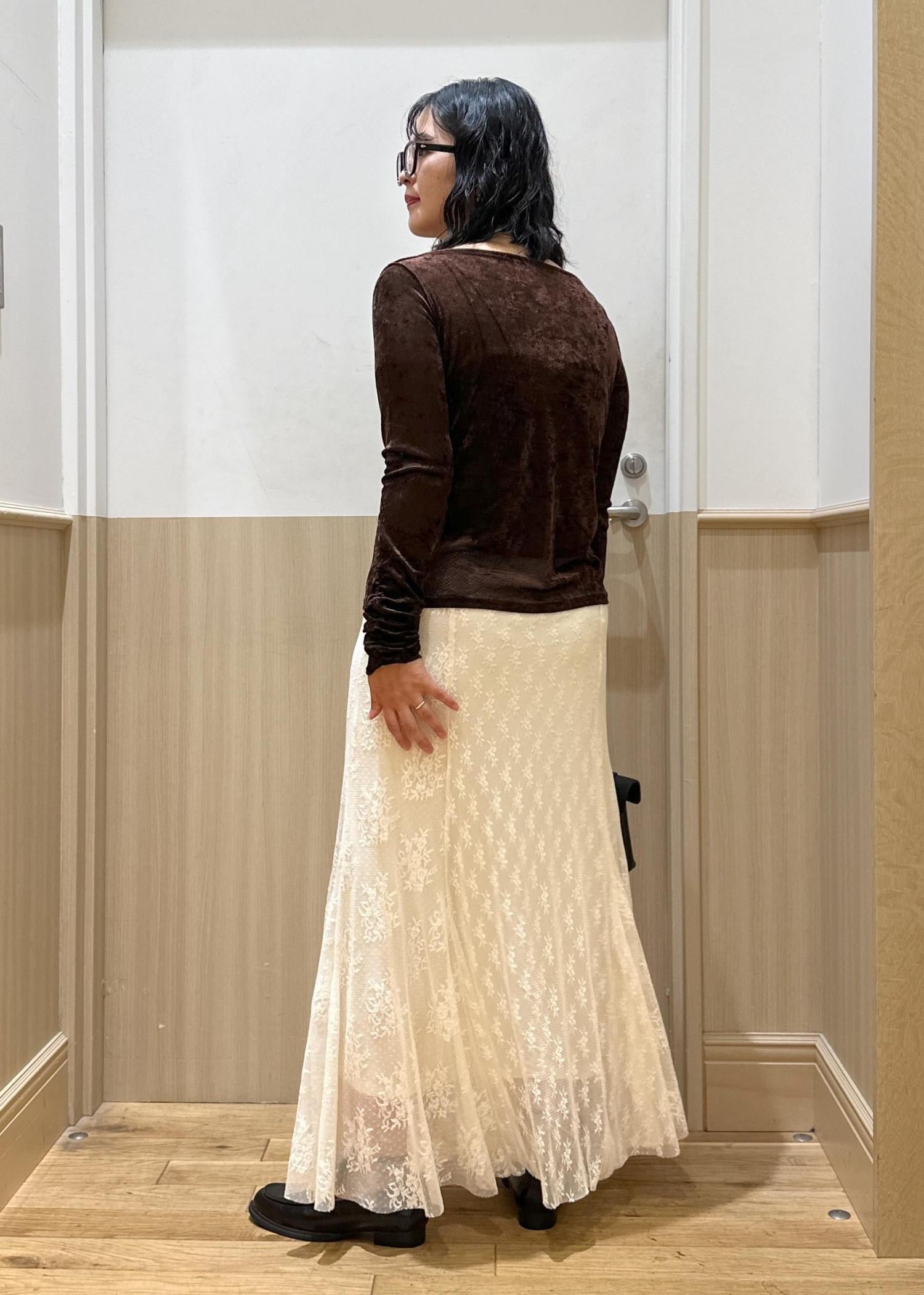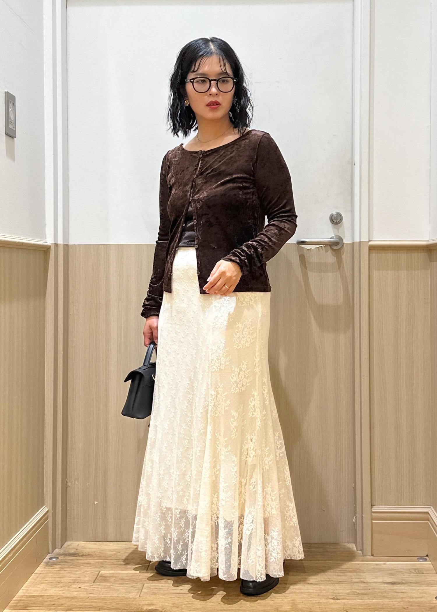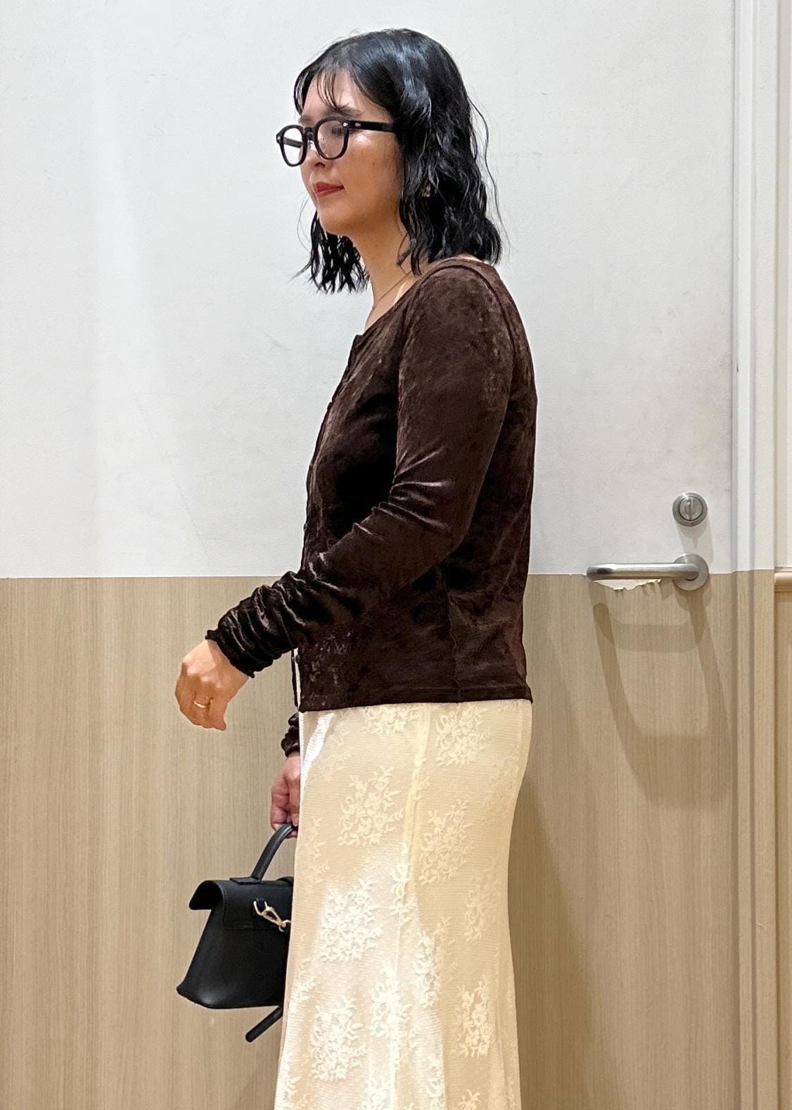 ブラウン×ベロアで高級感があり高見えもしつつ、レースのスカートで柔らかい印象になるようにしてみました。