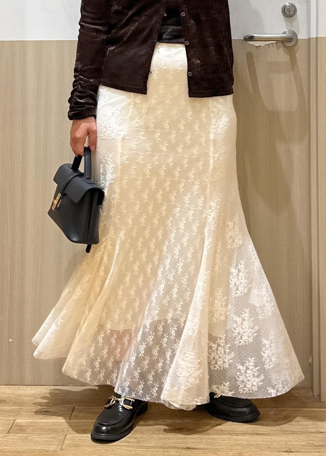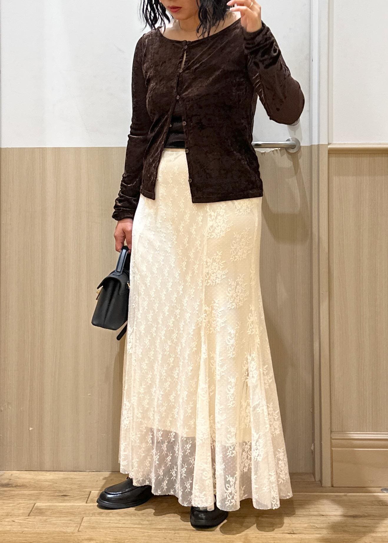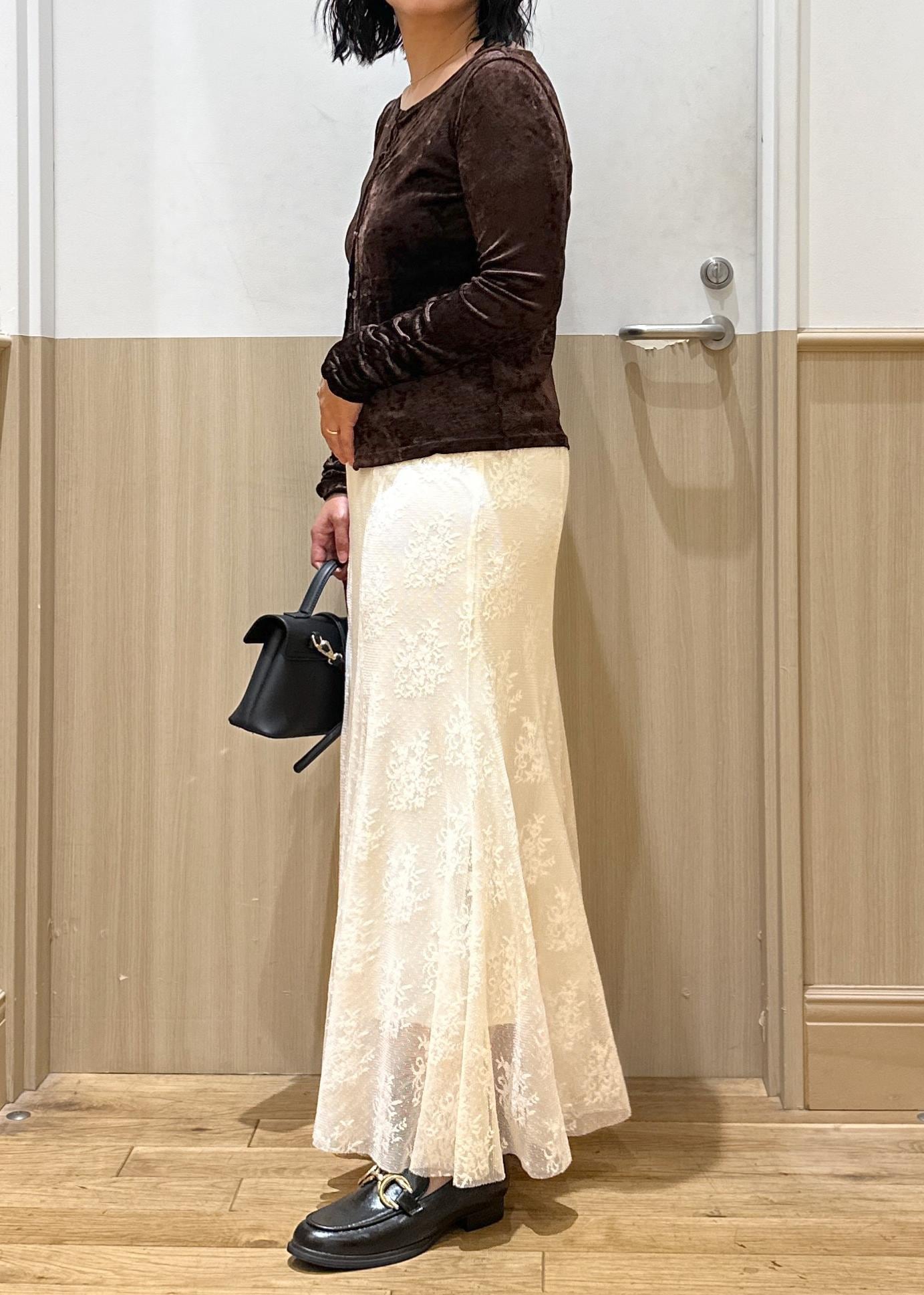 ブラウン×ベロアで高級感があり高見えもしつつ、レースのスカートで柔らかい印象になるようにしてみました。