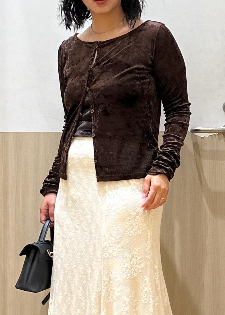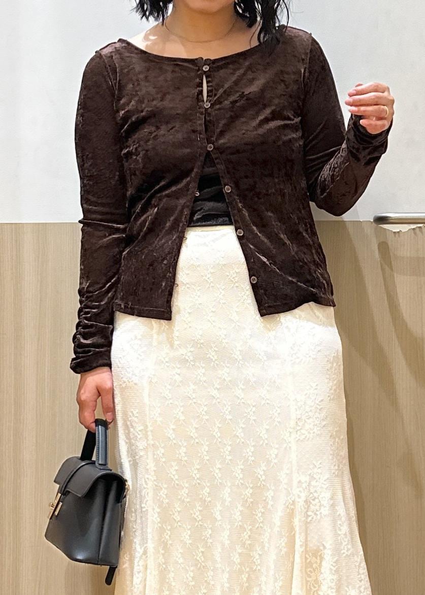 トレンドのベロア素材、カーデやシャツのインナーに合わせて今年らしいコーデに!