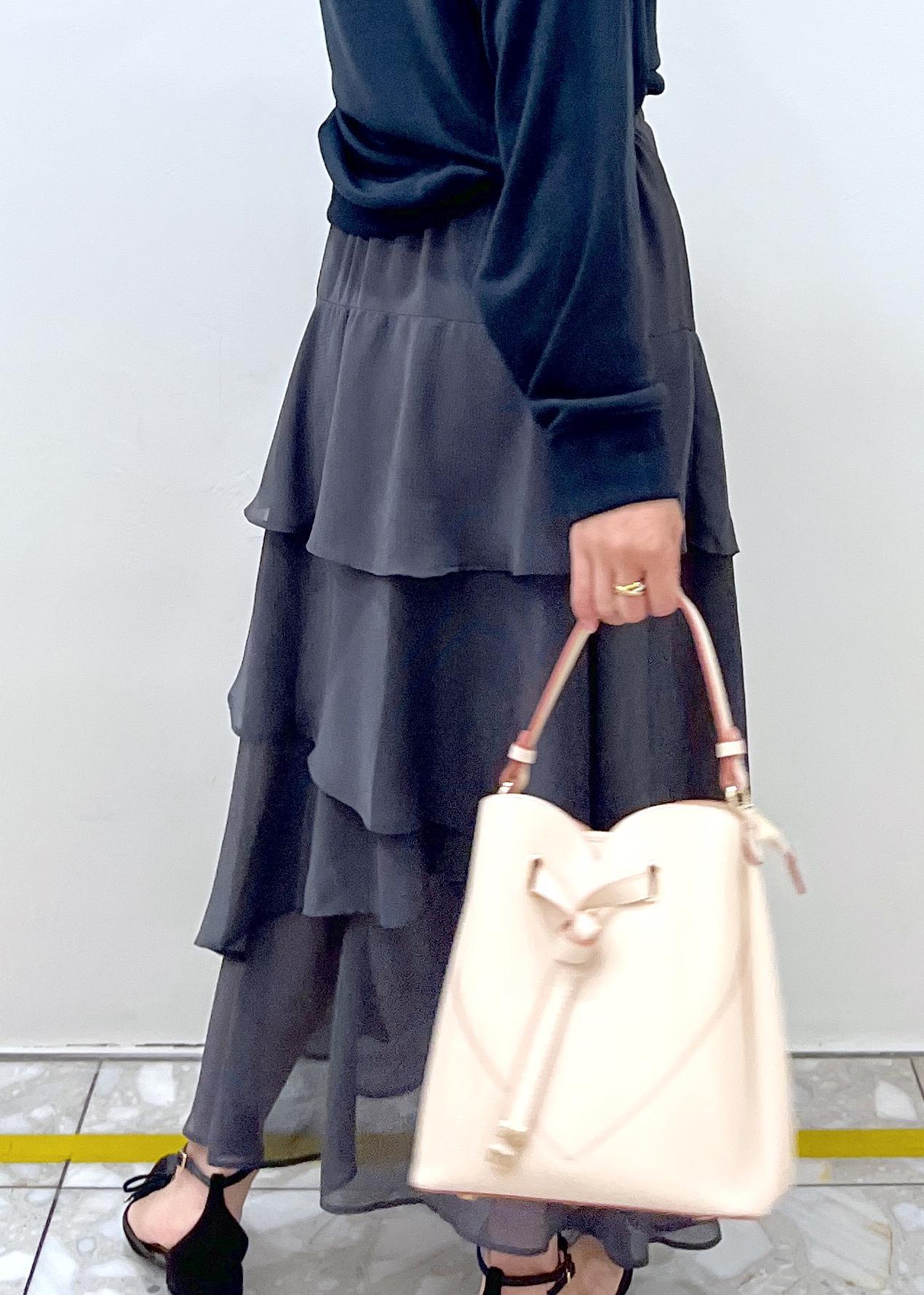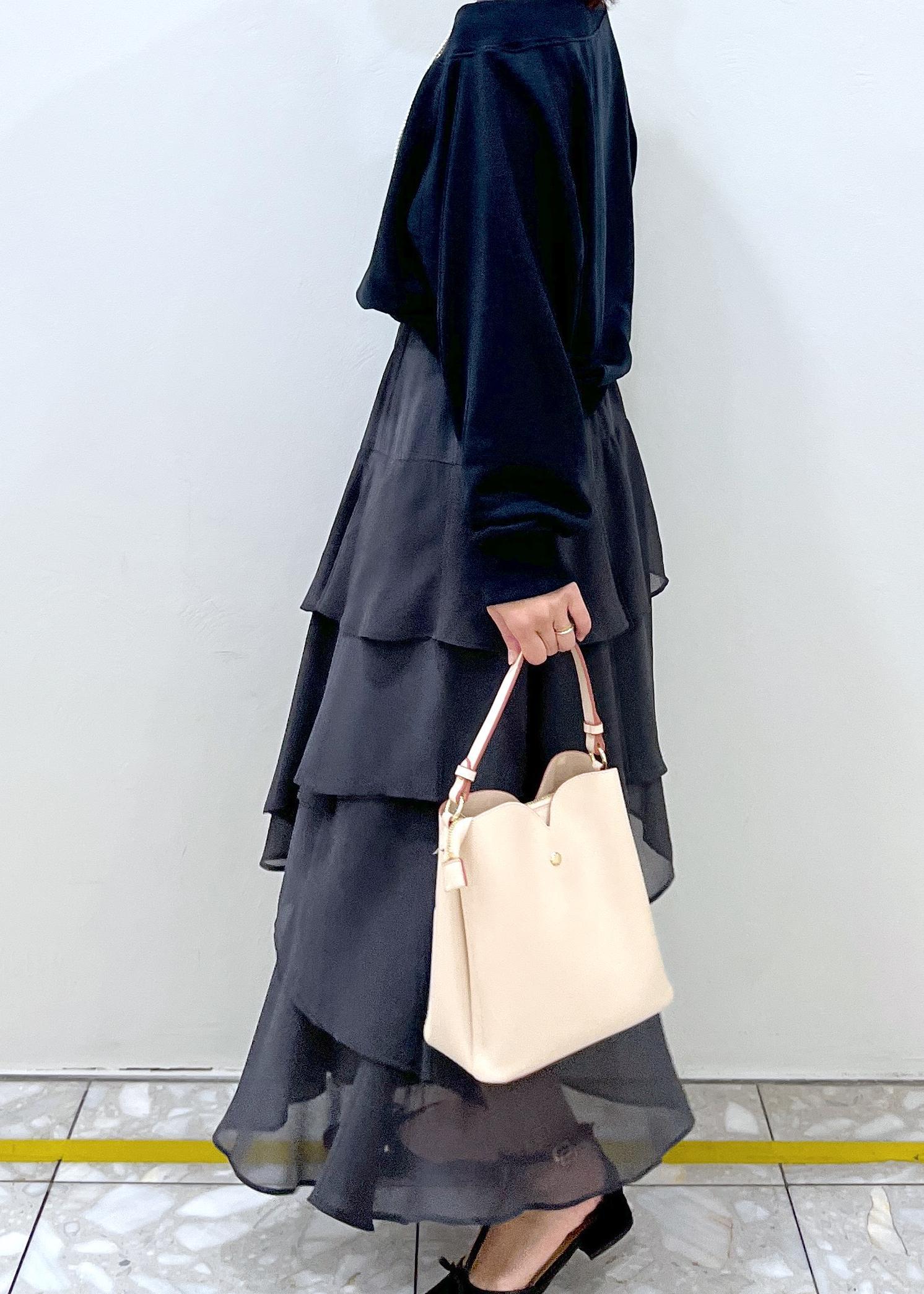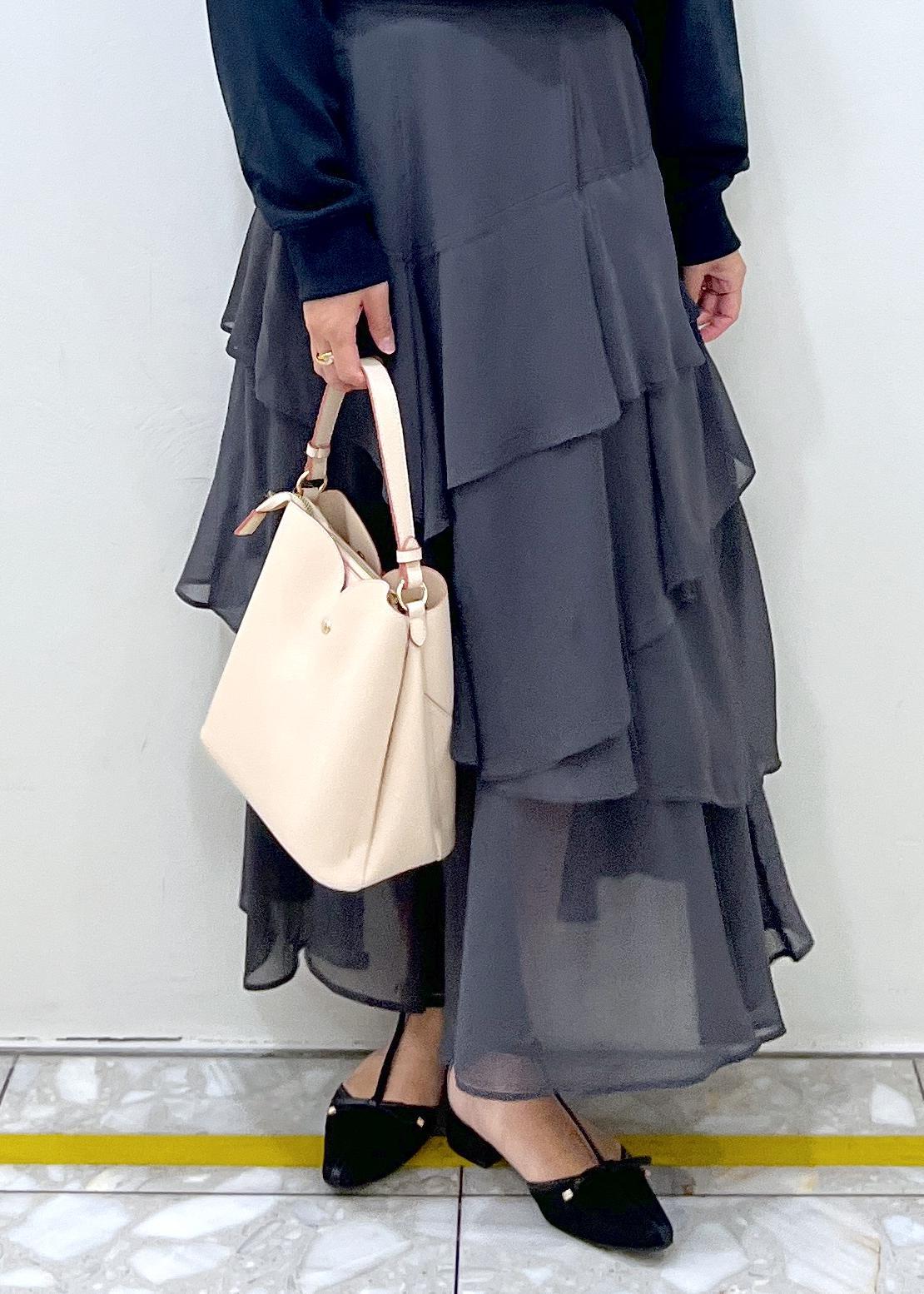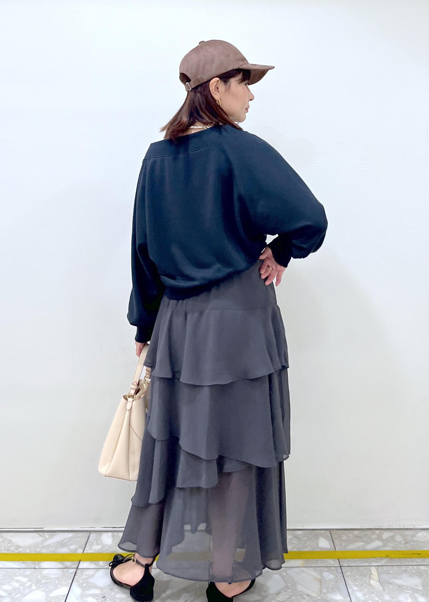 ポロのスウェットに大人っぽいティアードスカートを合わせてみました。パールのネックレスをポイントにして、スウェットとキャップがカジュアル見えしすぎないようにバランスを調節してみました!是非お試ししてみて下さい。