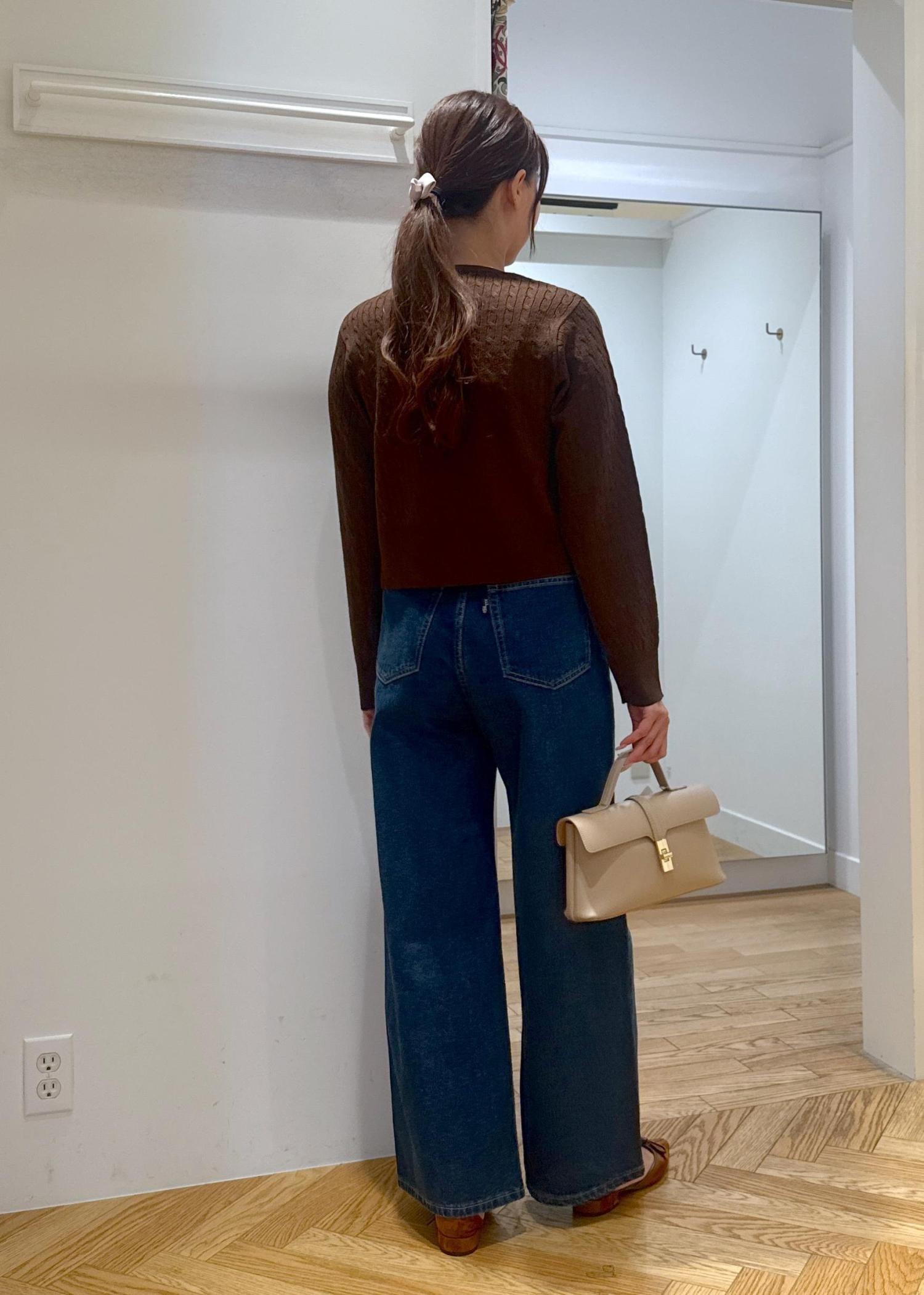 秋らしい茶色のカーディガンにスエードのインナーをインしておしゃれ感をプラス。POLOのストレートデニムを組み合わせて大人カジュアルコーデにしました。