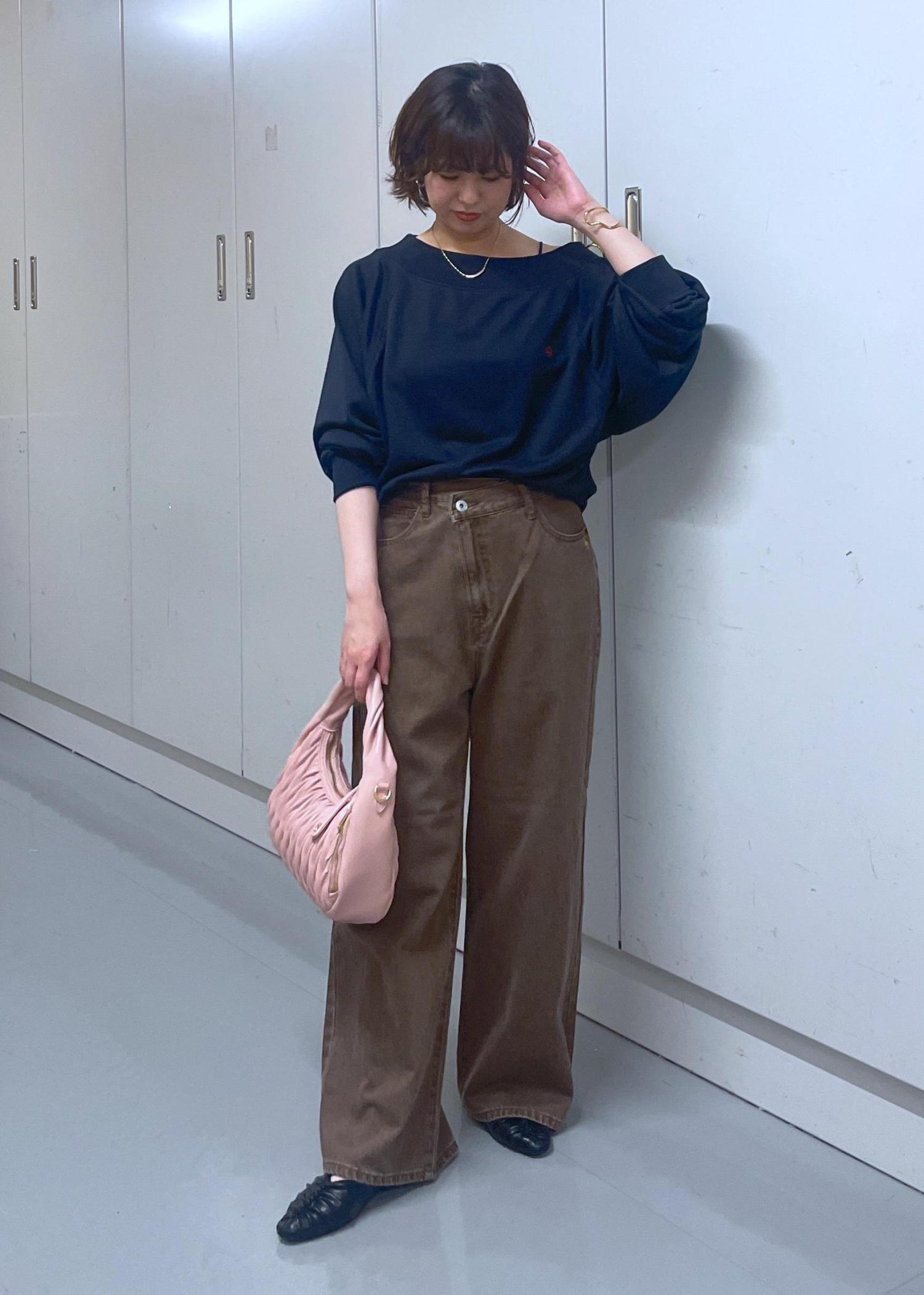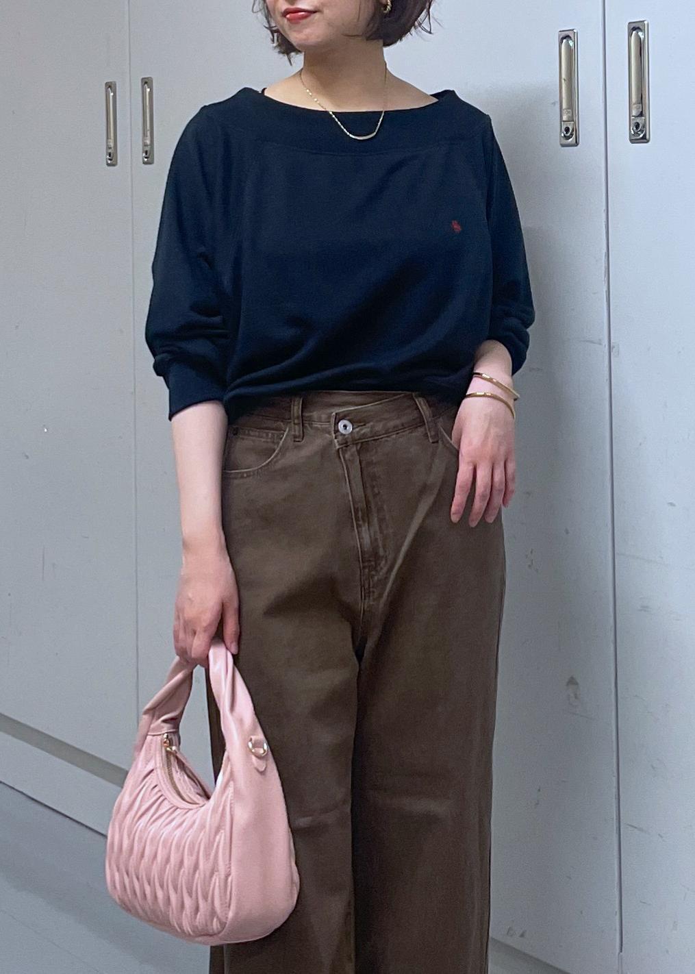 オフショルとしても着やすいボートネックタイプなので、女性らしい印象になります。