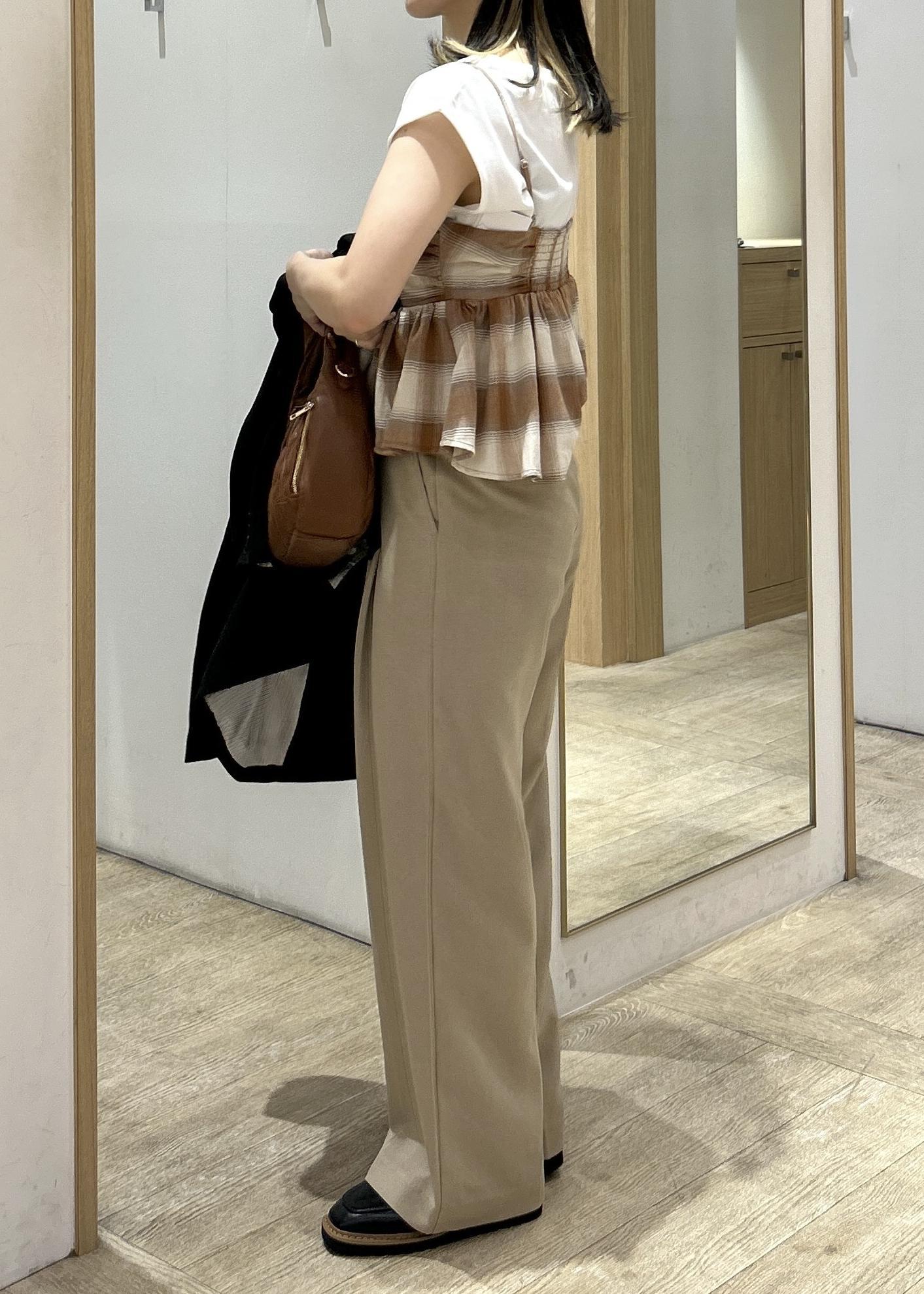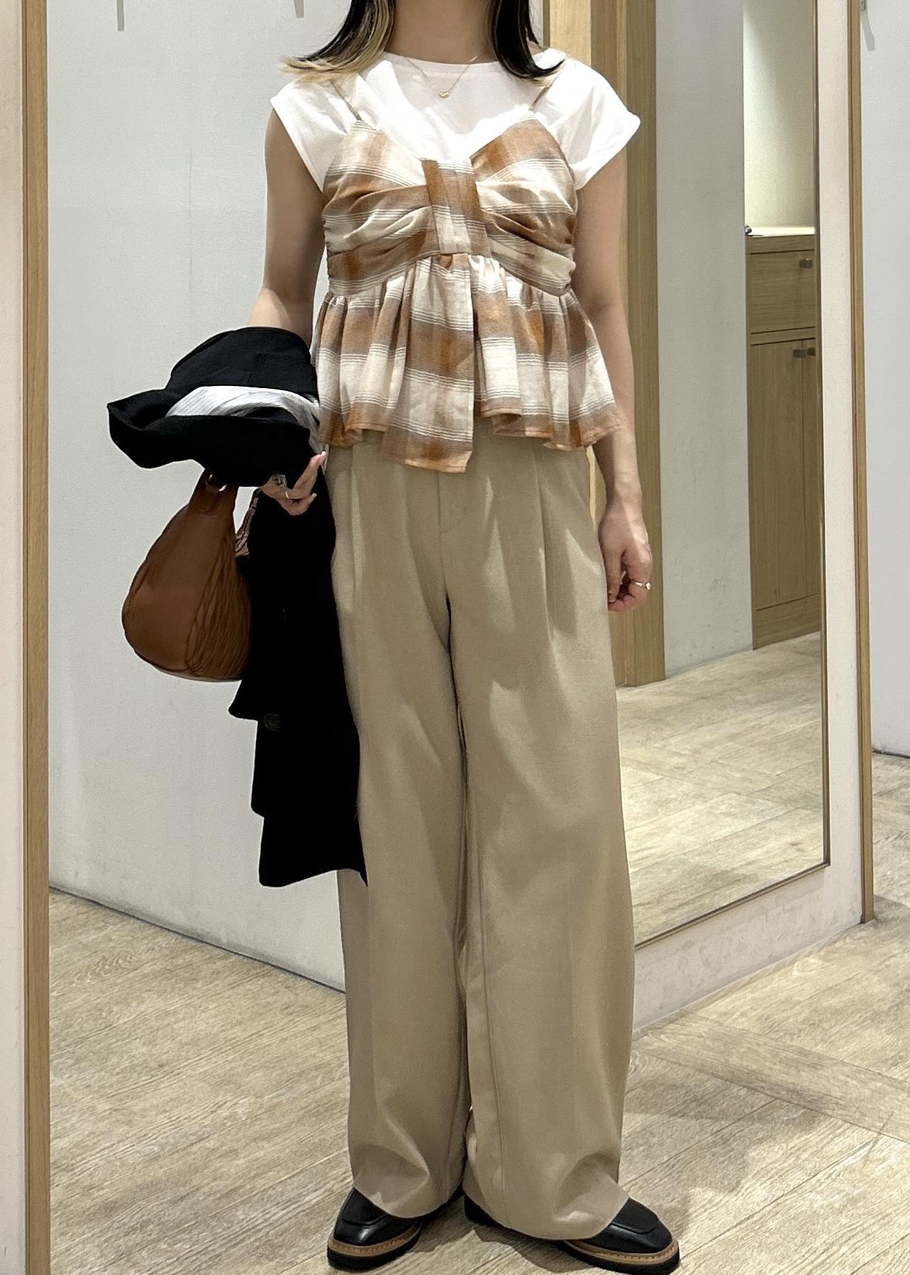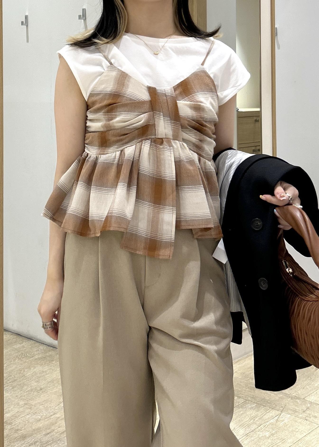 フレンチスリーブのTシャツは、秋っぽさをプラスするためにビスチェとあわせました☺︎