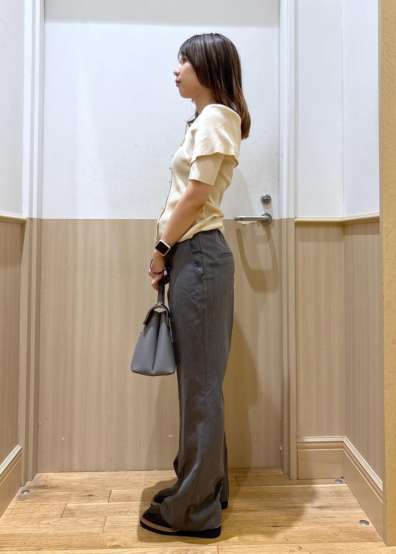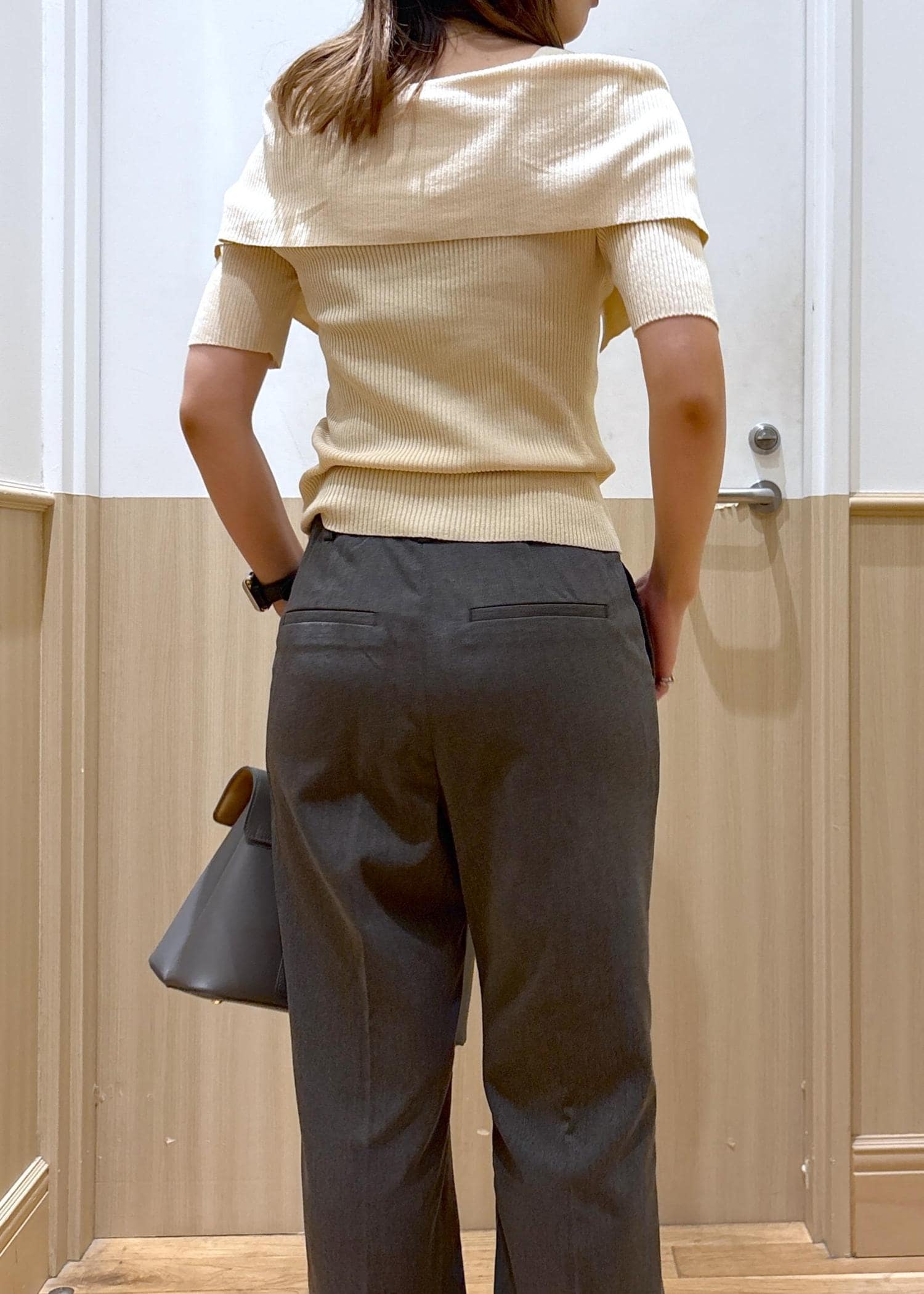トップスは首元が開きとお腹の若干のピタッと感で、ウェーブさんの得意な部分を強調して、やわらか体型になりがちな二の腕は大きめな襟でごまかいちゃいます!