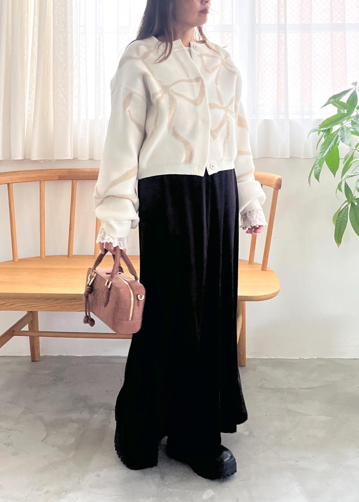 ニュアンス柄が映えるカーディガンを主役にした、抜け感たっぷりのスタイリング。