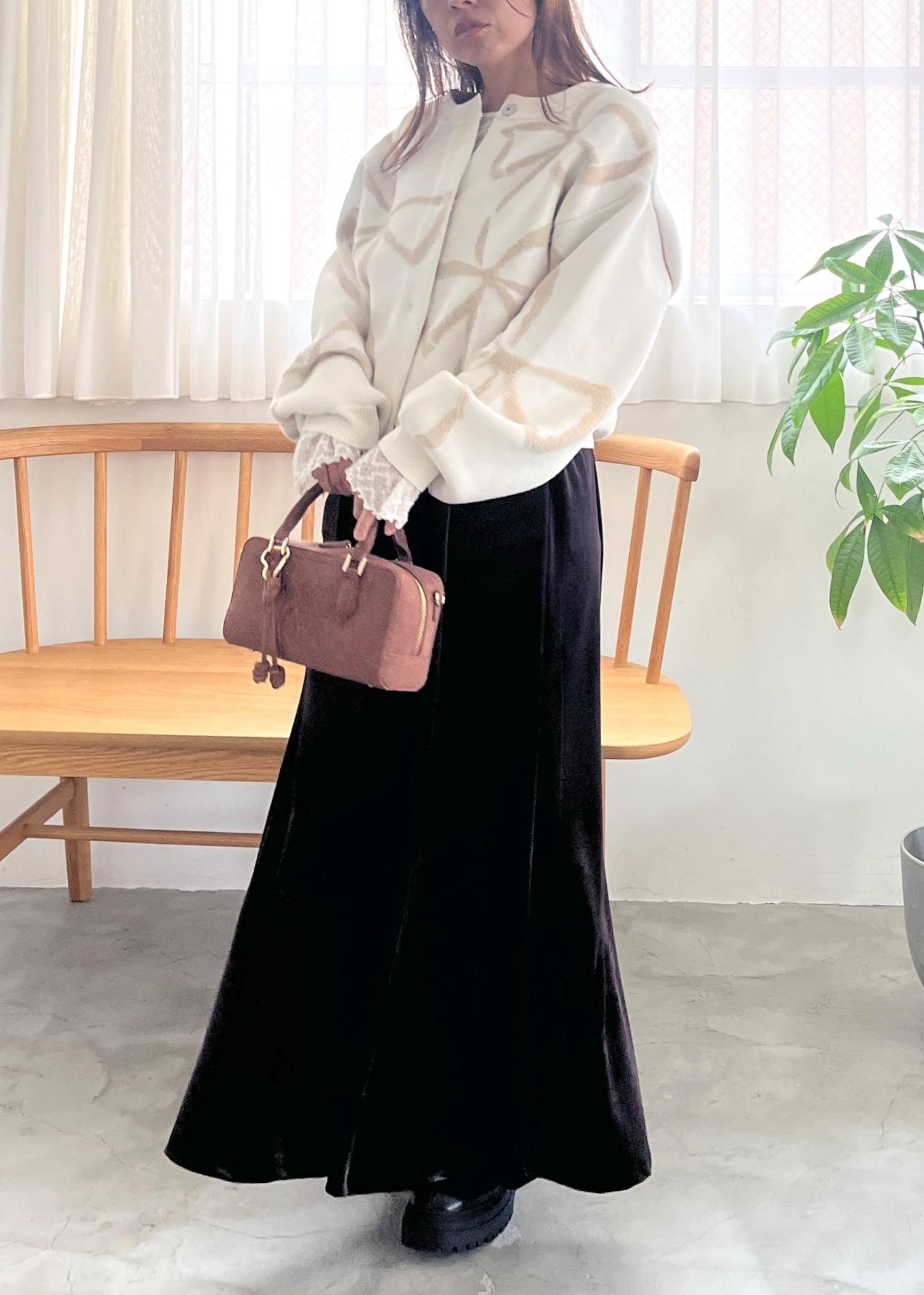 スッキリ見えするマーメイドスカートを合わせて女性らしいシルエットに。