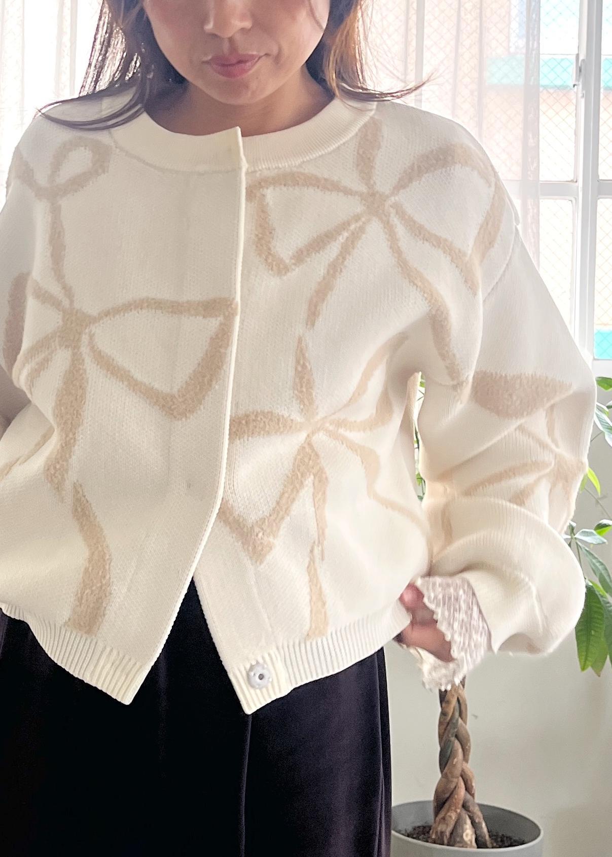 VISリボンモチーフジャガードカーディガン/イージーケアキナリ / F¥6,919レビュー152cmでFサイズ着用し、着丈は腰にかかるくらいの長すぎない丈。袖のボリュームがリラックス感たっぷりでリボンの刺繍も可愛い♡見た目で優勝カーデ!どのカラーも可愛くて、程よく肉厚なところも嬉しい。