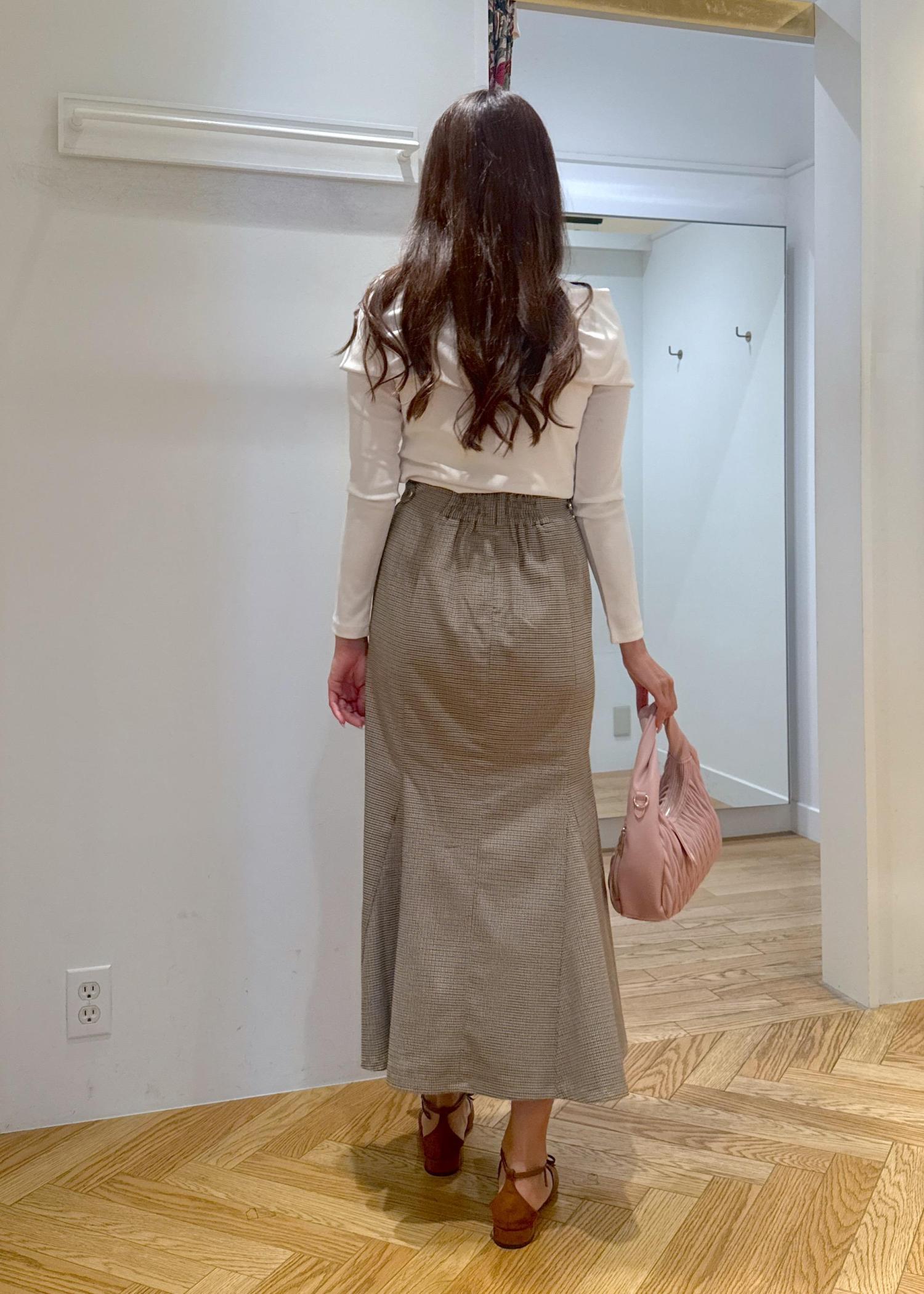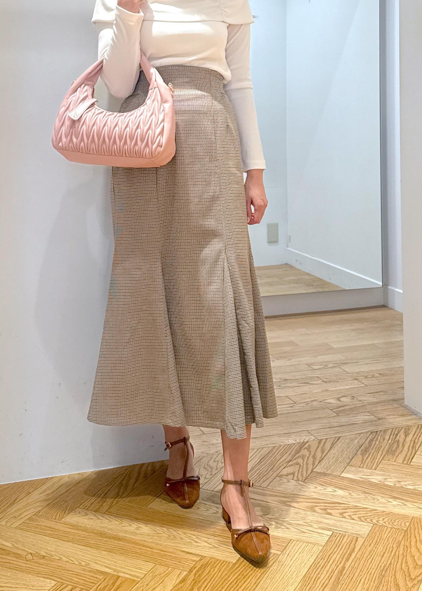 オフショルニットで大人っぽさをプラス。秋らしいチェックスカートを合わせて大人きれいめコーデに仕上げました。
