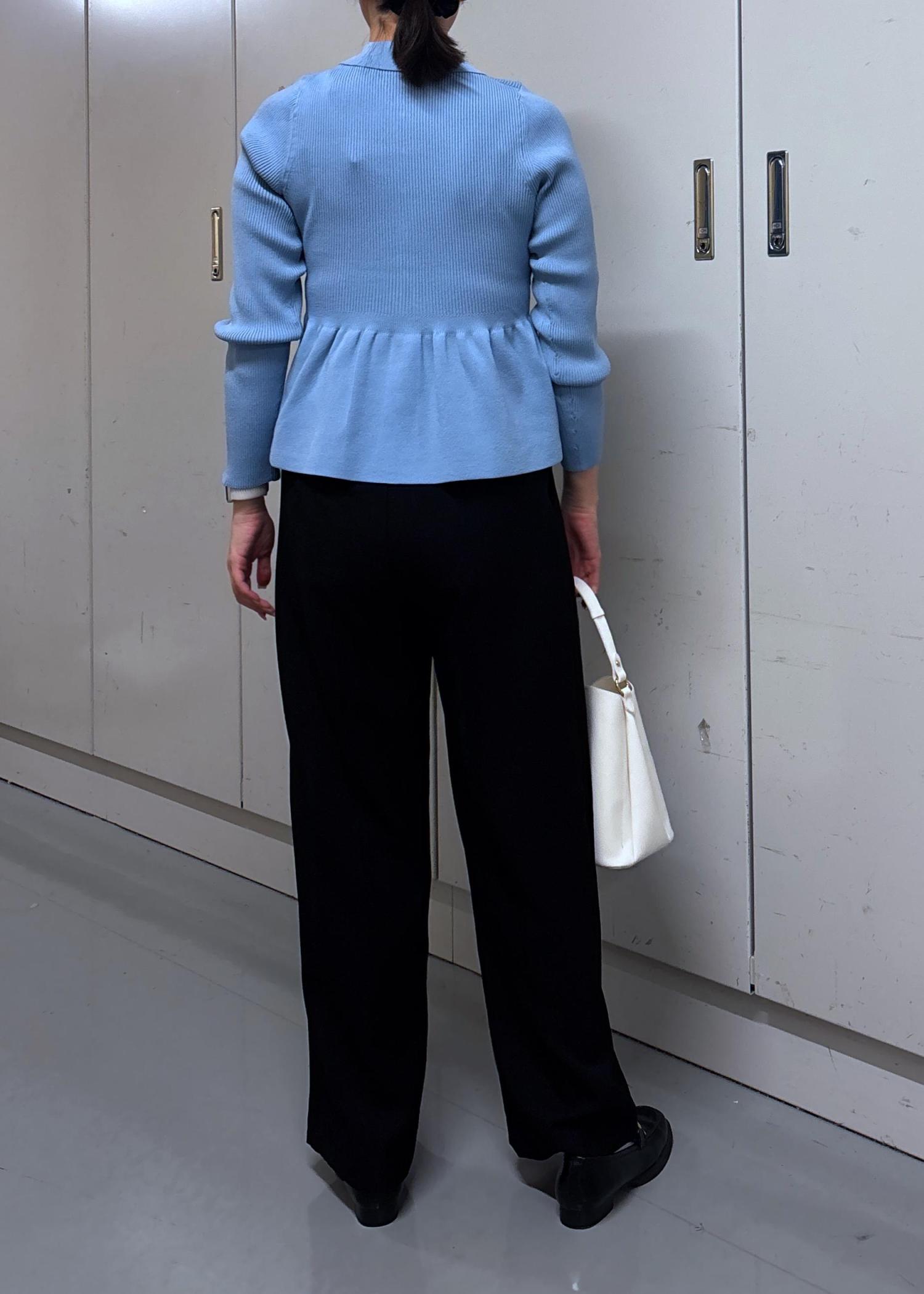 VIS【洗える】襟付きペプラムカーディガンブルー / F¥6,589レビュー着丈は短めでお尻かかるくらいですが、ペプラムのふんわりシルエットが短さを目立たなくしてくれます。リブニットなので、着心地は結構タイトです。本格的に寒くなる時期に一枚着で着れるので暖かいですよ!