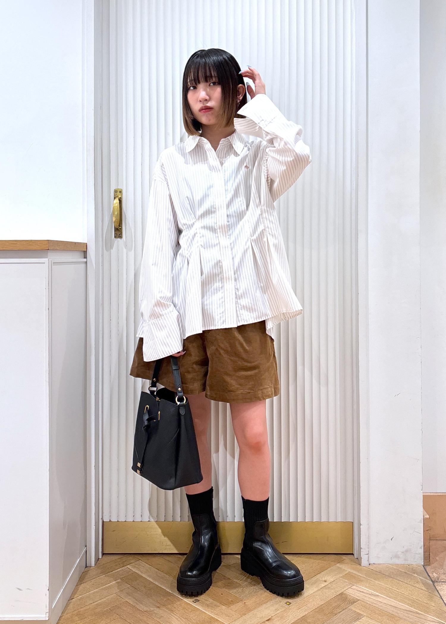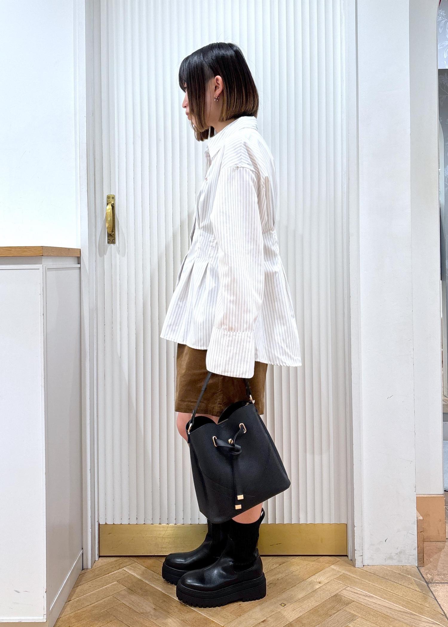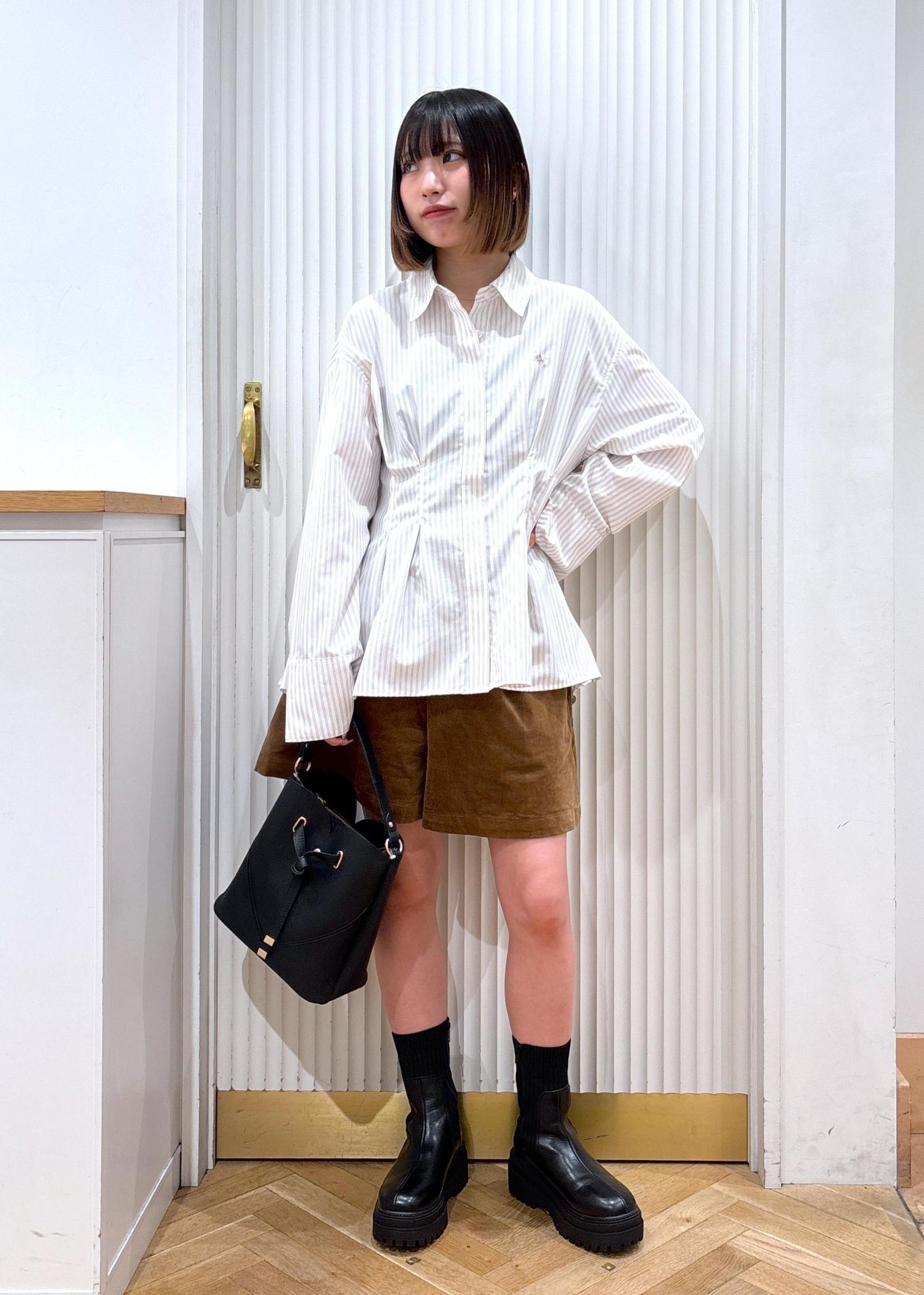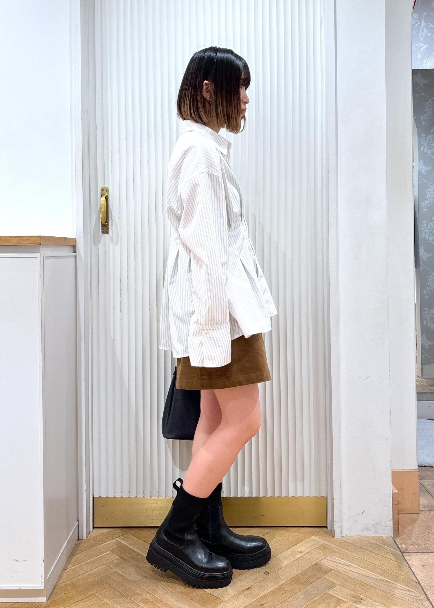 着丈が長めのブラウスはミニ丈を合わせてワンピース風に着ると可愛いです!小物は黒を入れることでコーディネートが締まります。足元は少しボリュームのあるショートブーツを合わせることで全体的にバランスが取れます。