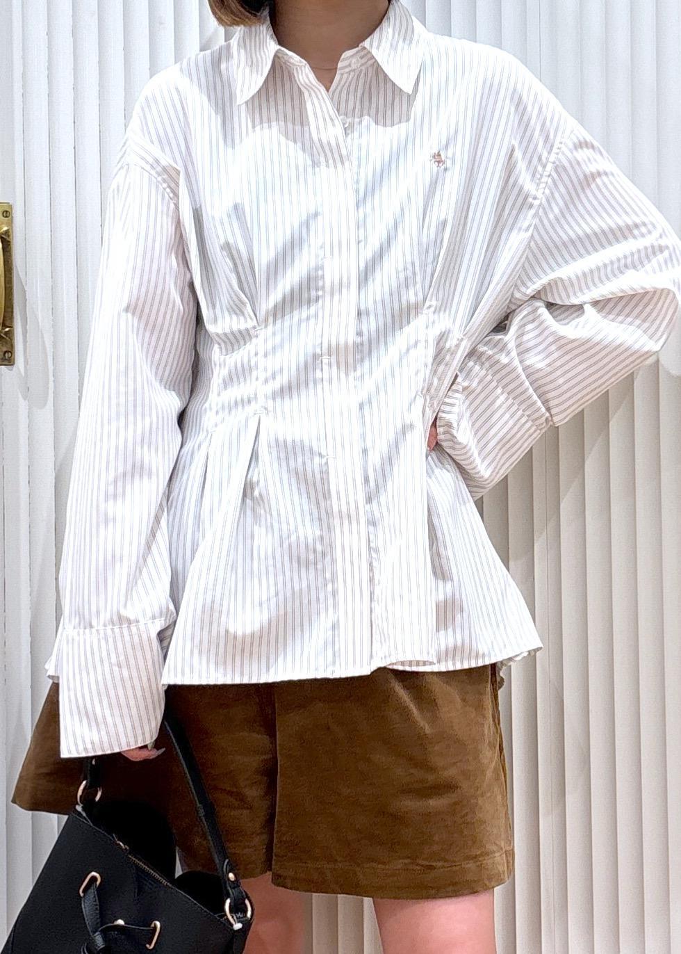 VIS【POLOBCS】VIS別注ウエストタックフレアシャツホワイト系 / F¥6,930レビュー153センチ着用で後ろはヒップがすっぽり隠れる着丈で、手の甲まで隠れる袖丈でした。全体的に大きか感じますがウエストのタックがシルエットを綺麗に見せてくれるので着せられてる感がでないです。