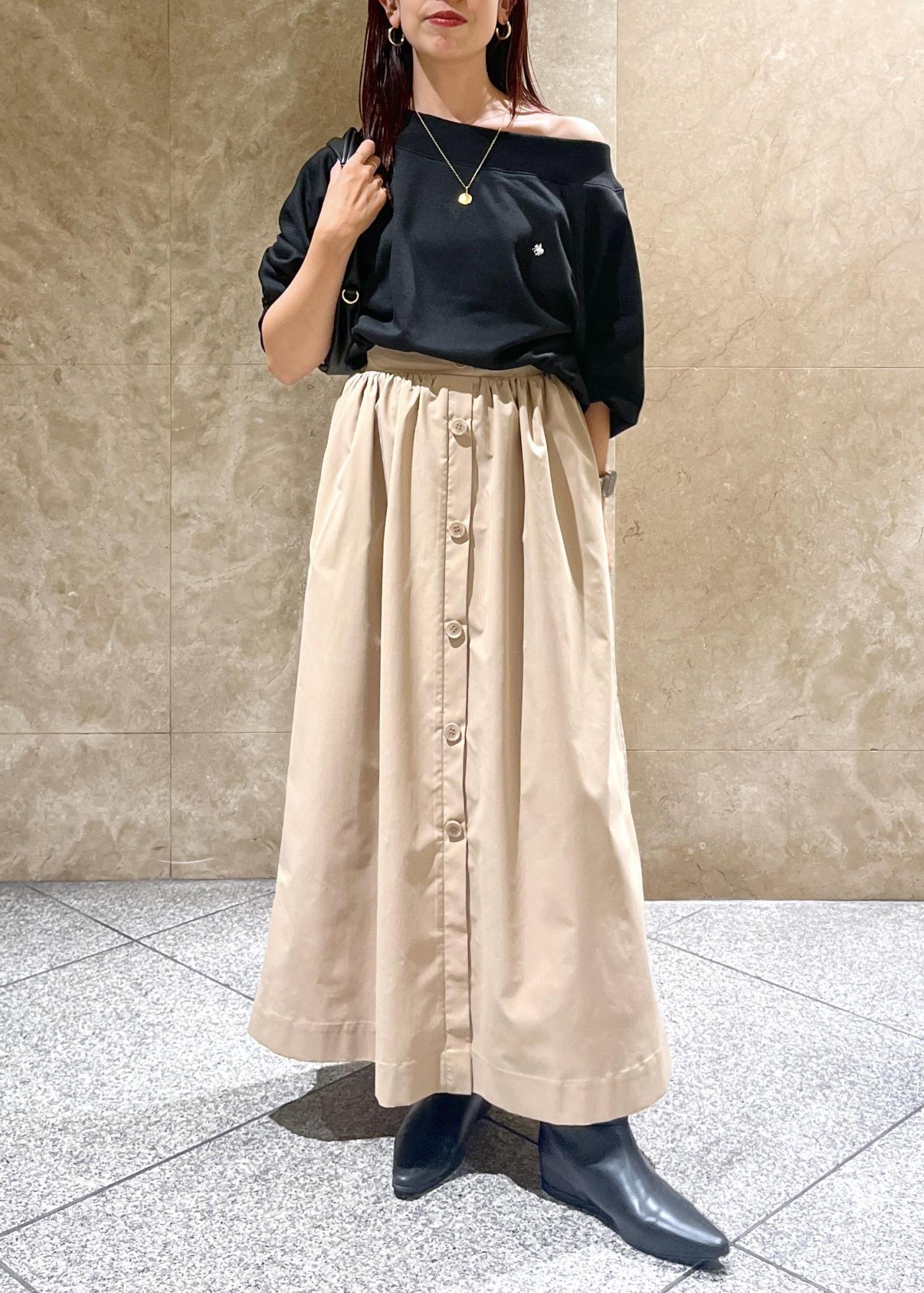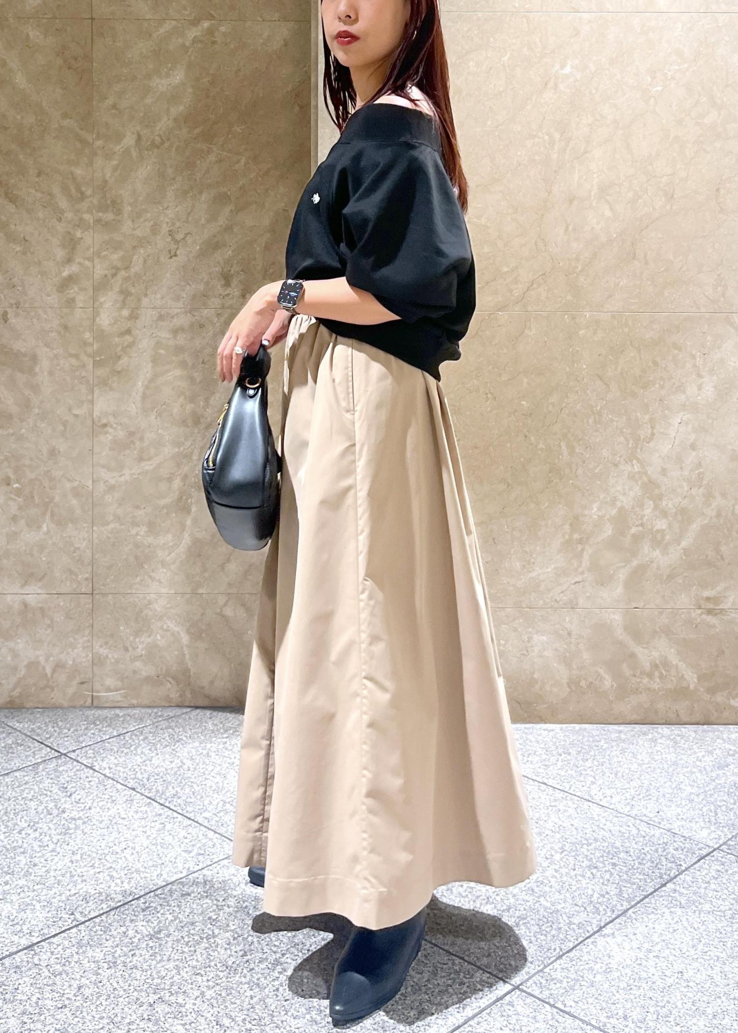 合わせるのは女性らしさたっぷりのロングフレアスカートで。