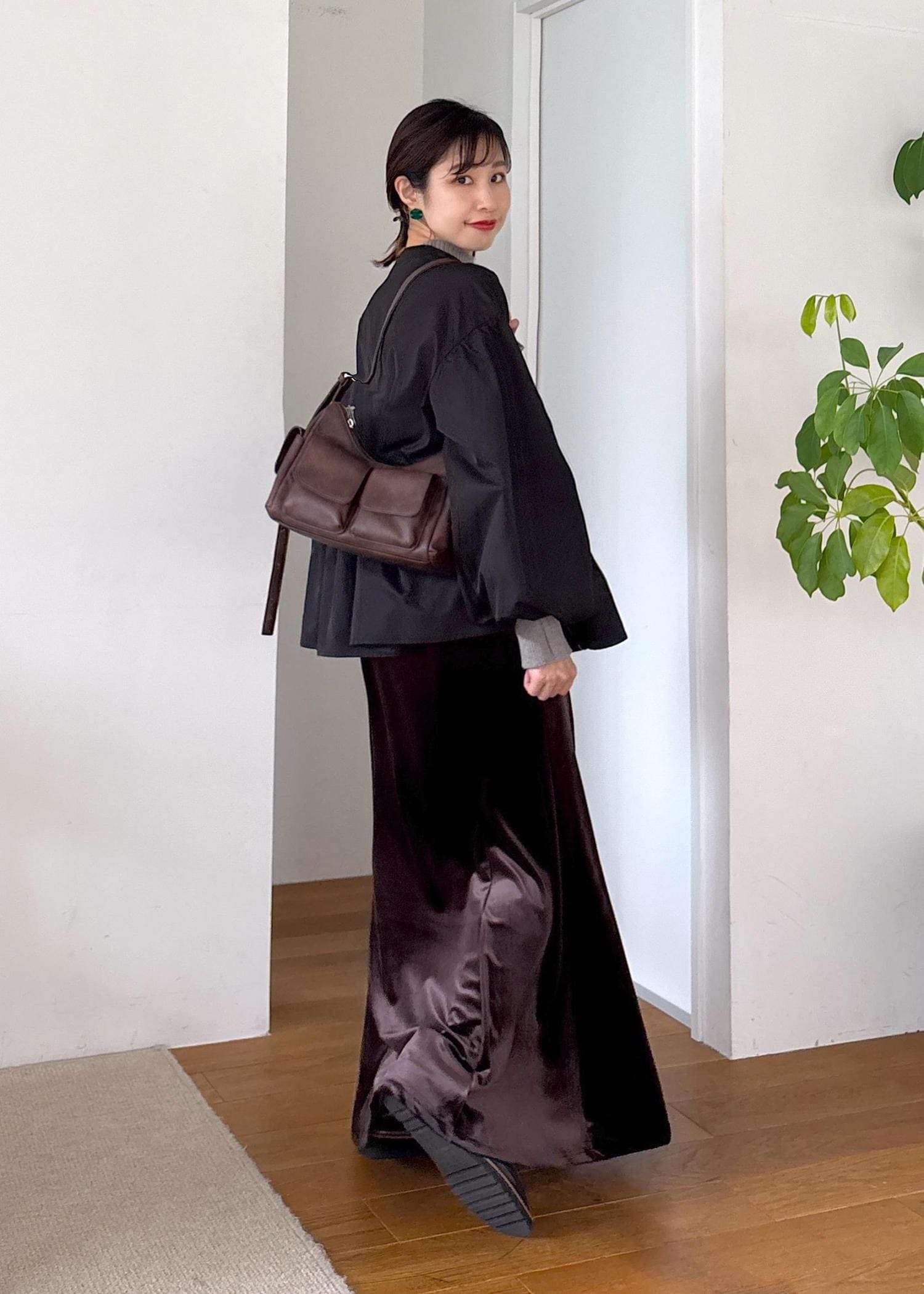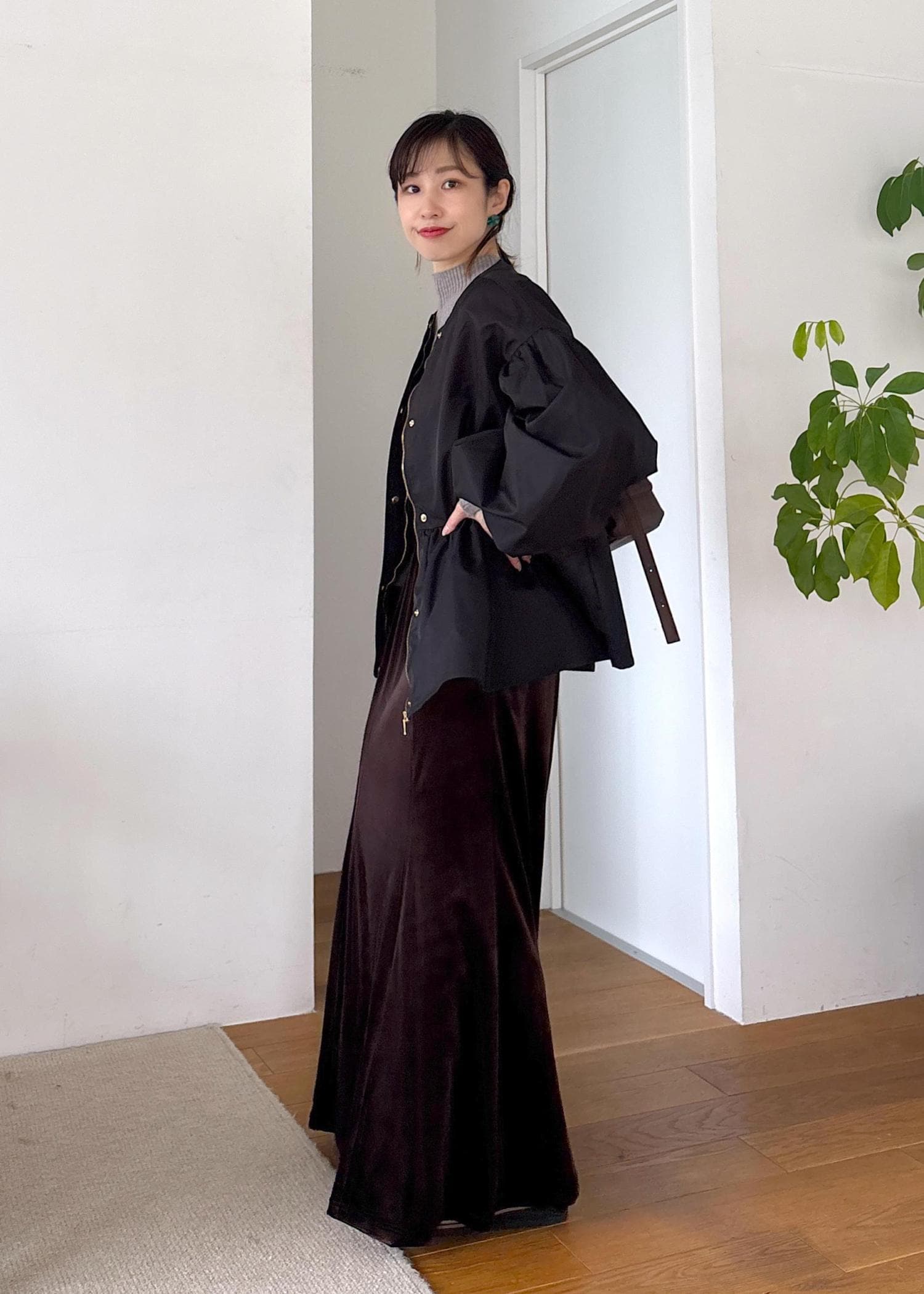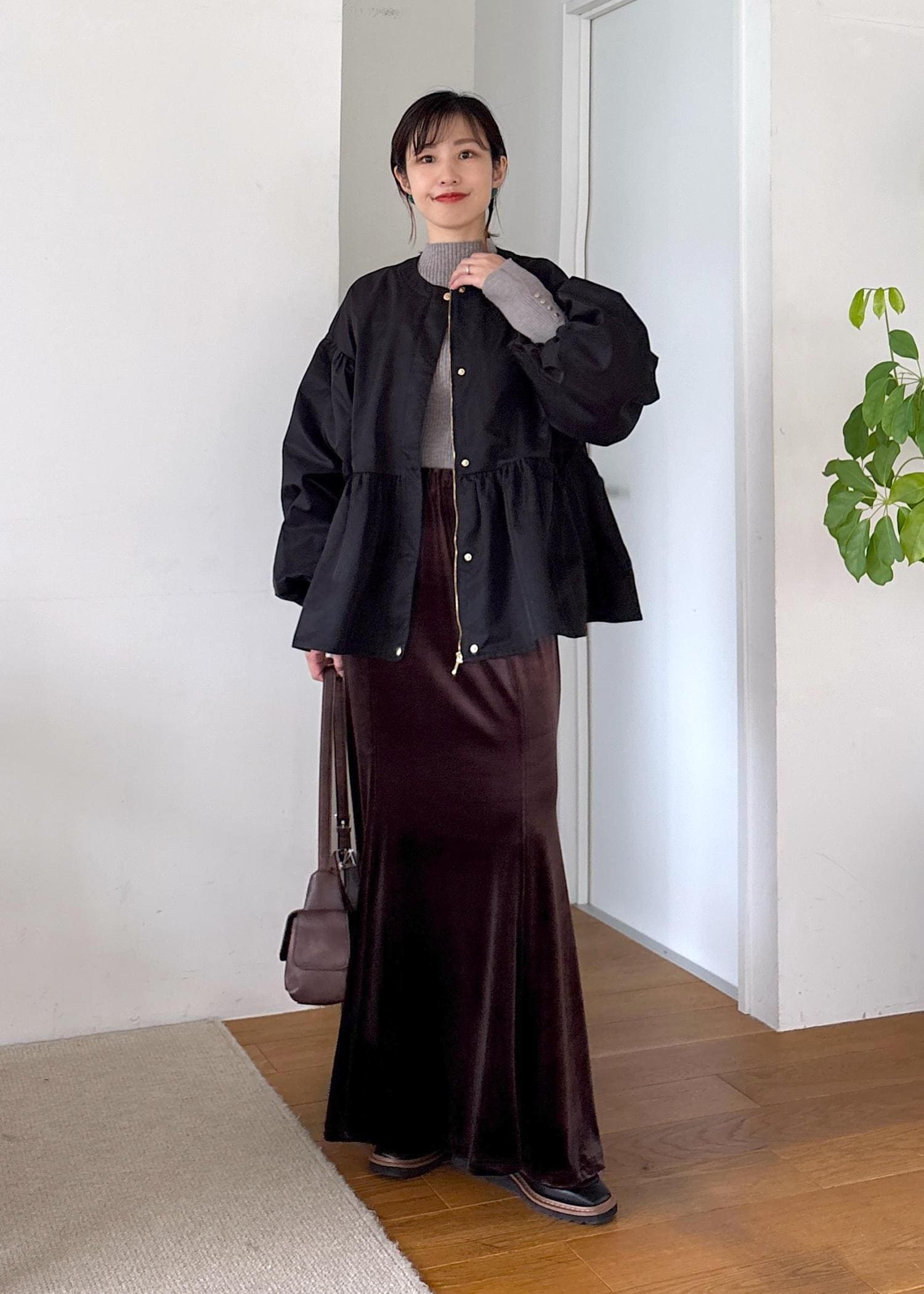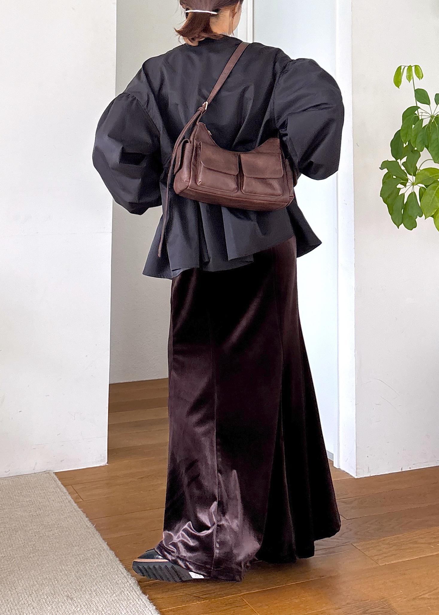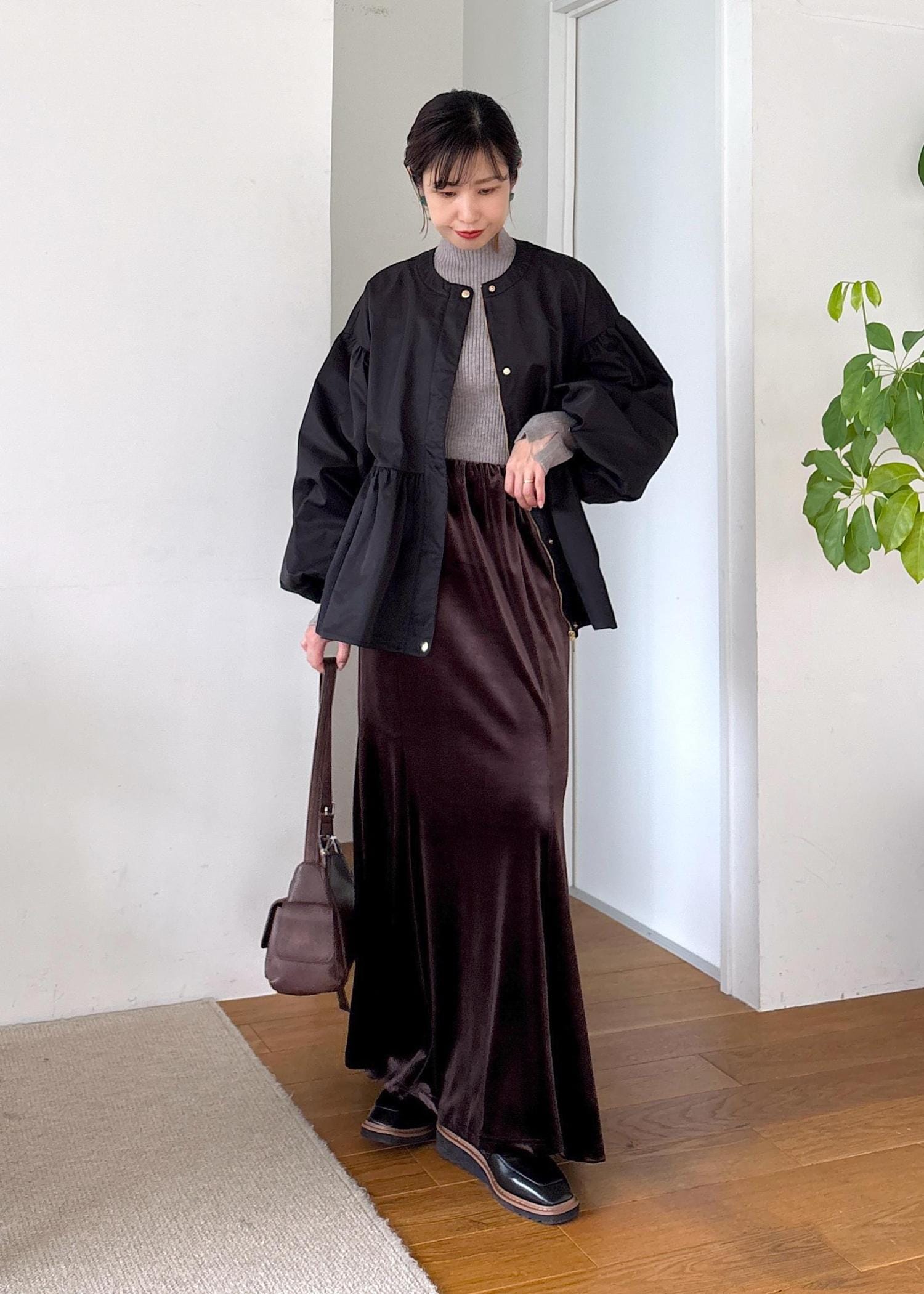 バルーンシルエットが今年らしい秋ブルゾンをポイントに、リブニットとベロアスカートで合わせたきれいめカジュアル♪ブルゾンはほどよいハリがありつつ緩やかな軽めで今から秋と長く着回せます。胸下切り替えのバルーンと袖ボリュームデザインが女性らしい印象に◎シックな色味でまとめた秋の大人カジュアルコーデ。