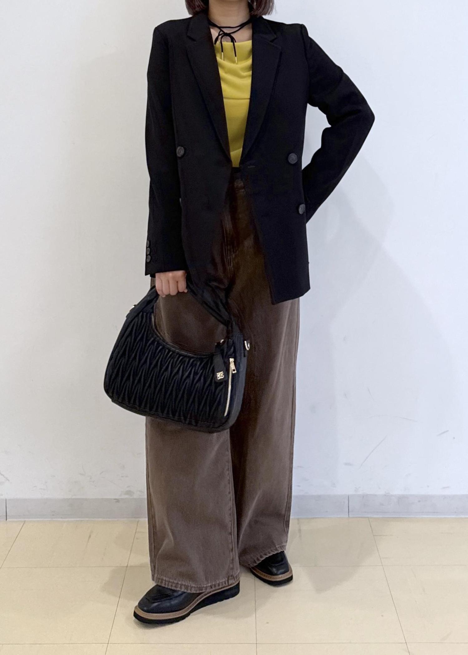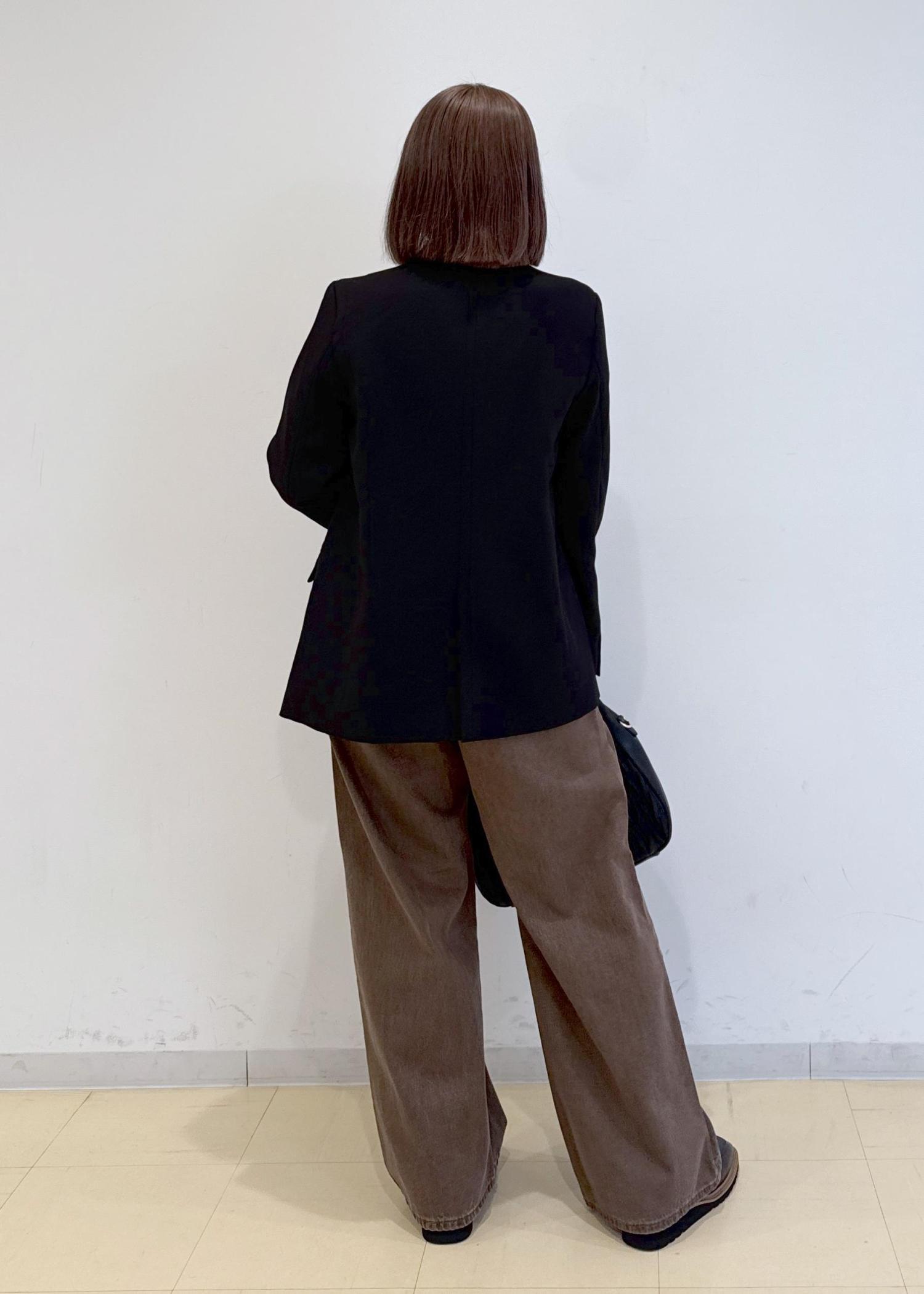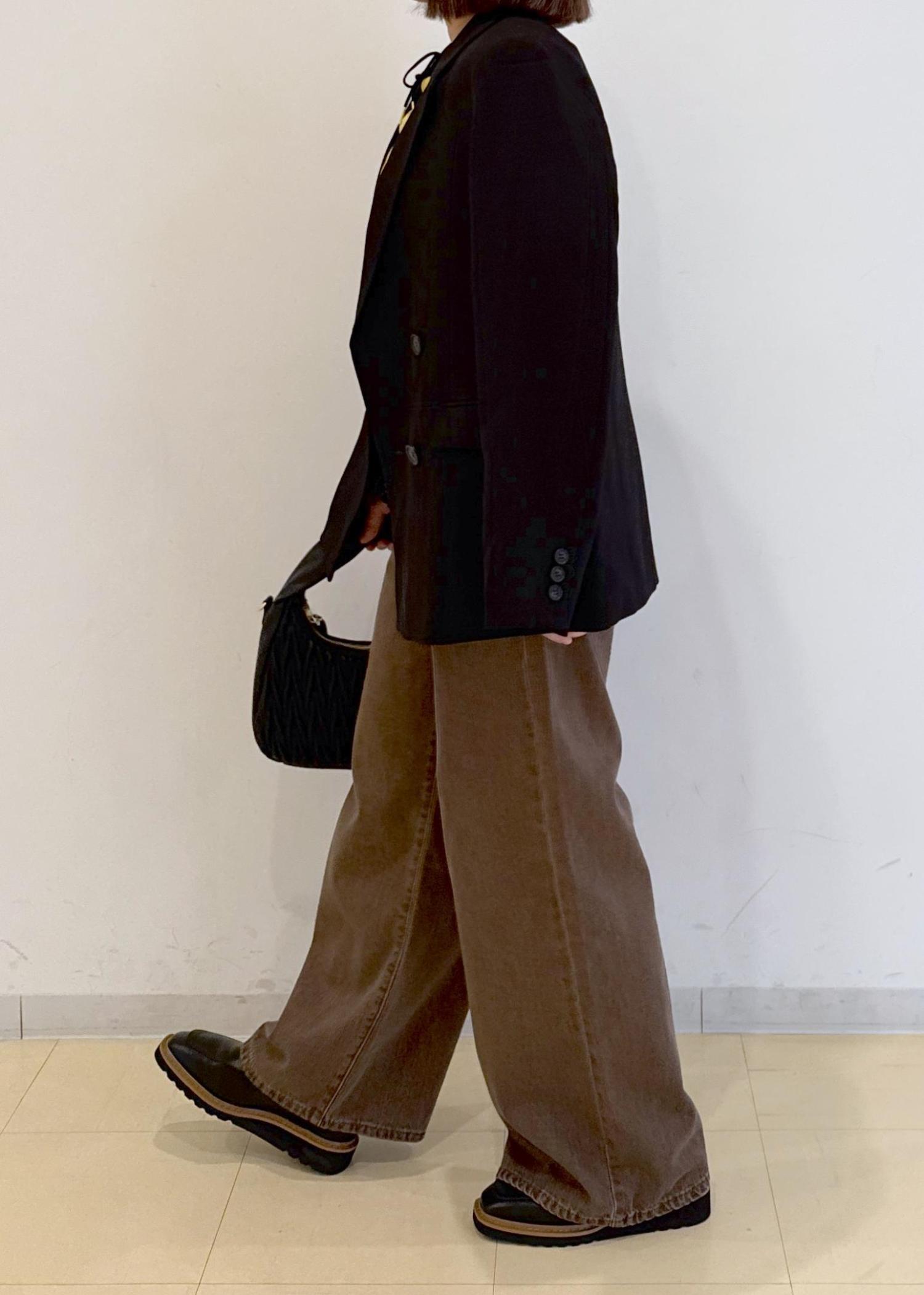 ブラウンのデニムに黒のジャケットを合わせた大人カジュアルなコーディネートにしました♩