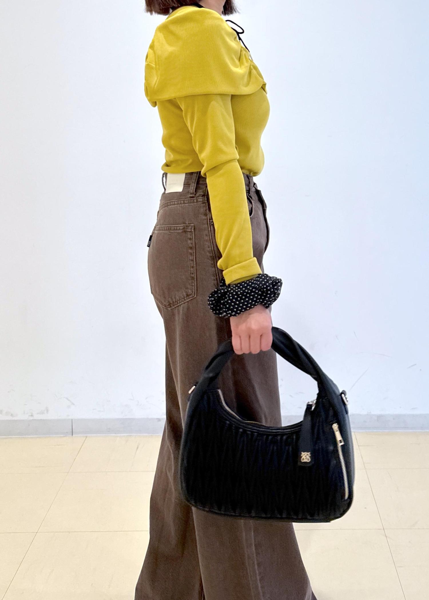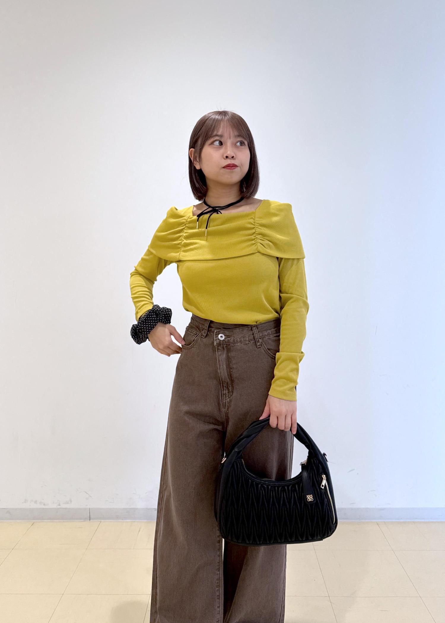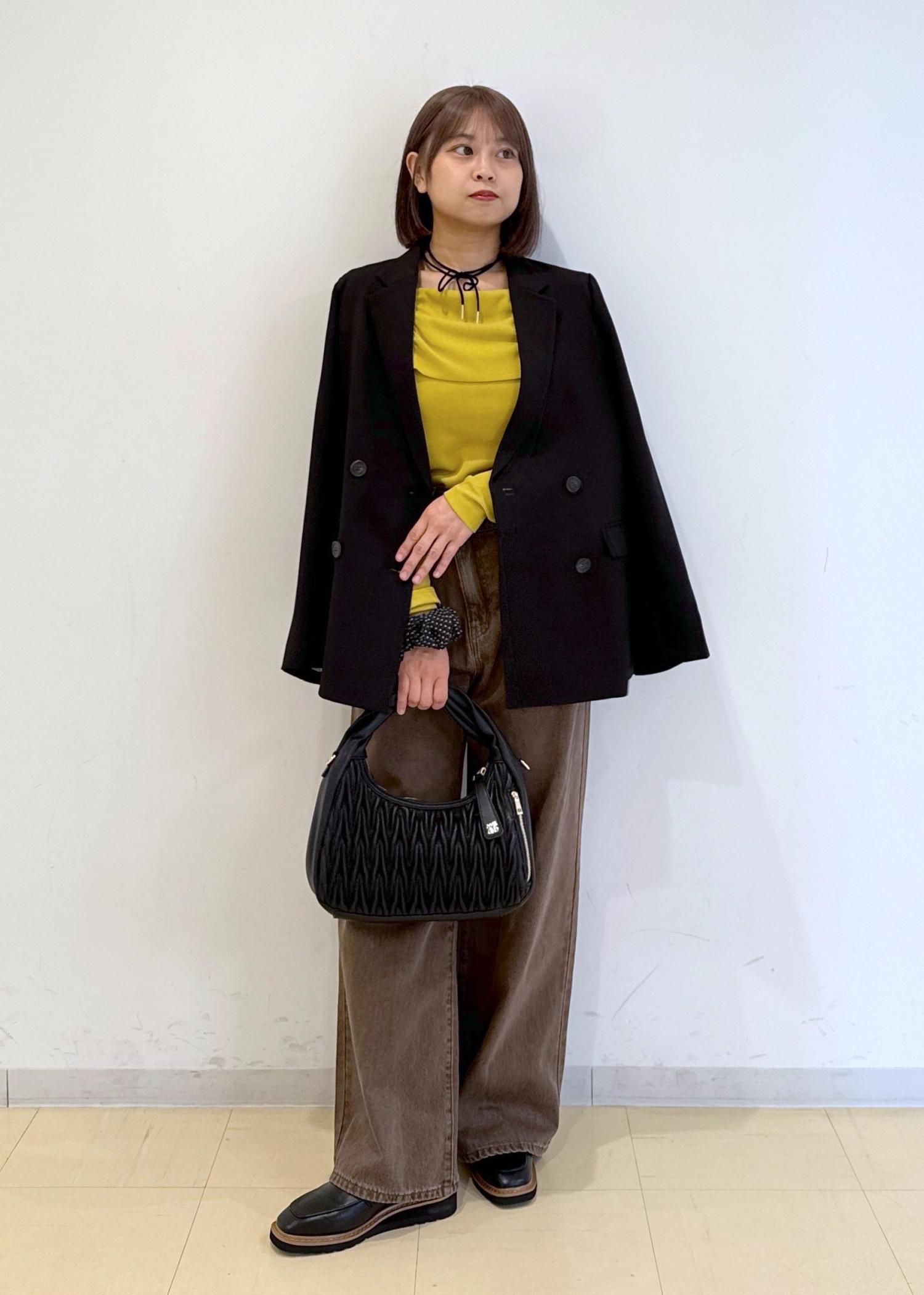 インナーに差し色としてマスタードカラーを合わせることで全体的に暗く重めにまとめられたコーディネートに明るさをプラスしました!