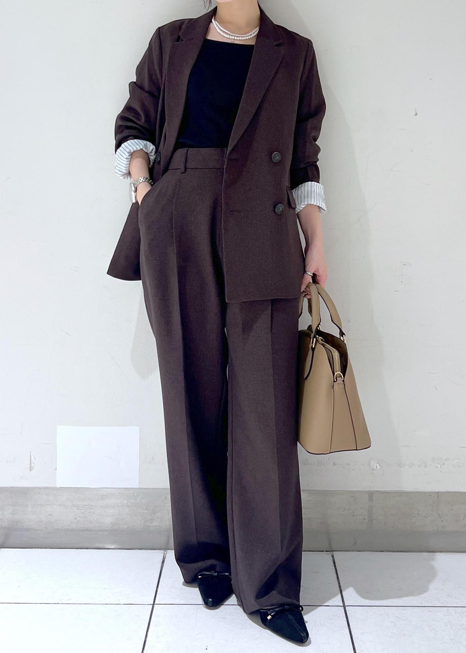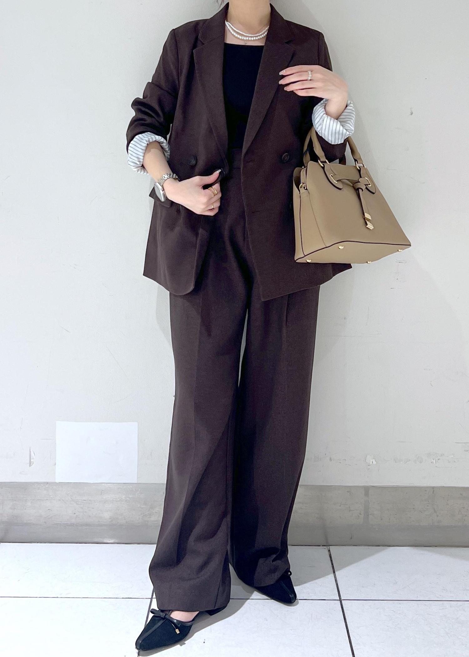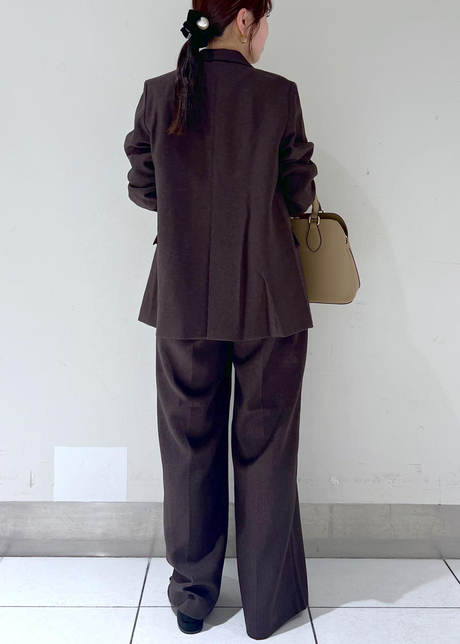 ダークブラウンが大人っぽいこなれ感がでてセットアップで着てもオシャレですし、プライベートではデニムなどと合わせても良さそうですね♫