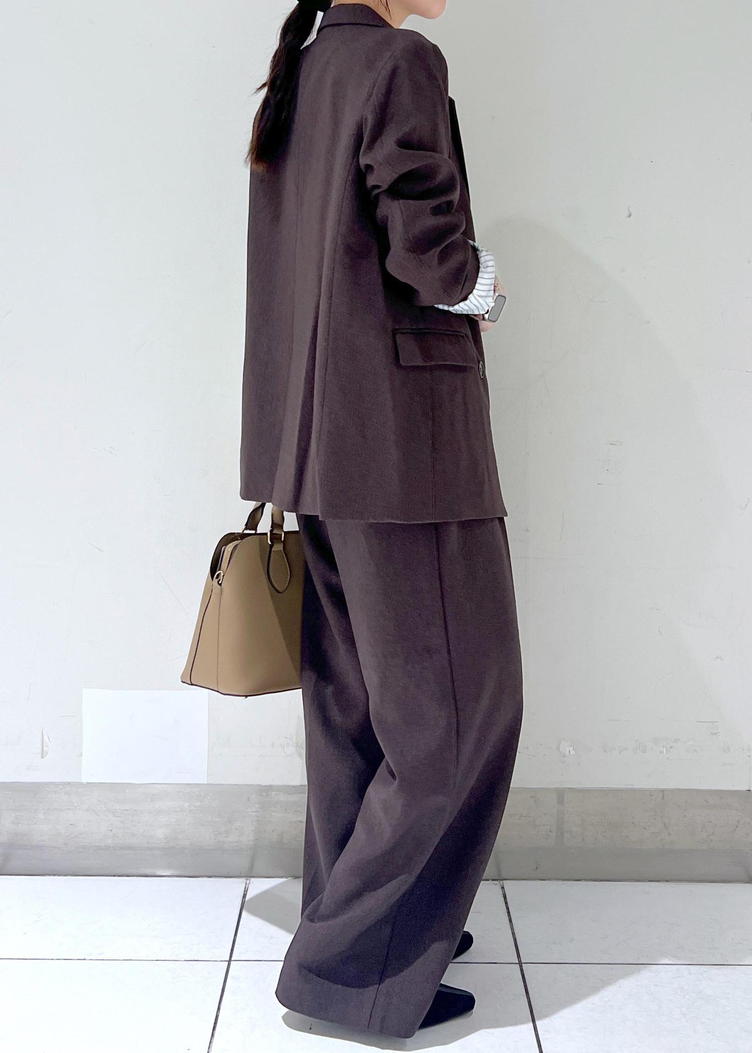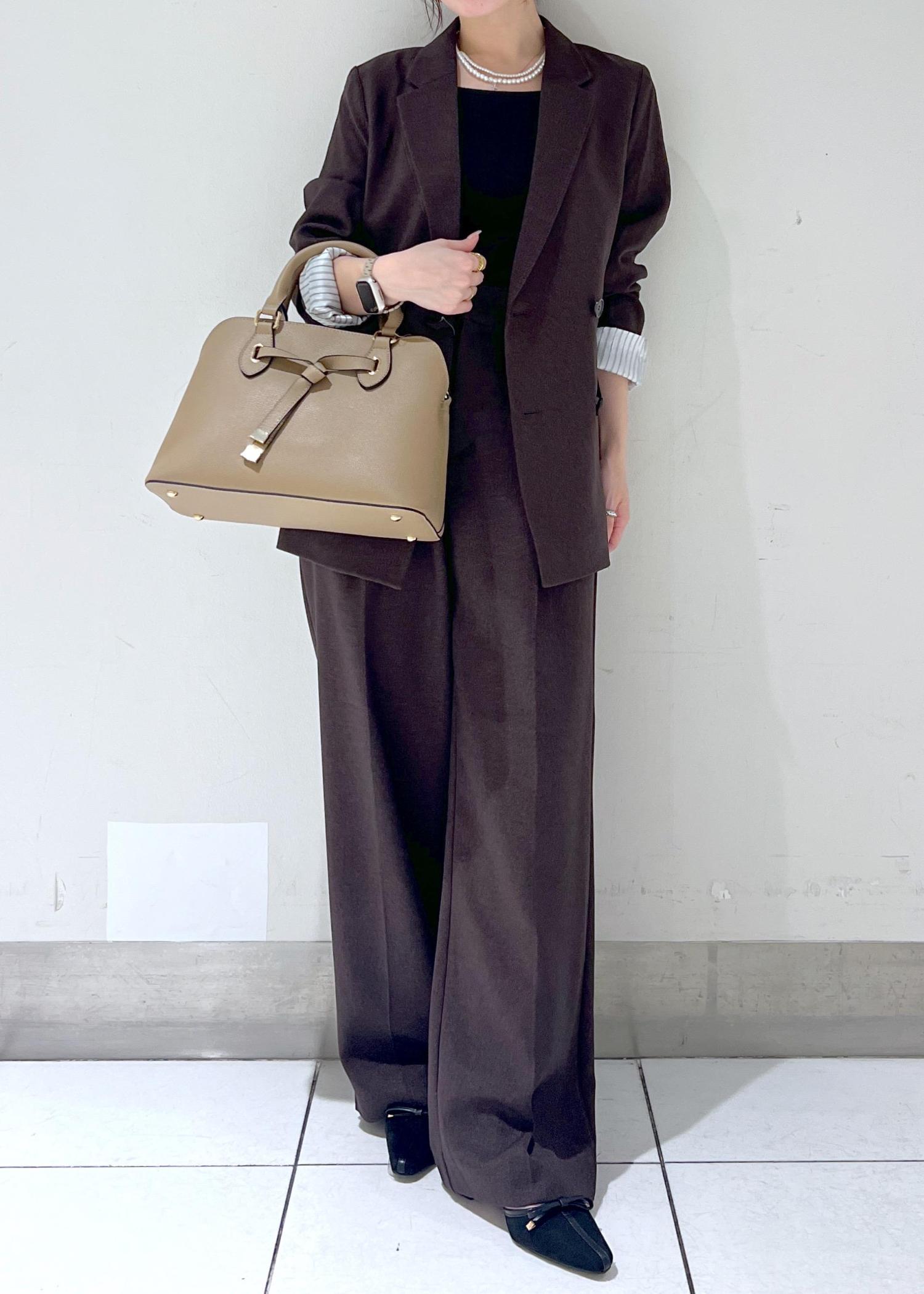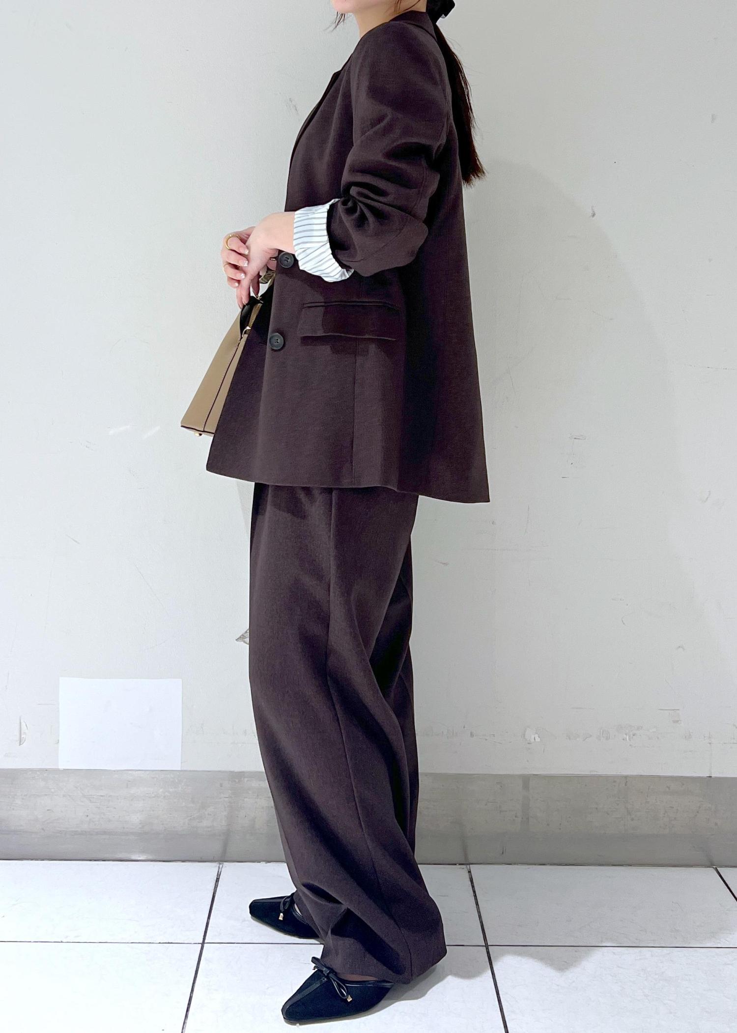 ダークブラウンが大人っぽいこなれ感がでてセットアップで着てもオシャレですし、プライベートではデニムなどと合わせても良さそうですね♫