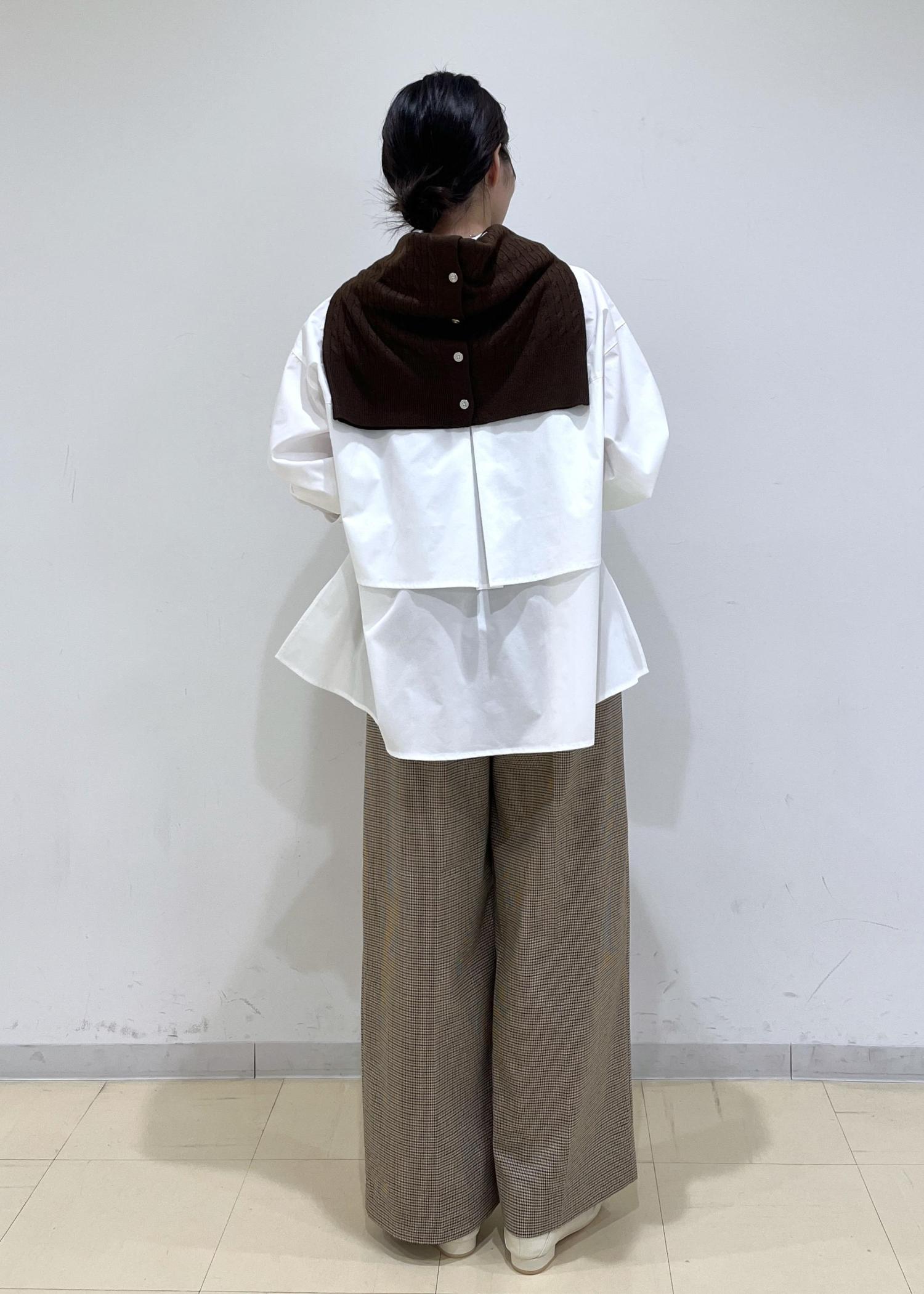 シャツで爽やかさを残しつつ、brownのニットカーデで