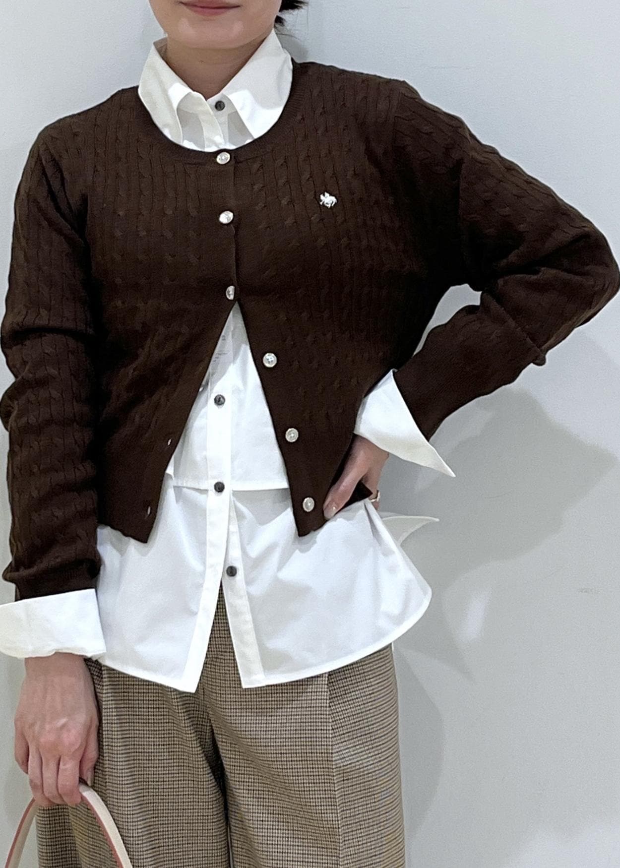 VIS【POLO BCS】VIS別注ミニケーブルノーカラーニットカーディガンダークブラウン / F¥6,930レビュー軽くて着やすいケーブルニットカーディガンです。