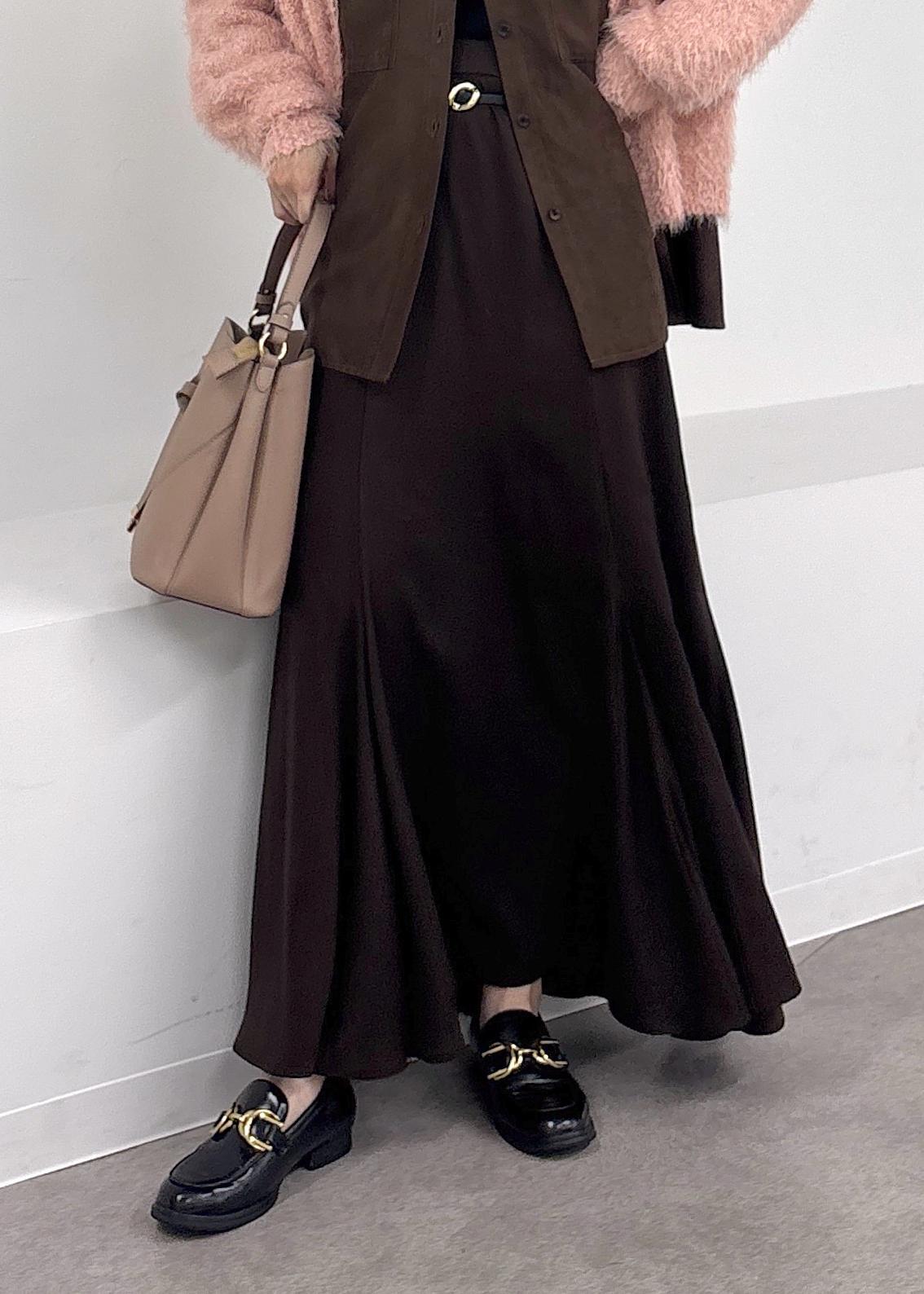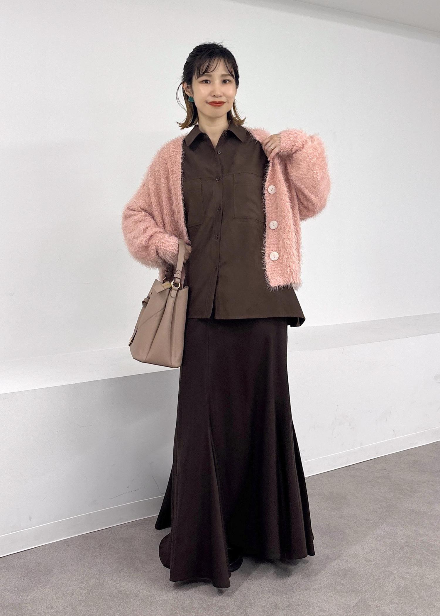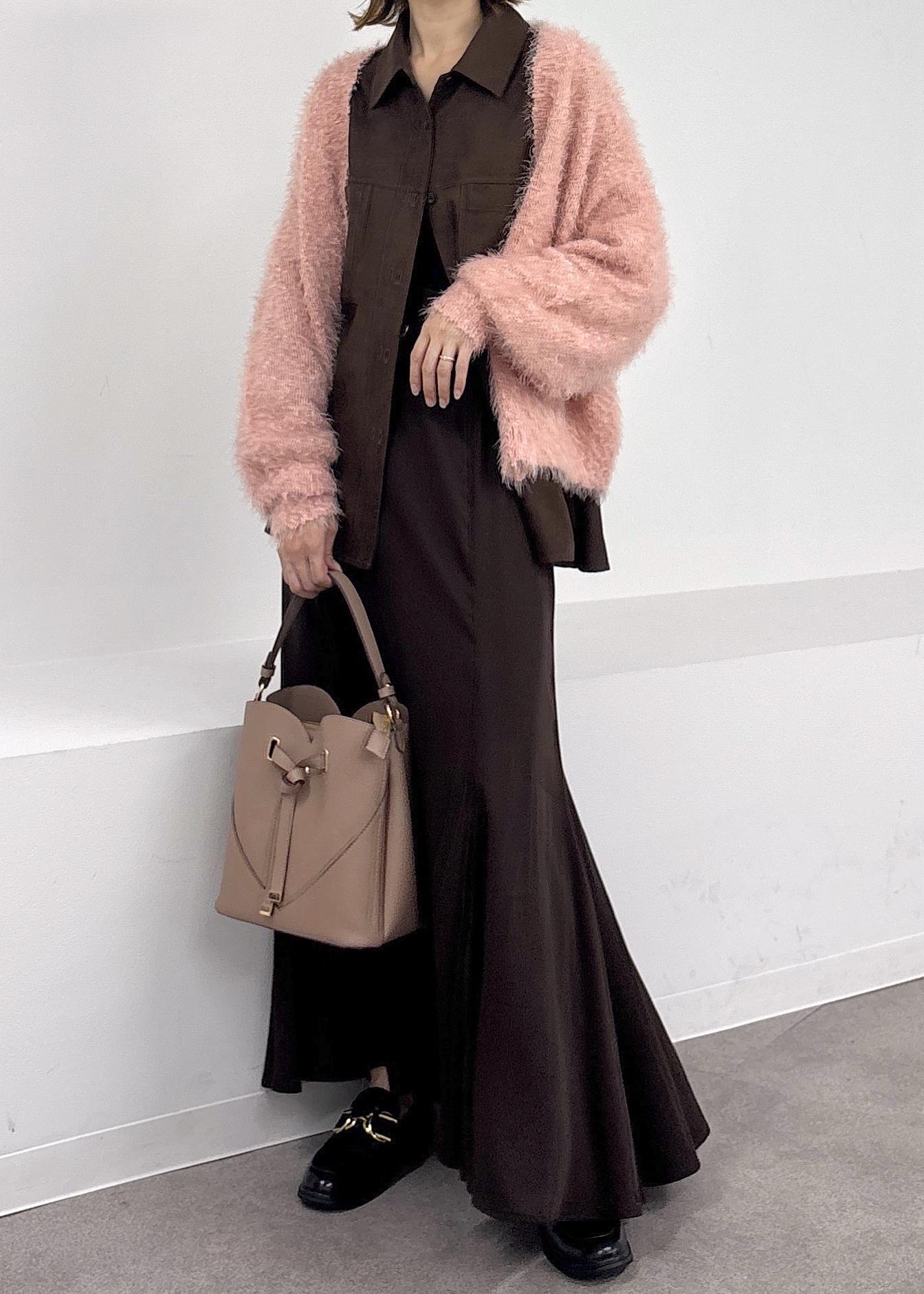 ふわふわ柔らかなピンクのカーディガンをポイントに、スエード調のシャツ、マーメイドスカートはブラウンでまとめたカジュアルスタイル♪今年らしいブラウンはピンクのカーディガンを合わせることで女性らしい印象に◎ラフすぎないようローファーでスッキリと。秋のお出かけにオススメの大人カジュアルコーデ。