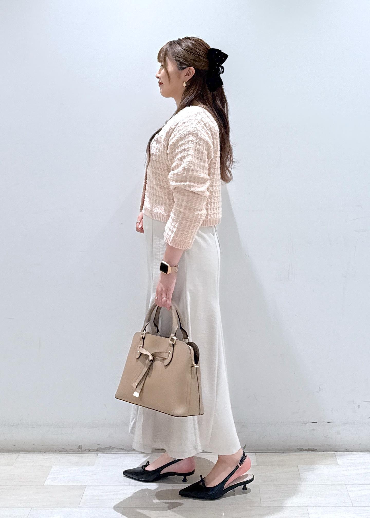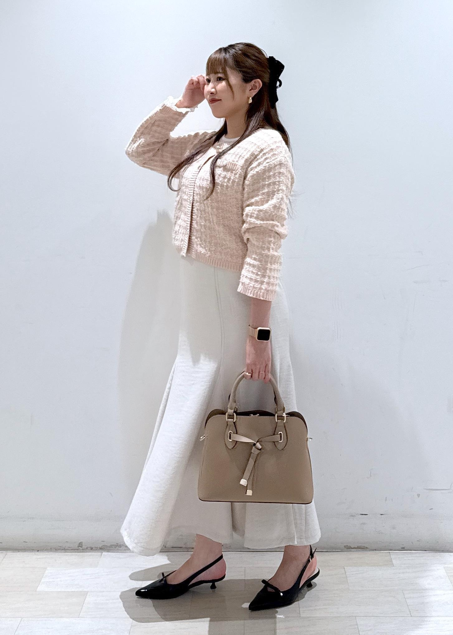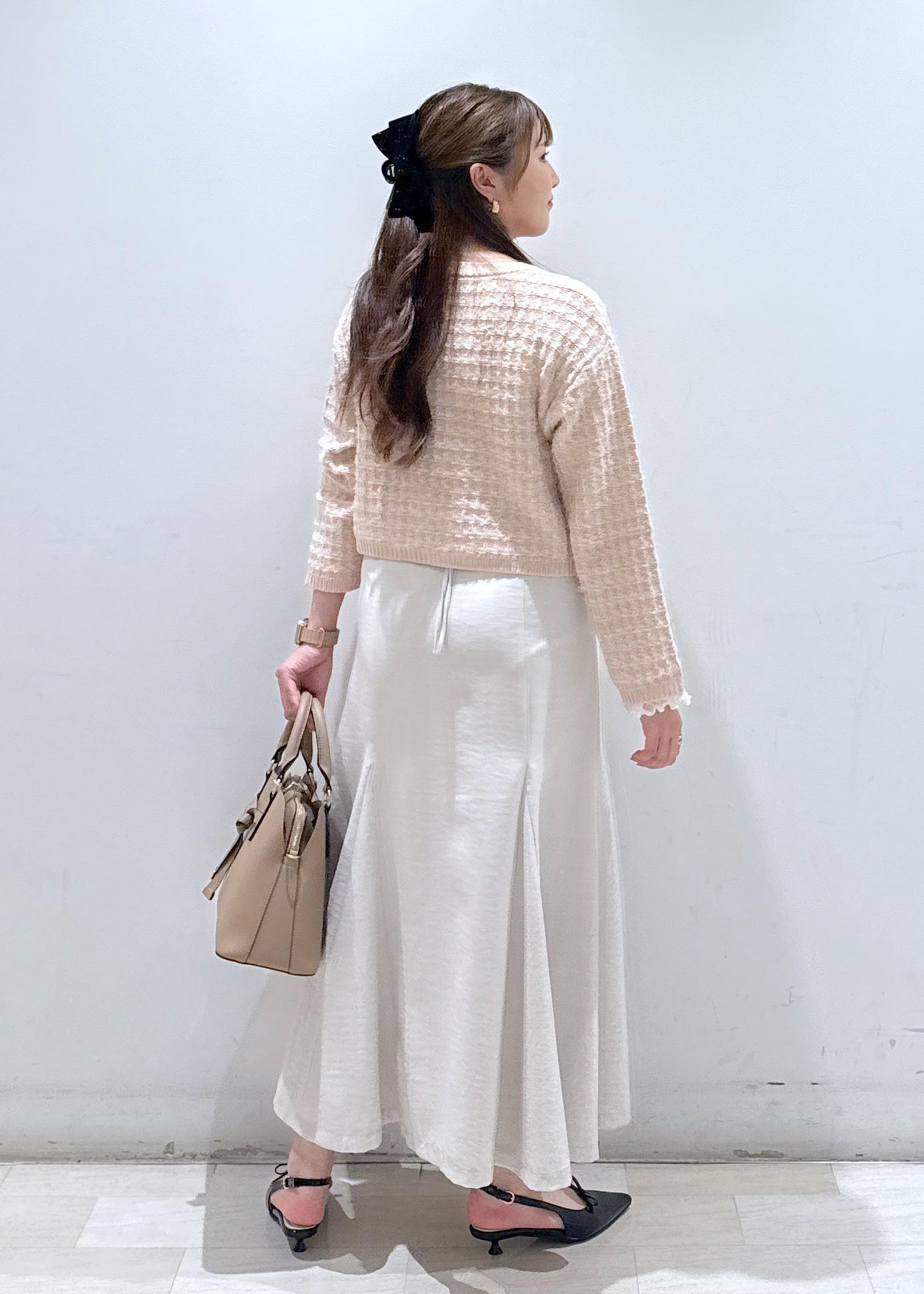 ピンクのツイードカーディガンを一枚のトップスとして着て、マーメイドスカートと合わせて綺麗めなコーディネートにしてみました。甘くガーリーなコーデなので、ピンクがお好きな方にオススメです。