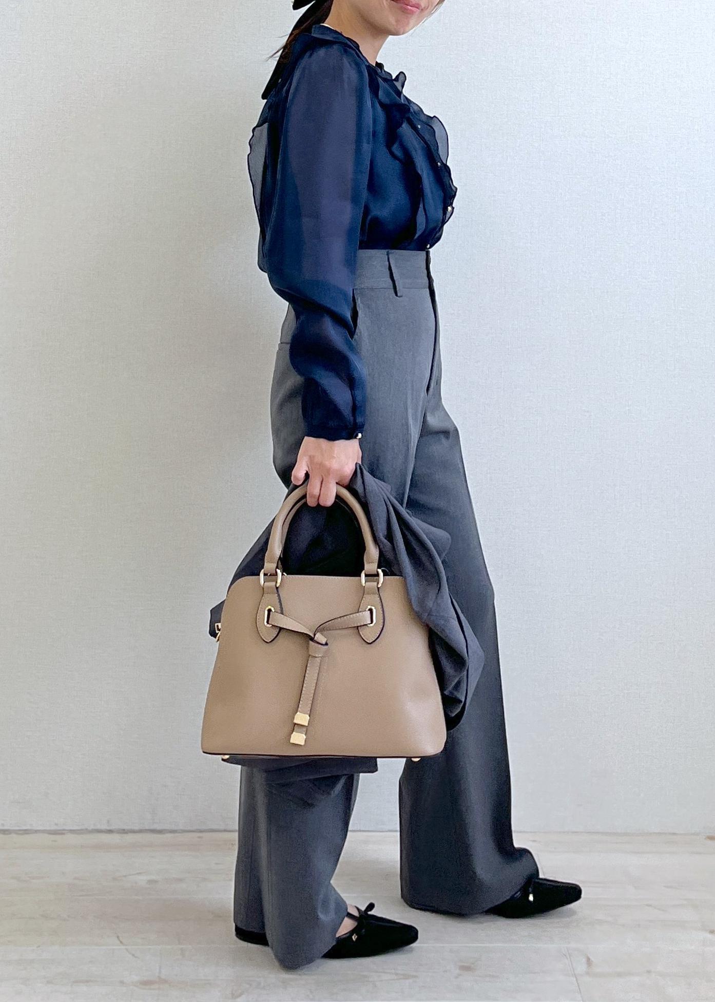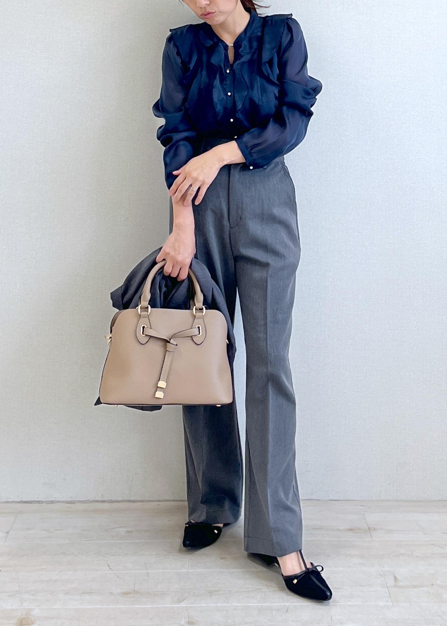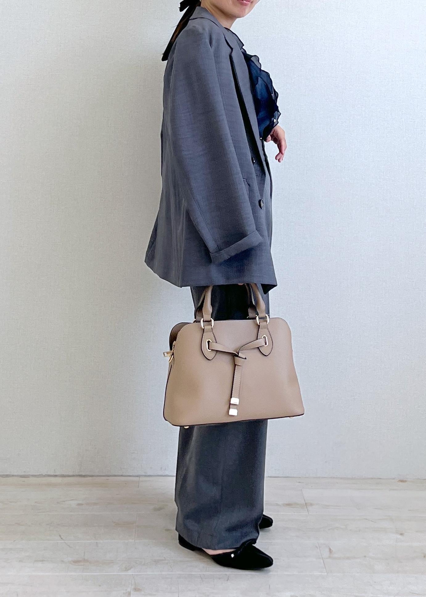 ベージュバッグで柔らかさを添えれば、きちんと感と女性らしさを両立。