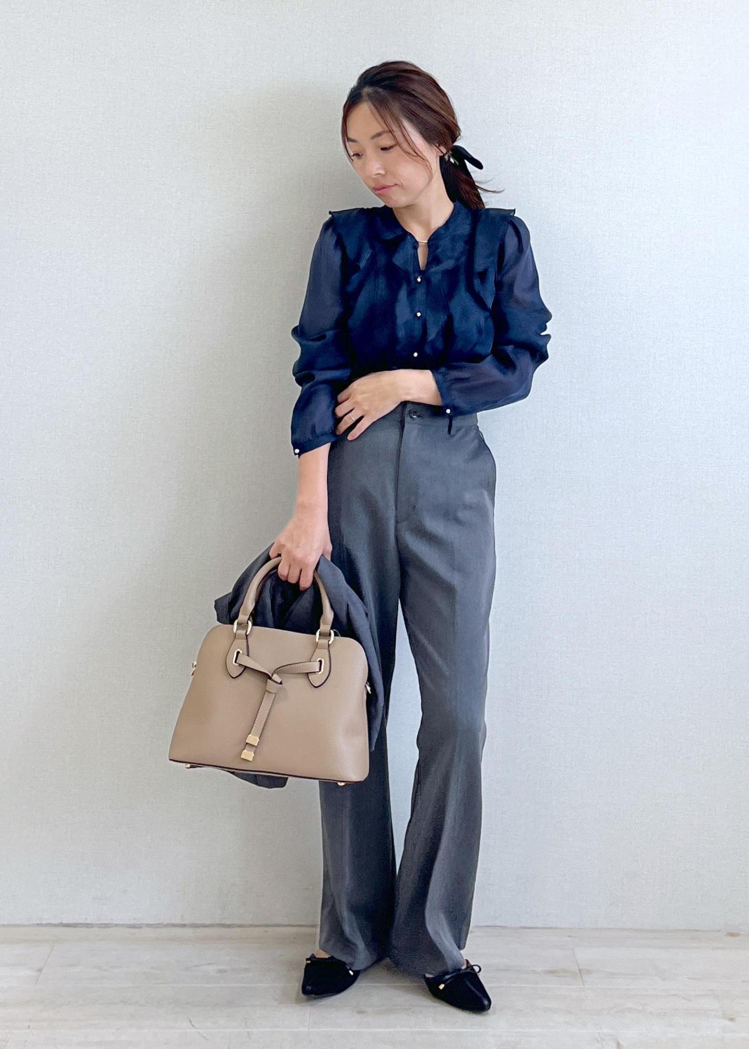 ネイビーのブラウスを差し込んだ上品コーデ。