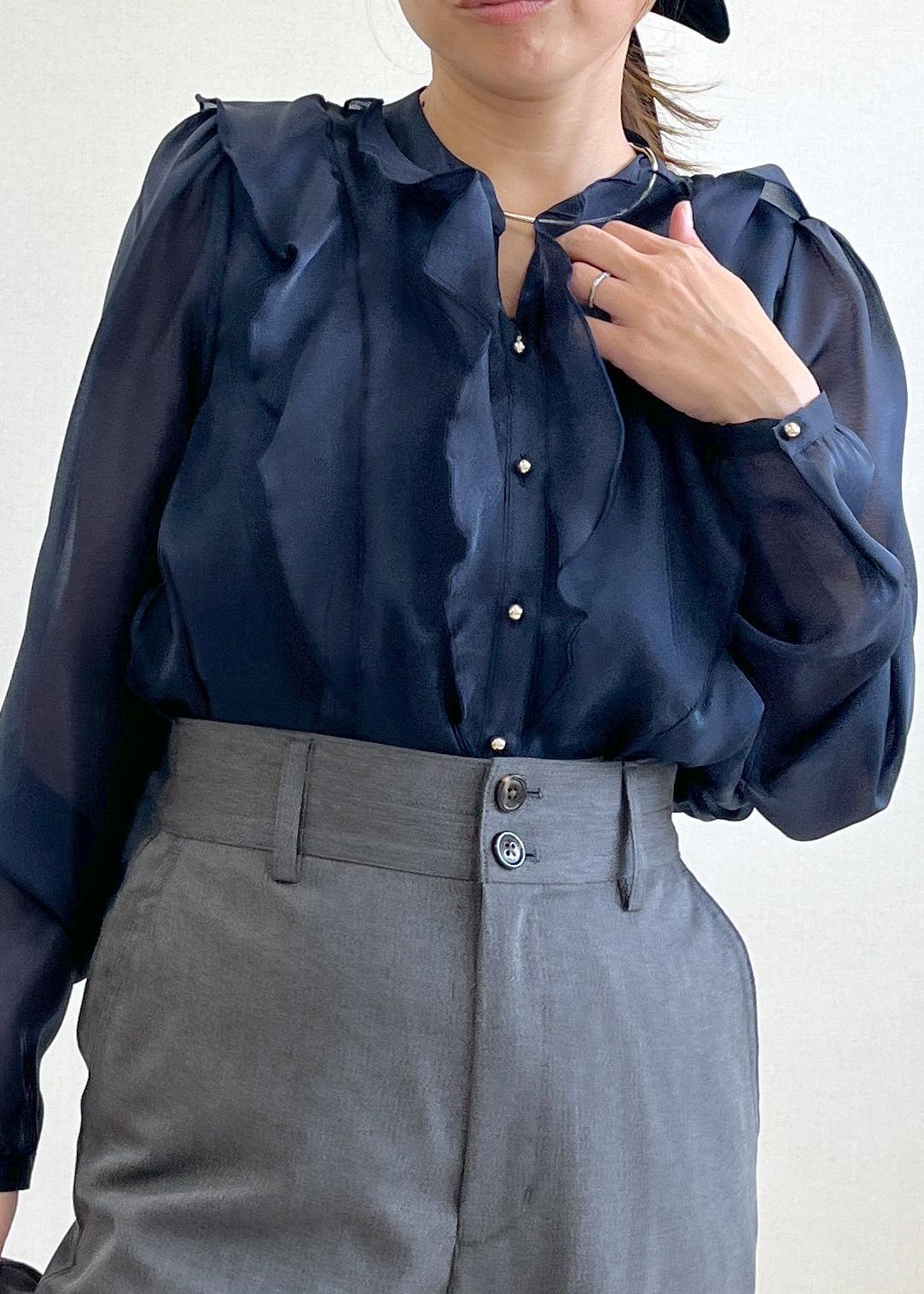 VISシアーラッフルブラウス/イージーケアネイビー / F¥3,842レビュー152cmでFサイズ着用し、着丈は腰にかかるくらいの丈。すっきり細身シルエットですが、程よくゆとりのあるサイズ感。袖部分のみシアー素材で抜け感もプラス。フリルのデザインがおても華やかな印象と女性らしく見せてくれる毎年人気のシリーズです。