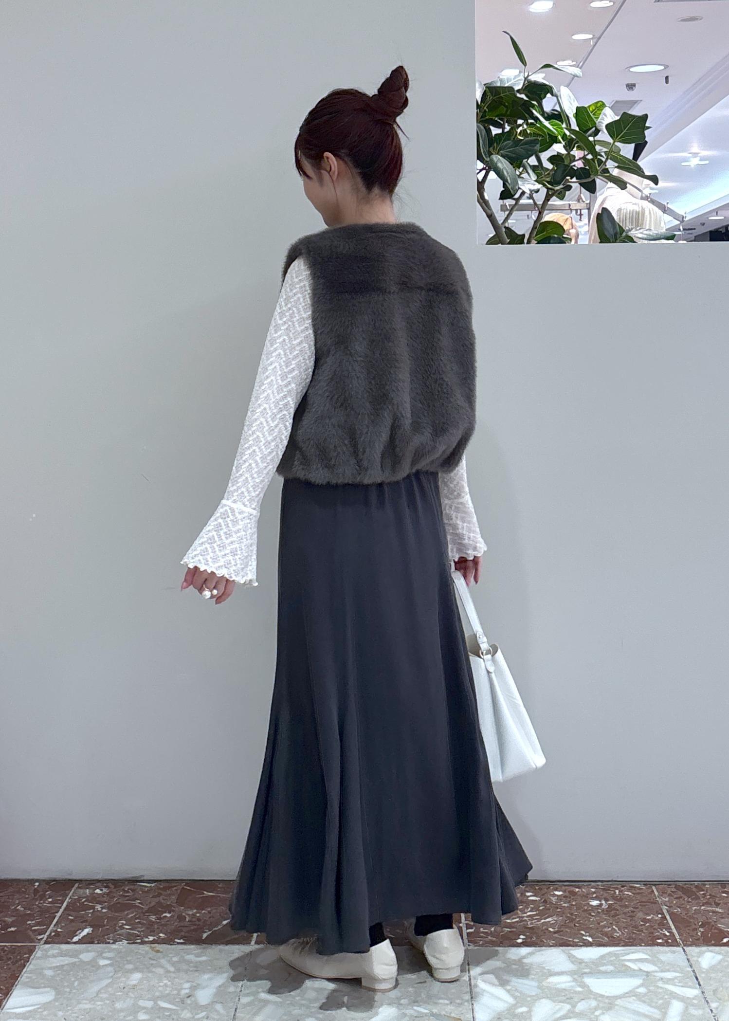 グレーのカラーのものサラサラしたファーの触り心地でボリュームもですぎずなのが◎ -