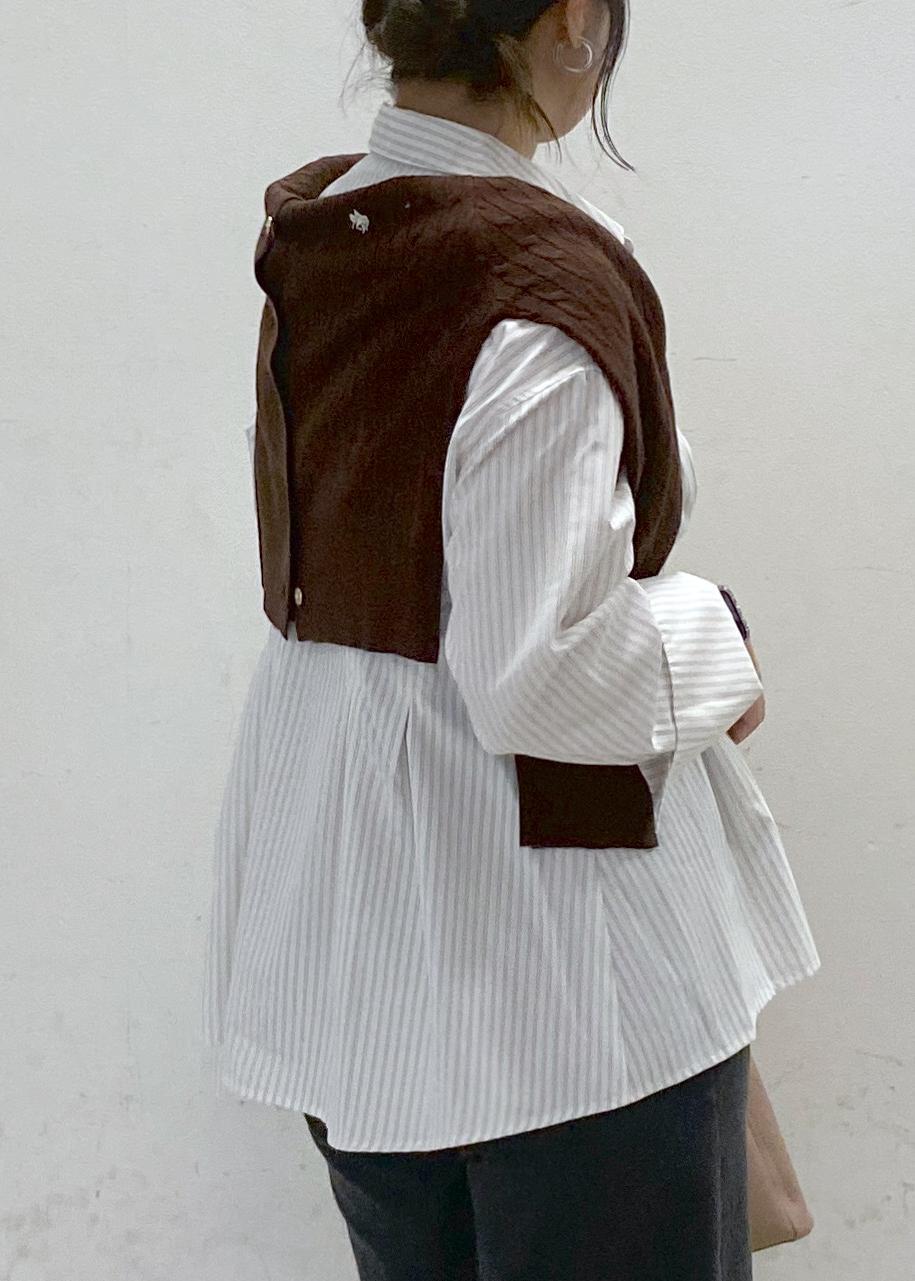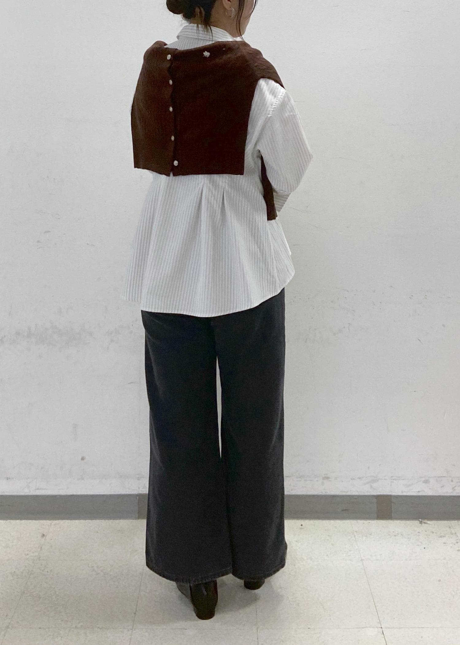 ハリのある素材なので、私はボタンを開けて着たほうがスッキリと見えました。