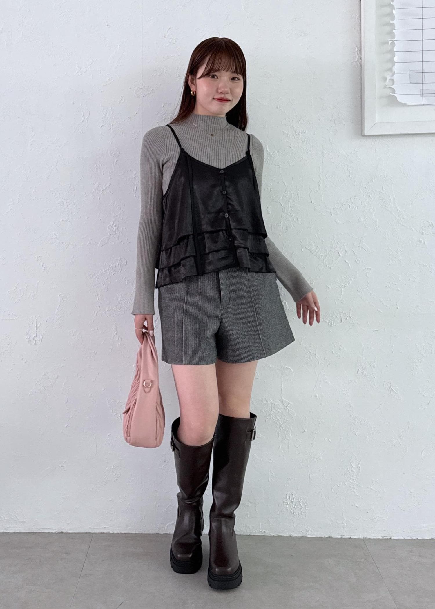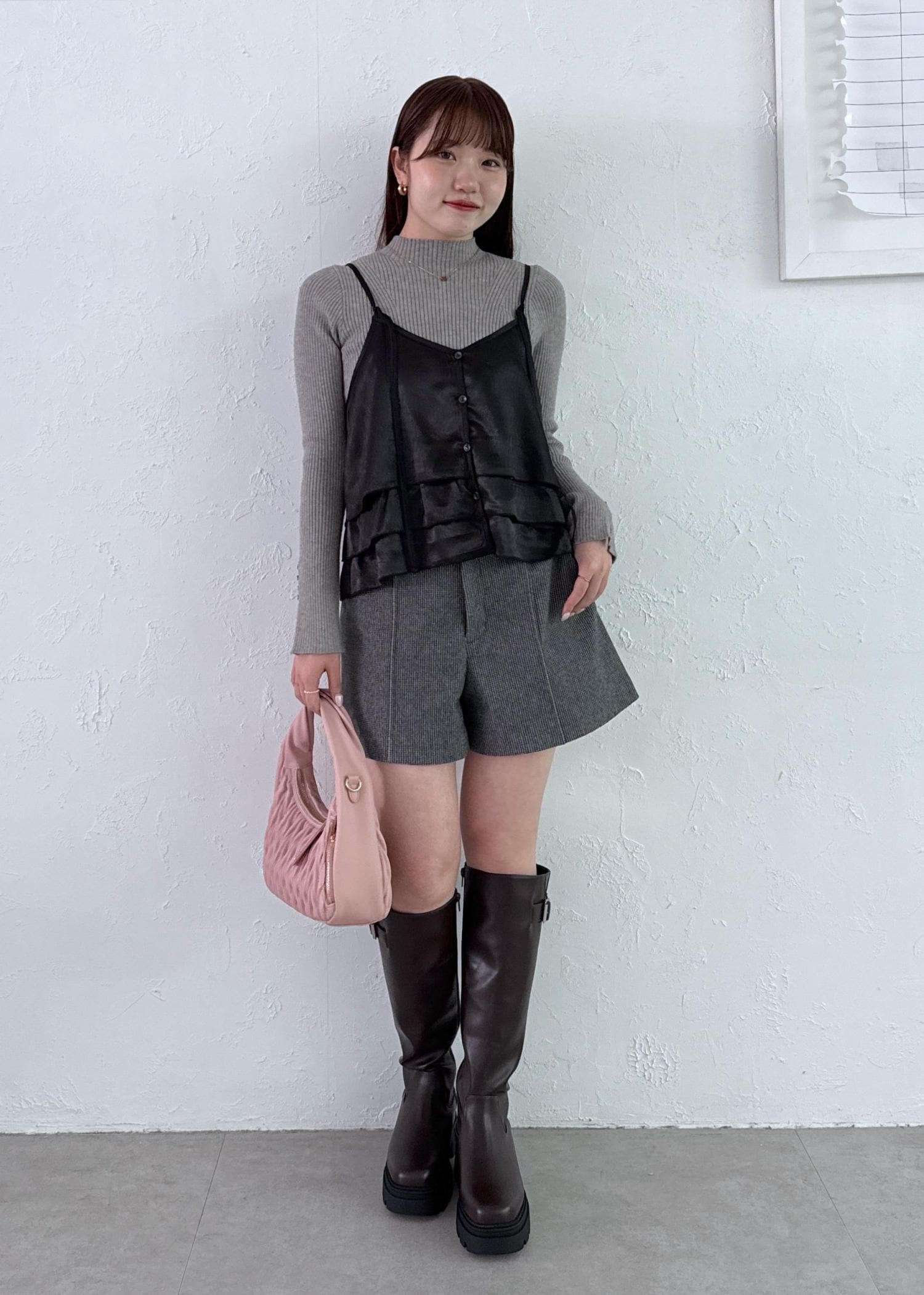秋らしいトップスのレイヤードと、千鳥柄のショートパンツを合わせて足元はブラウンのブーツに!◎