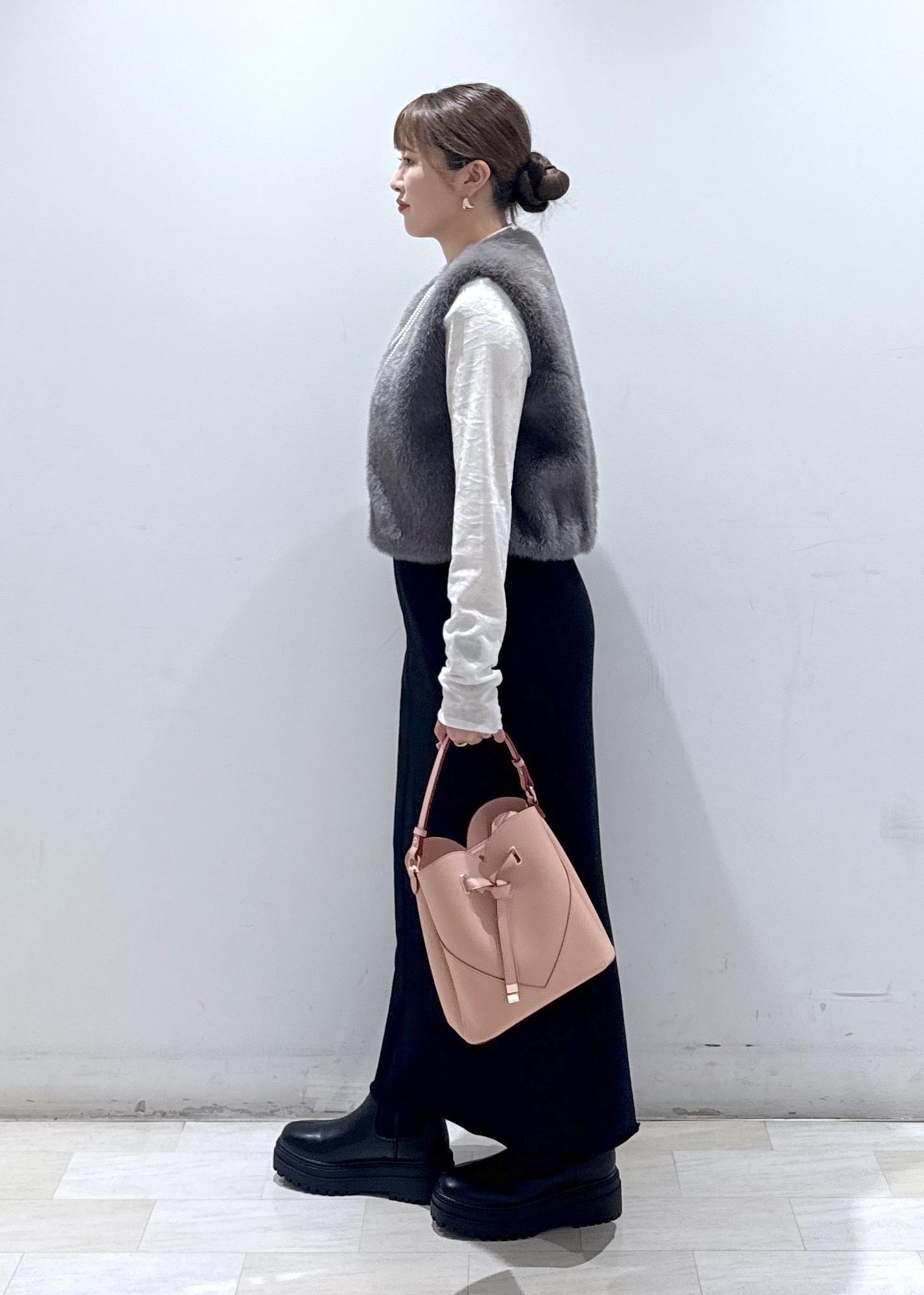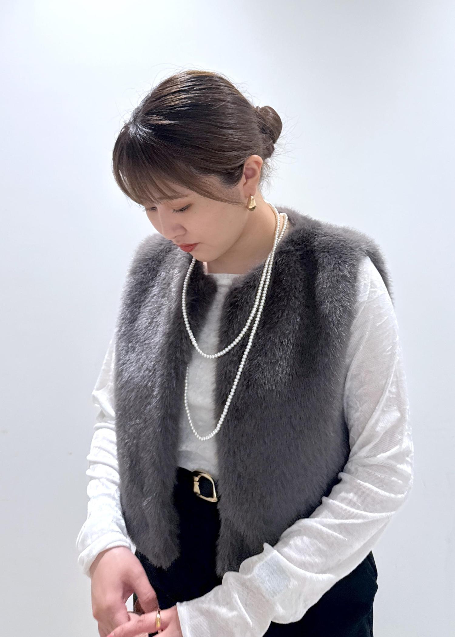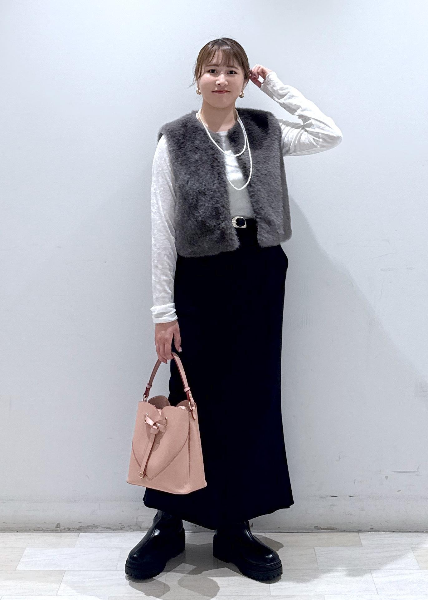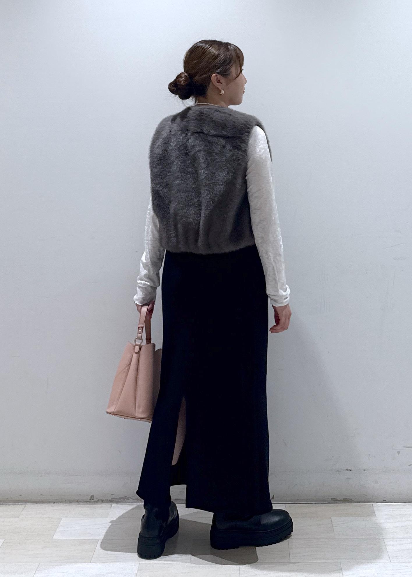 今回は新作で入荷しましたファーベストを使って、ベロア素材のインナーを着てお仕事や女子会などにも着れる綺麗めなコーディネートにしてみました。