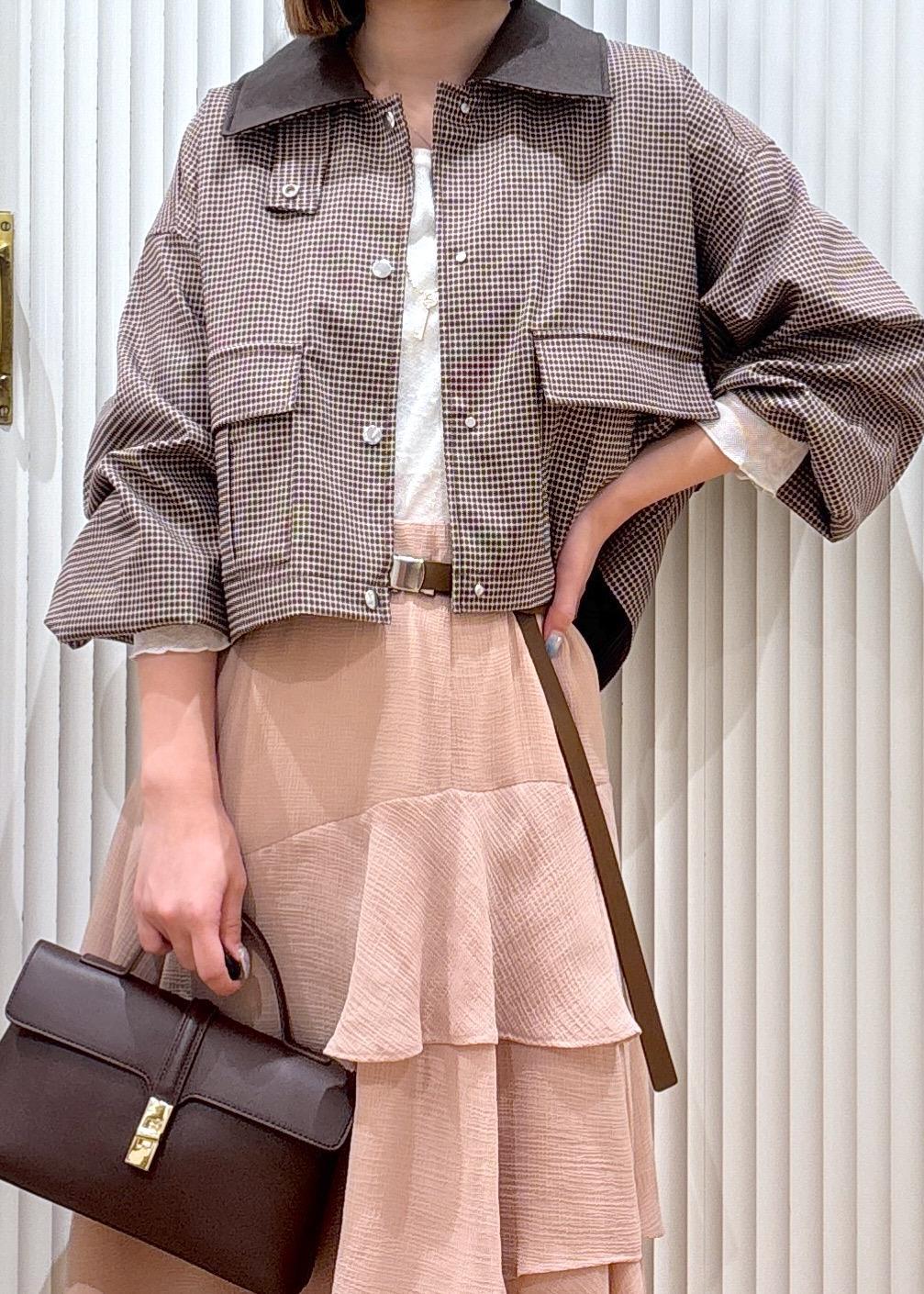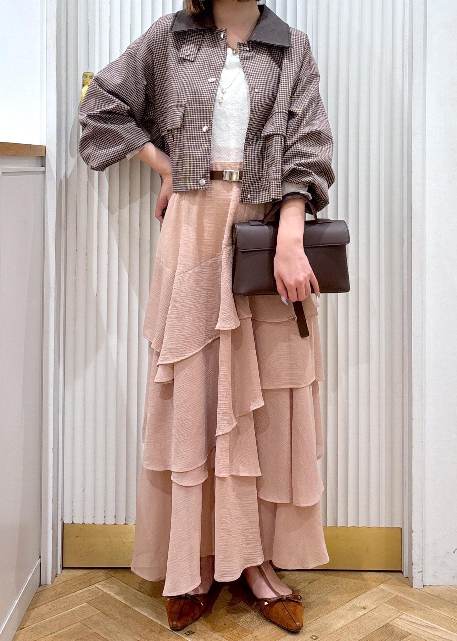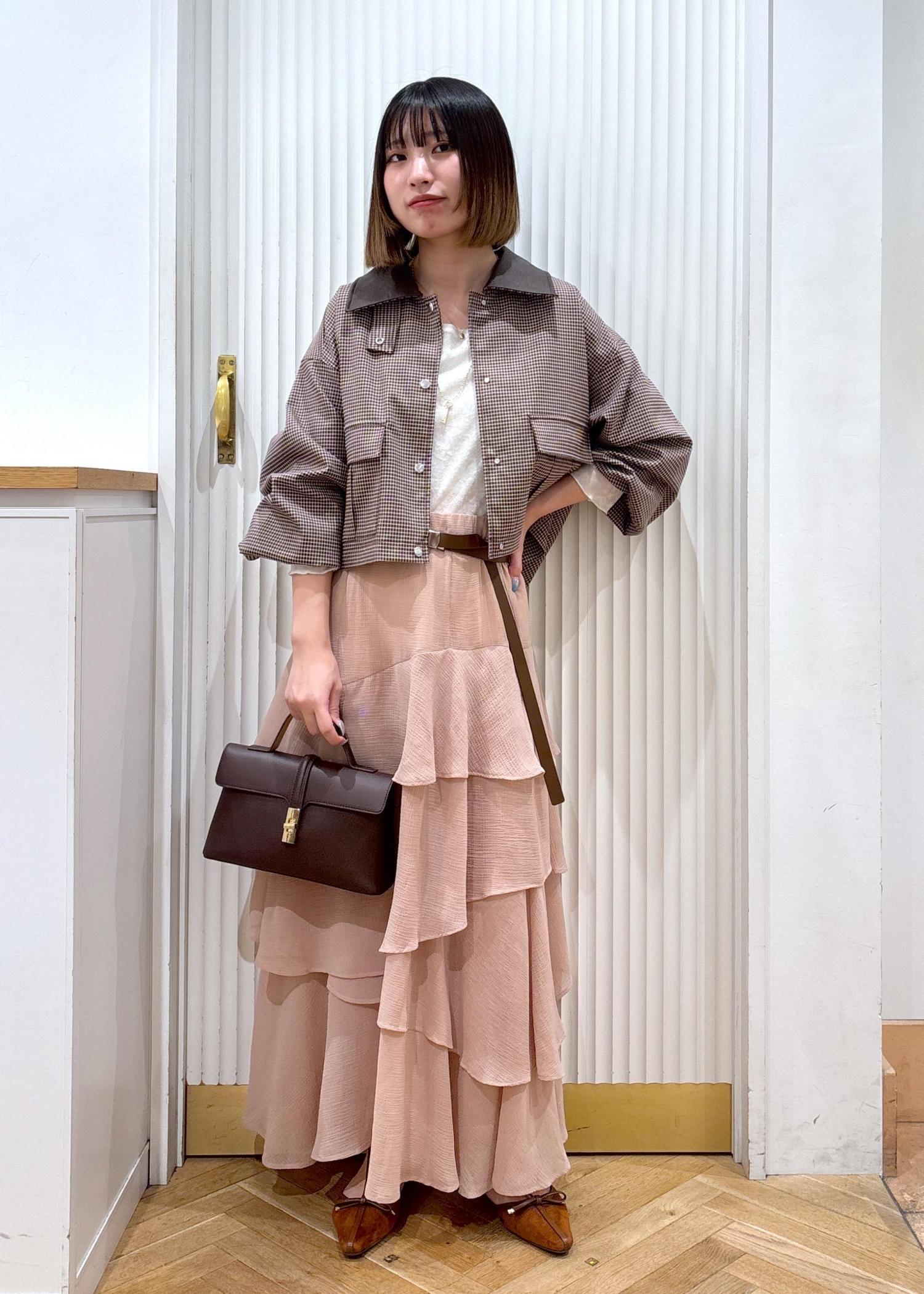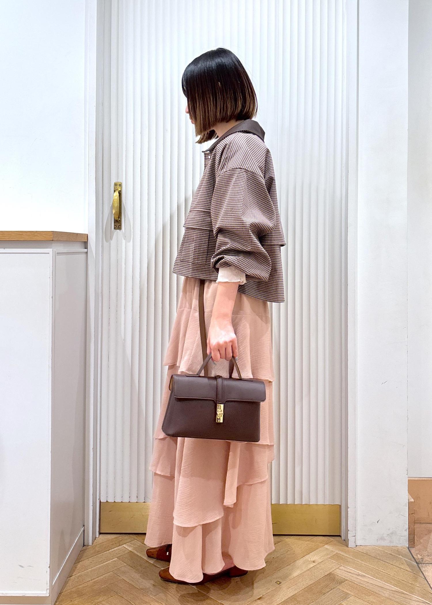 黒ではなく濃いブラウンを小物に持ってくることでワントーンながらコーディネートが締まります。またスカートやインナーに明るい色を持ってくることで華やかさがアップします!