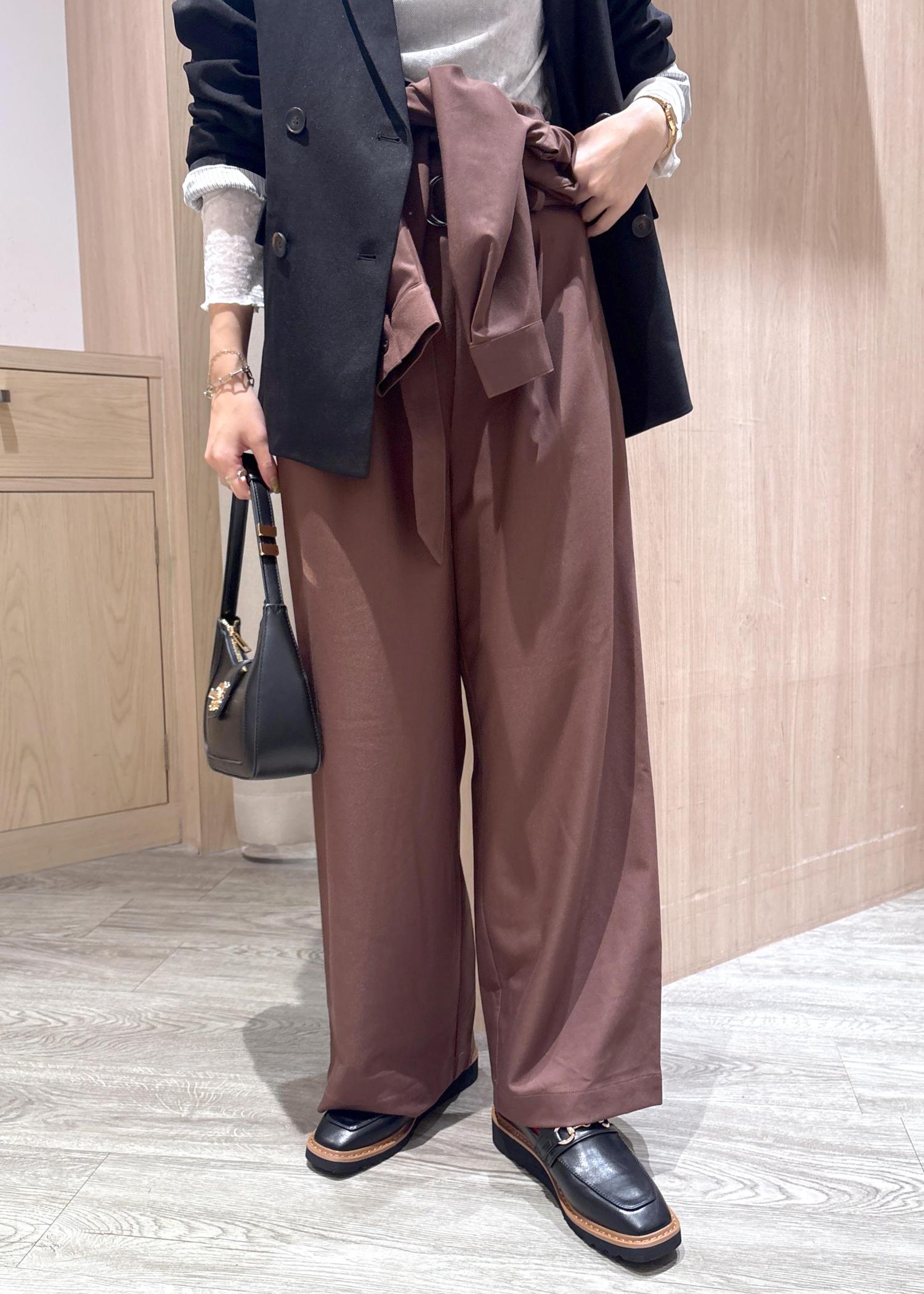 ルーズワイドなジャンプスーツを腰巻きして履くことで、メンズライクな印象に。