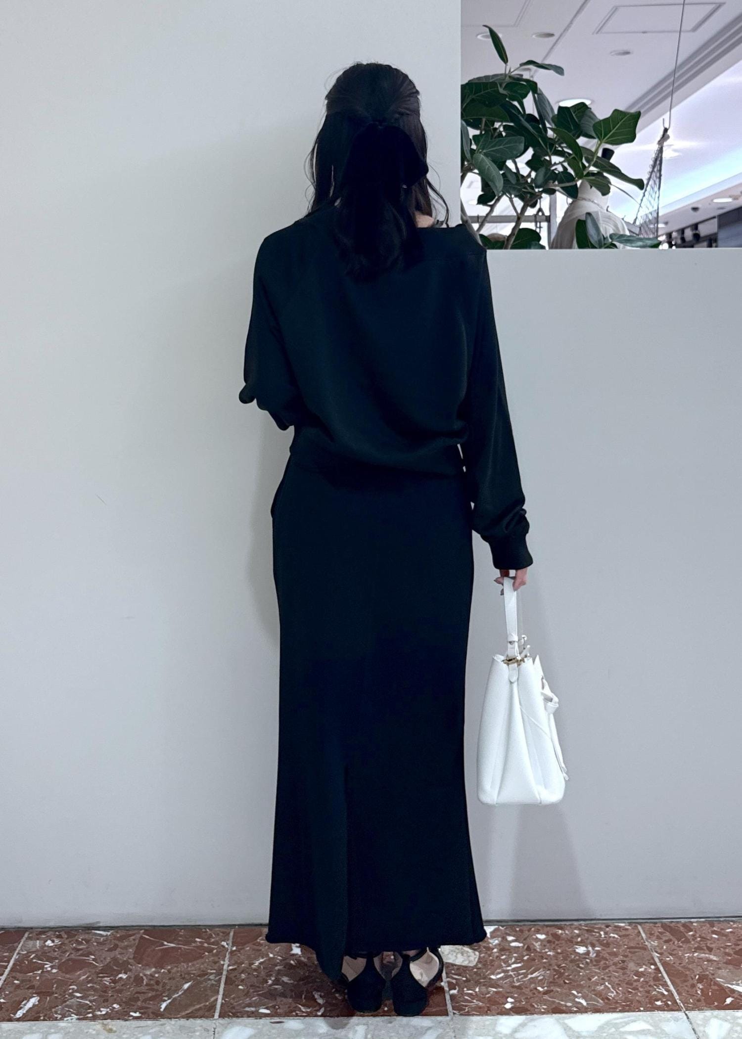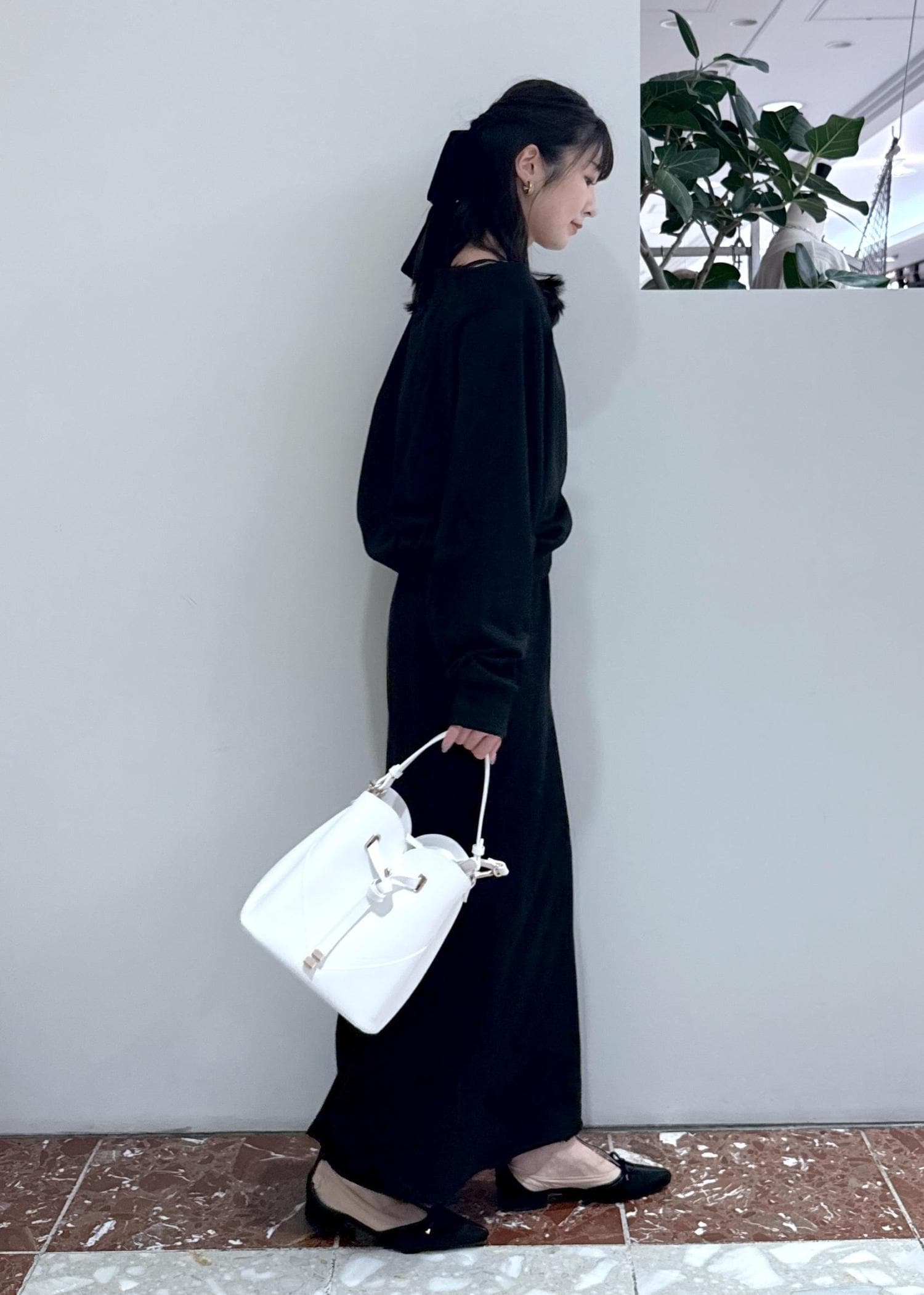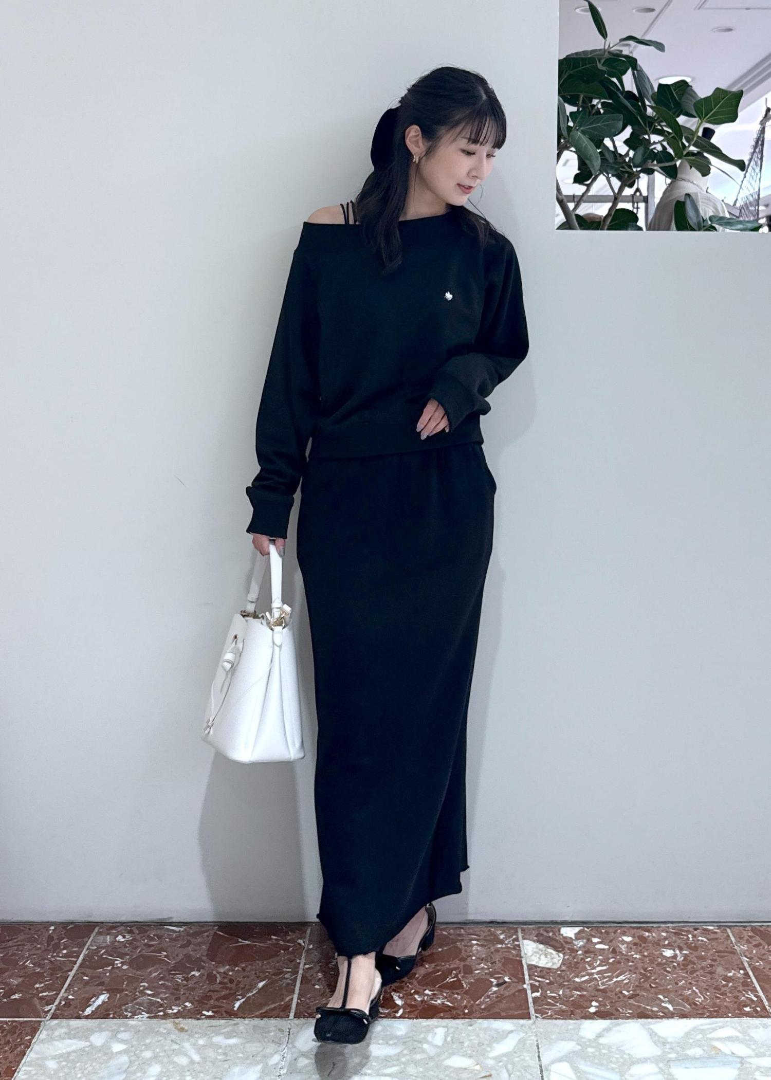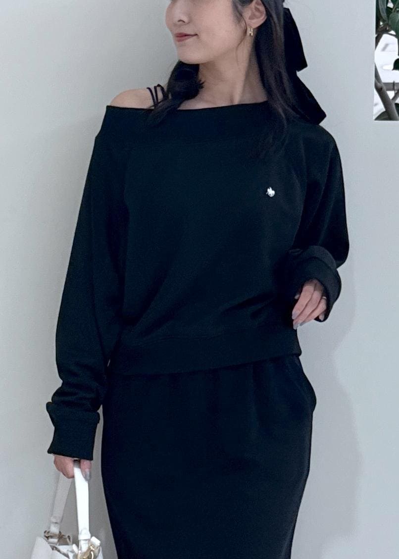 カジュアルになりがちなスウェットですが、ワンオフショルにもなるデザインなので、女性らしく着られます◎ -