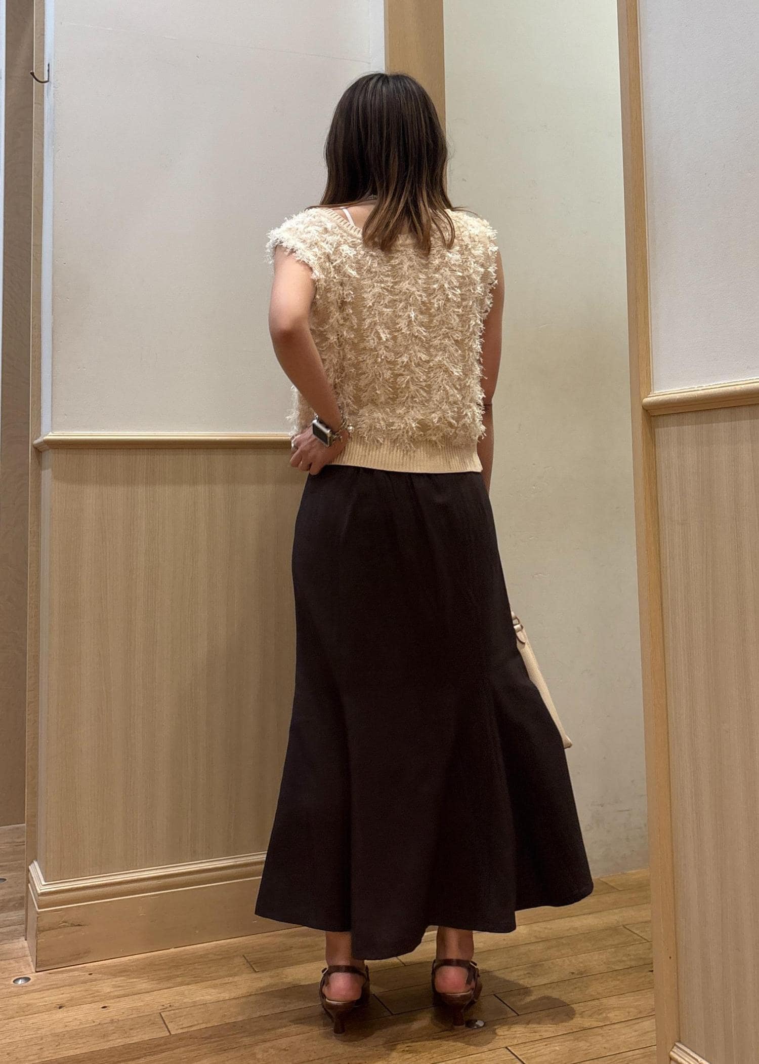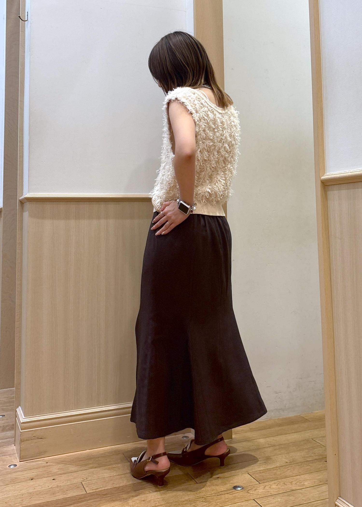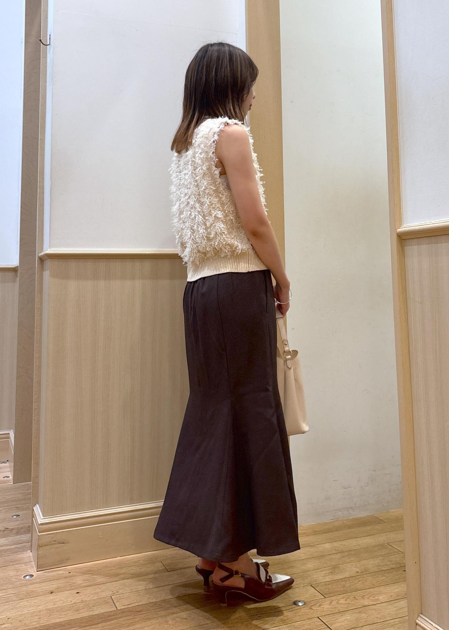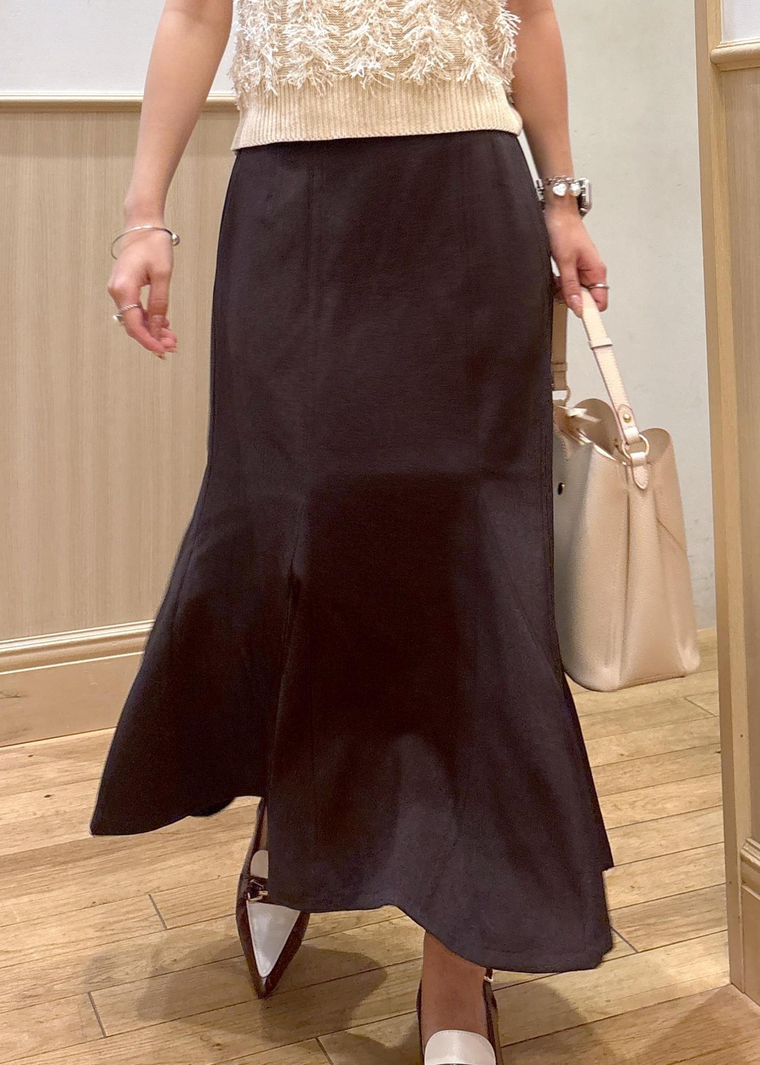 シルエットが綺麗なマーメイドスカートが映えるように、短丈のトップスと合わせたシンプルなコーデです。