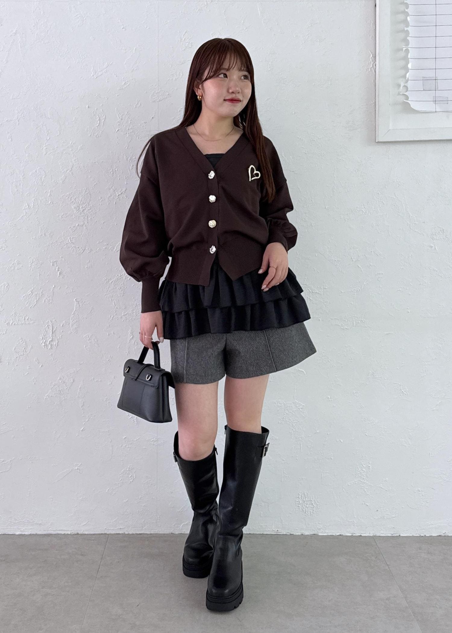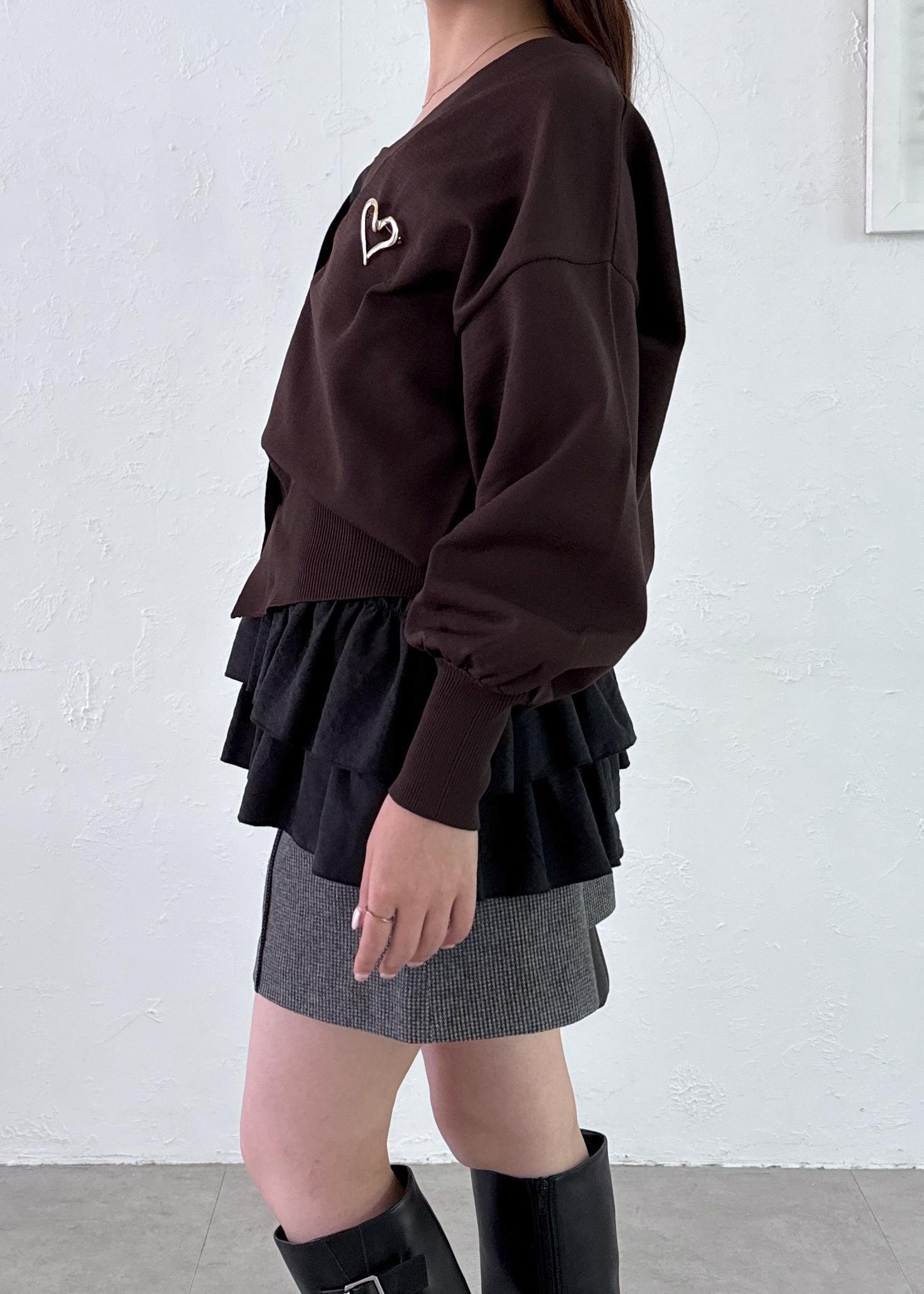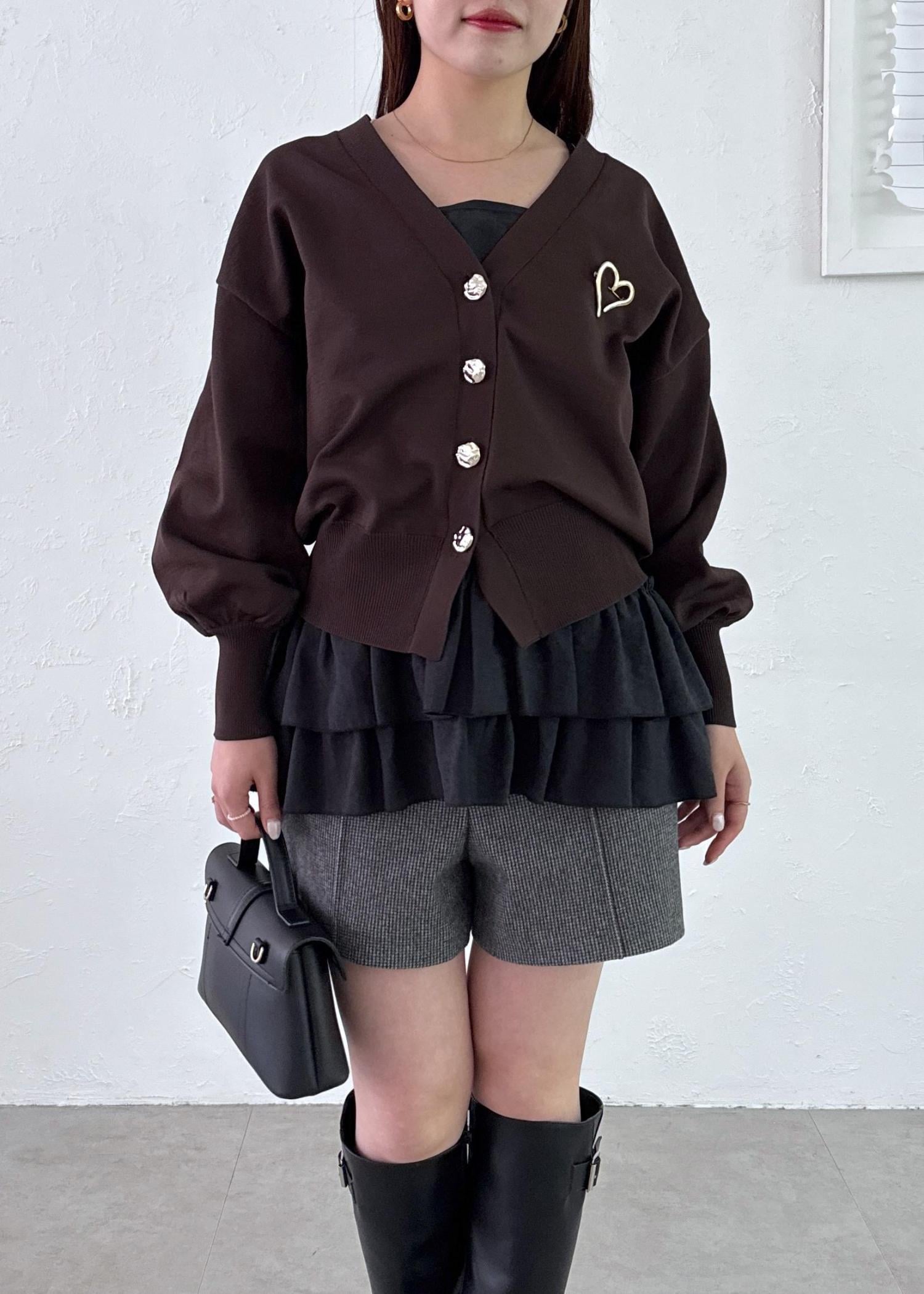 大人っぽいダークカラーでまとめ、フリルやハートのブローチでフェミニンな女性らしさをプラスした秋コーデに!