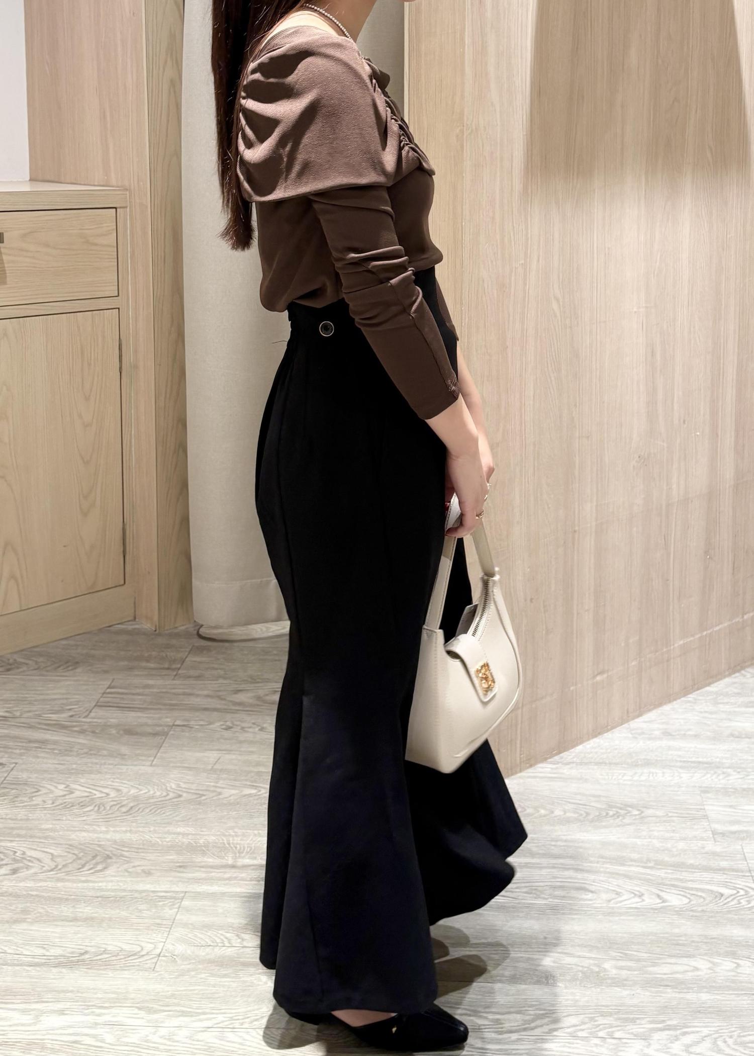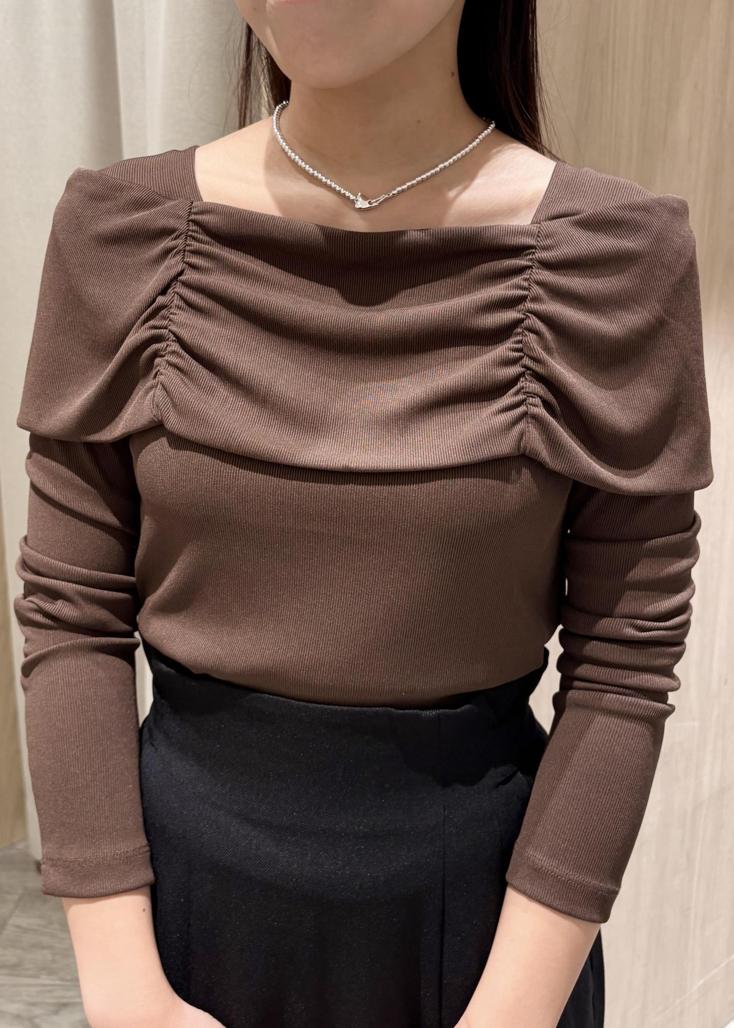 VISテレコオフショルダーロングスリーブプルオーバーダークブラウン / F¥3,072レビュー体にフィットする素材感で細見えさせることができます。丈はお腹が隠れるくらいです。オフショル風で肩紐が見えないところがポイントです。
