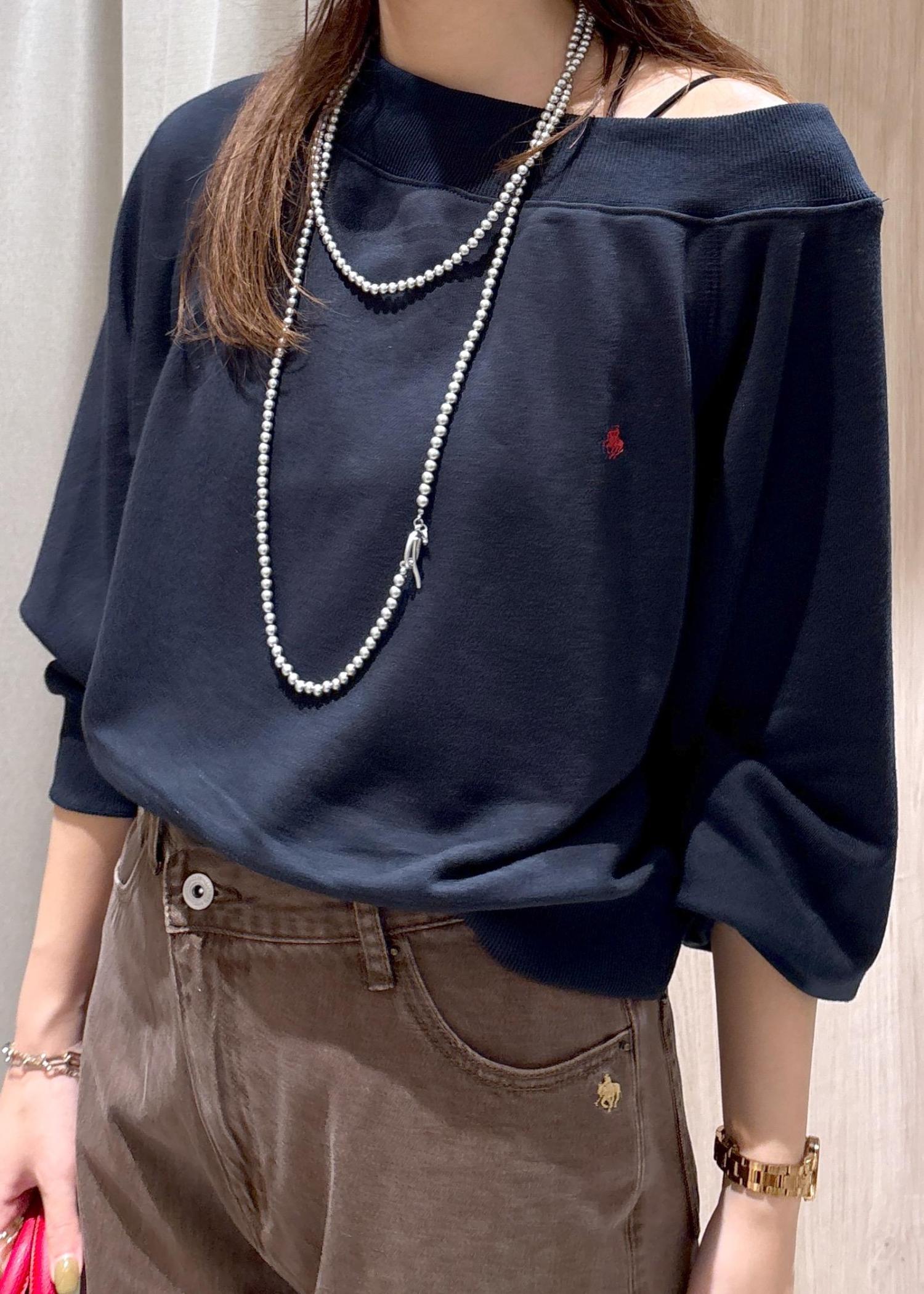 ボートネックにもワンオフショルとしても着られるので首元は鎖骨が見えるくらいの余裕があります。