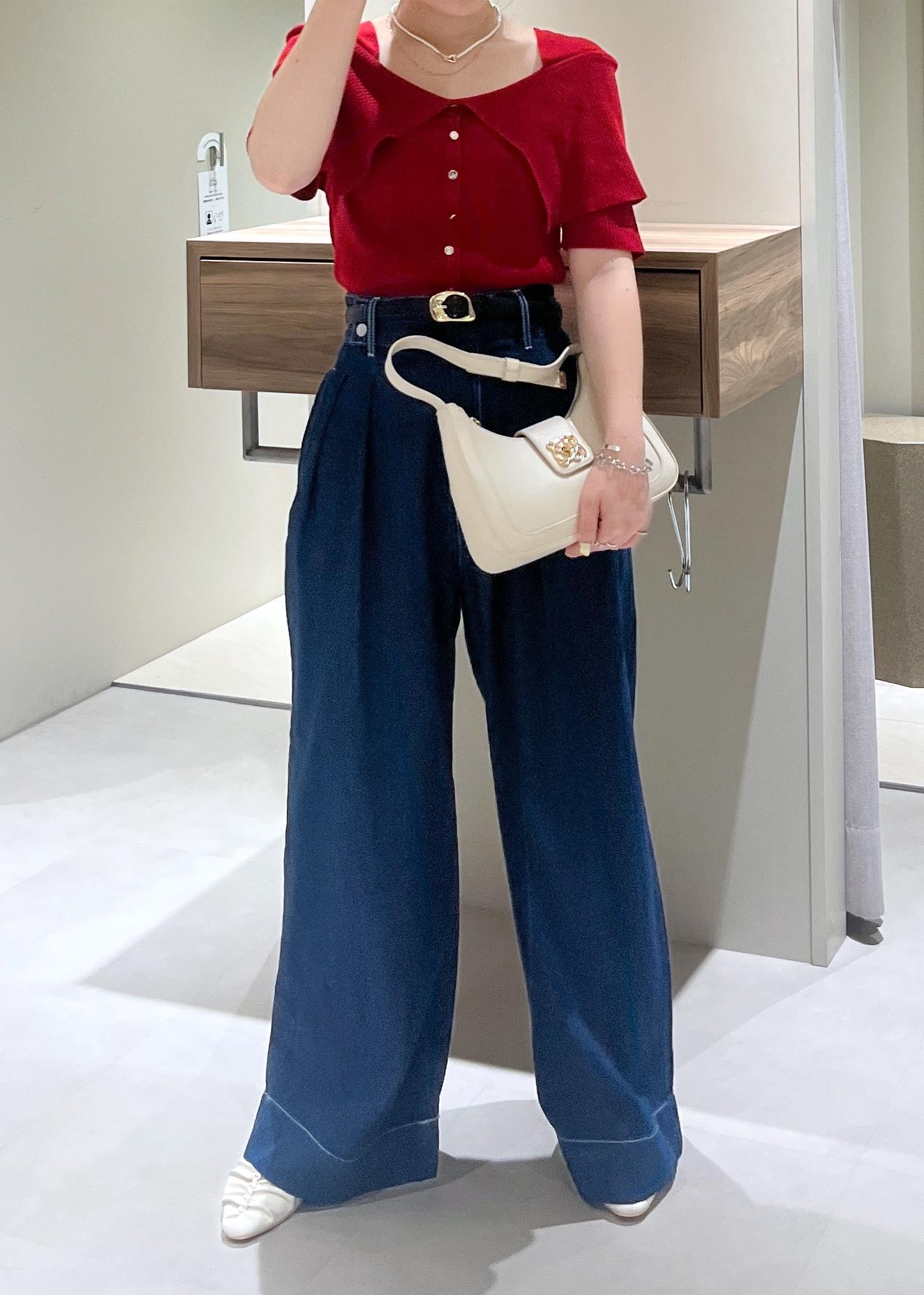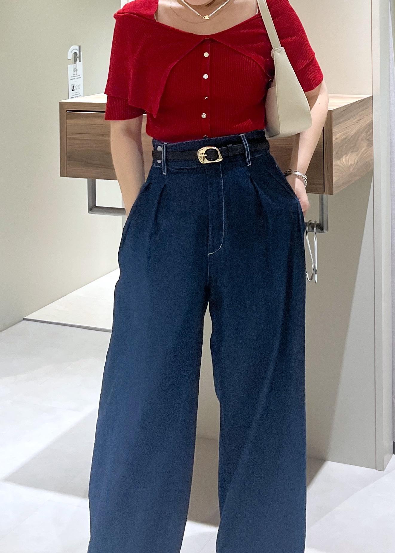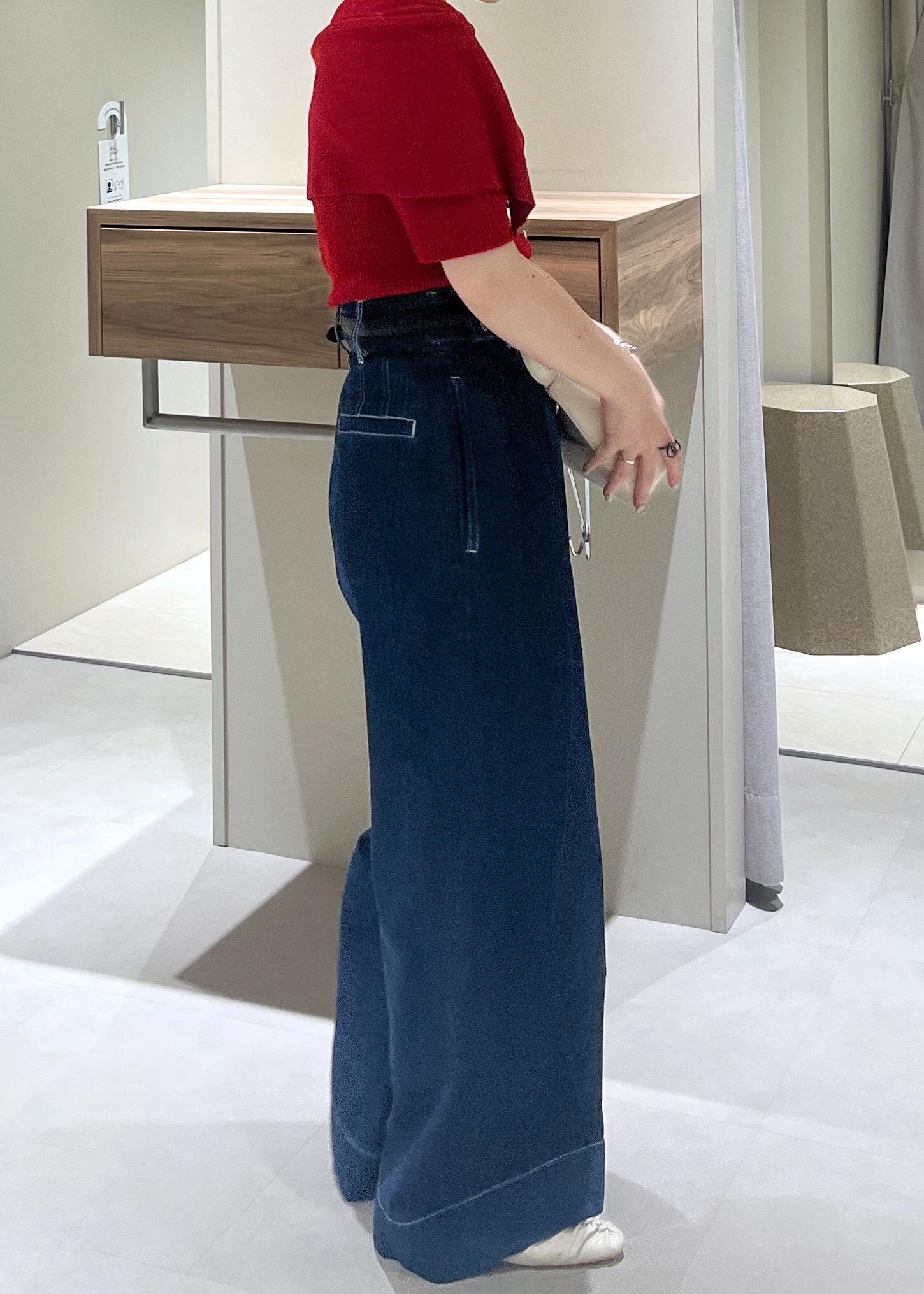かなりワイドなおつくりですが、ハイウエストで履けるのと、ウエスト部分がぴたっとしたおつくりなので低身長さんでも履きやすいかなと思います!