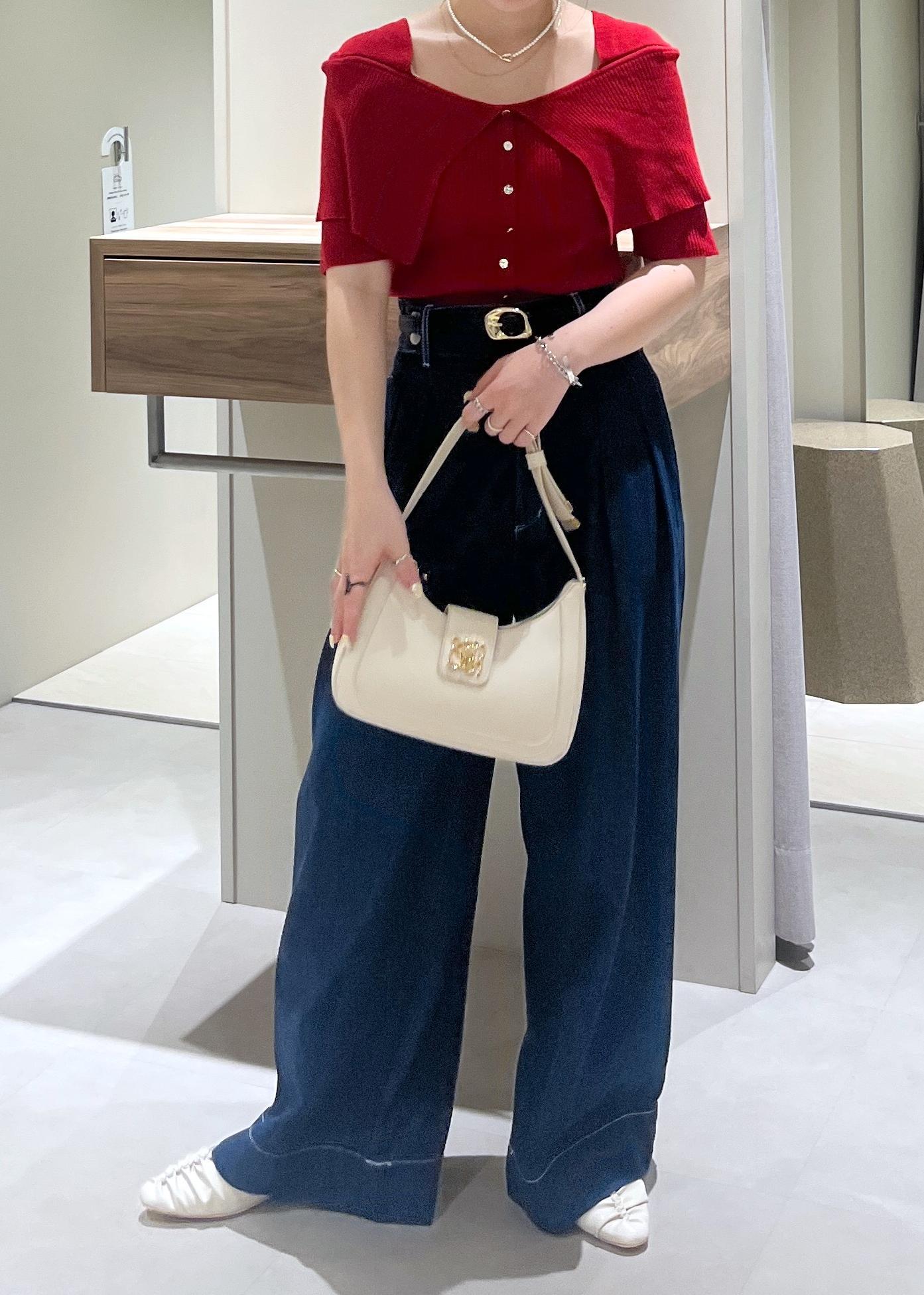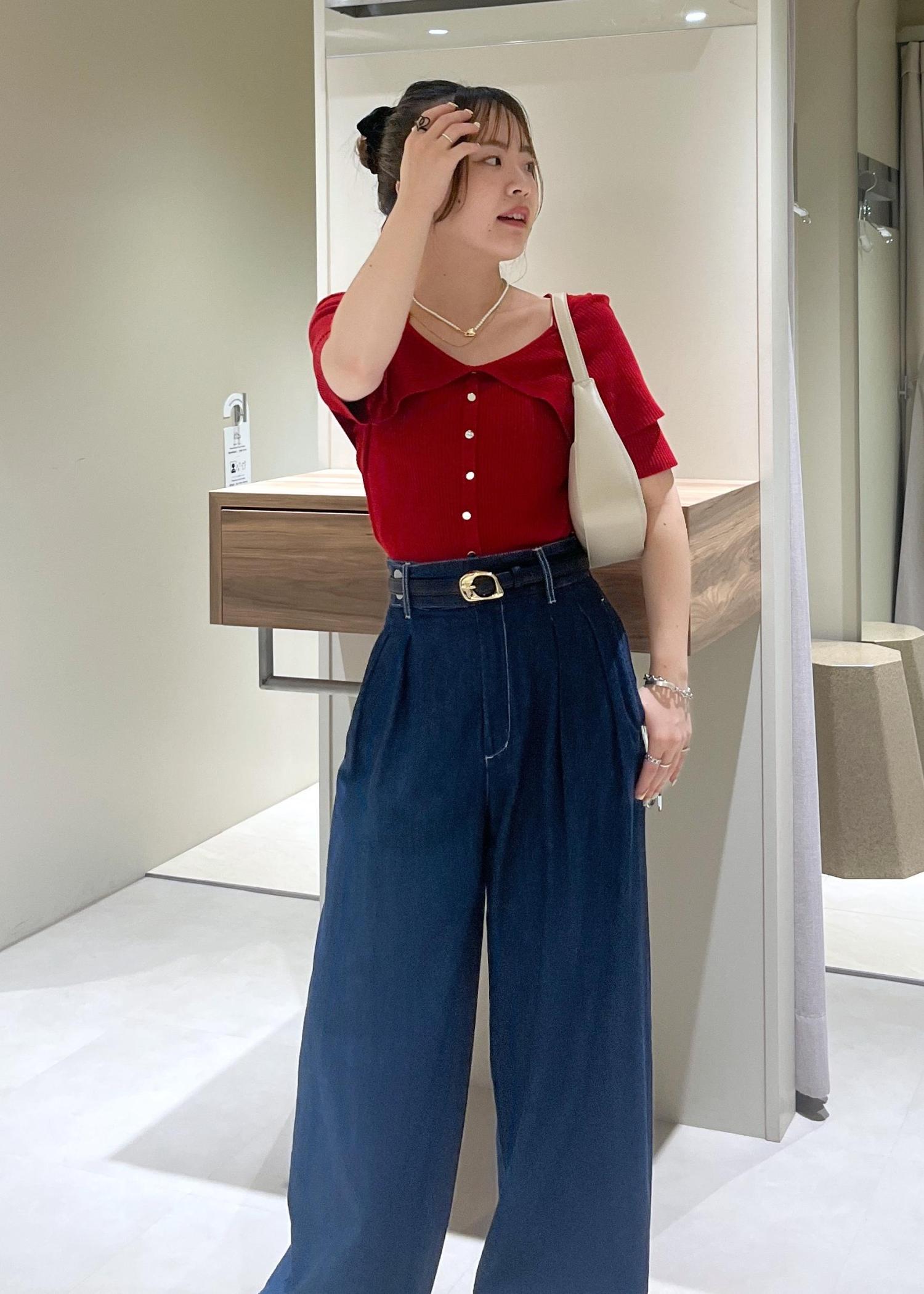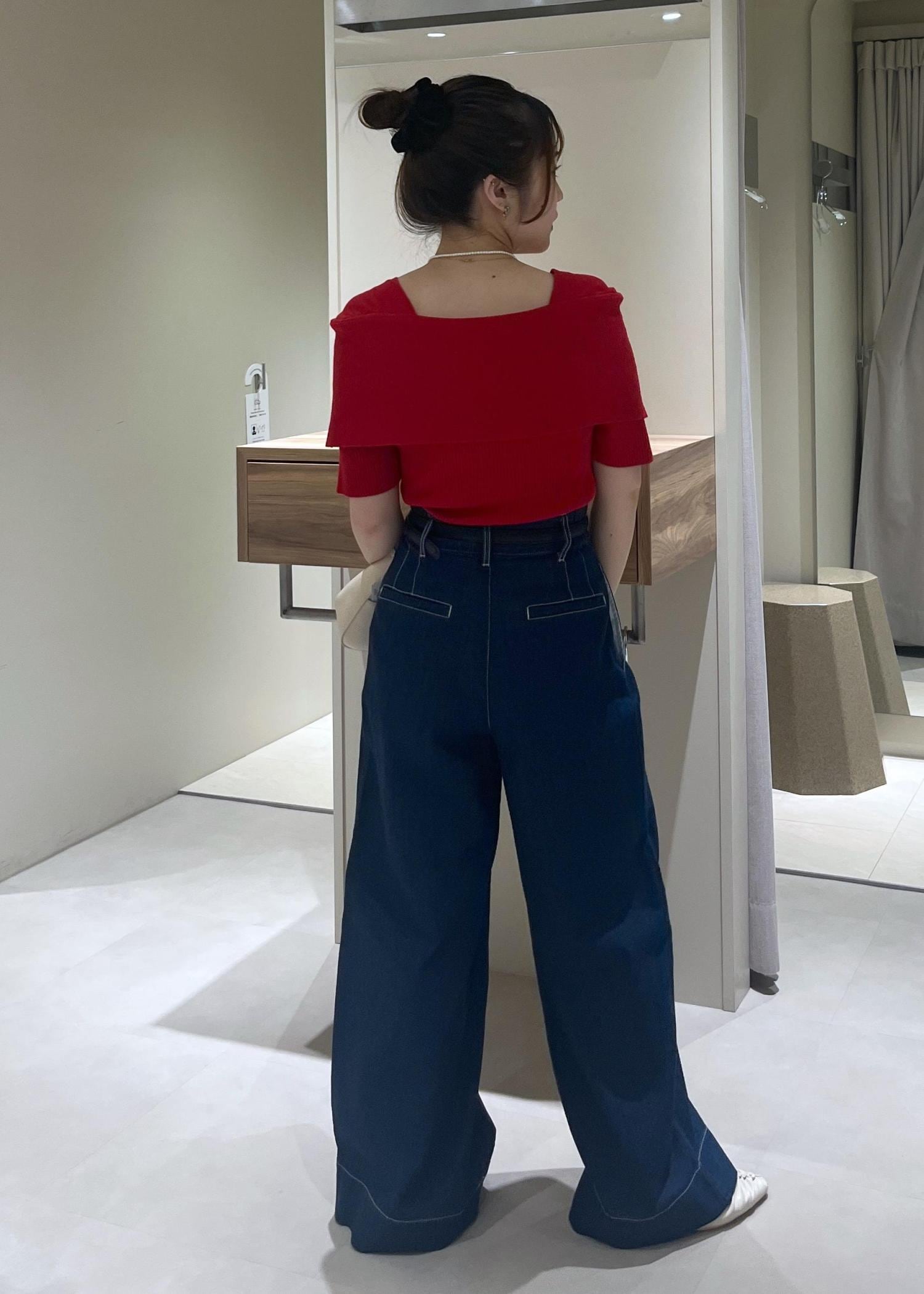 かなりワイドなおつくりですが、ハイウエストで履けるのと、ウエスト部分がぴたっとしたおつくりなので低身長さんでも履きやすいかなと思います!