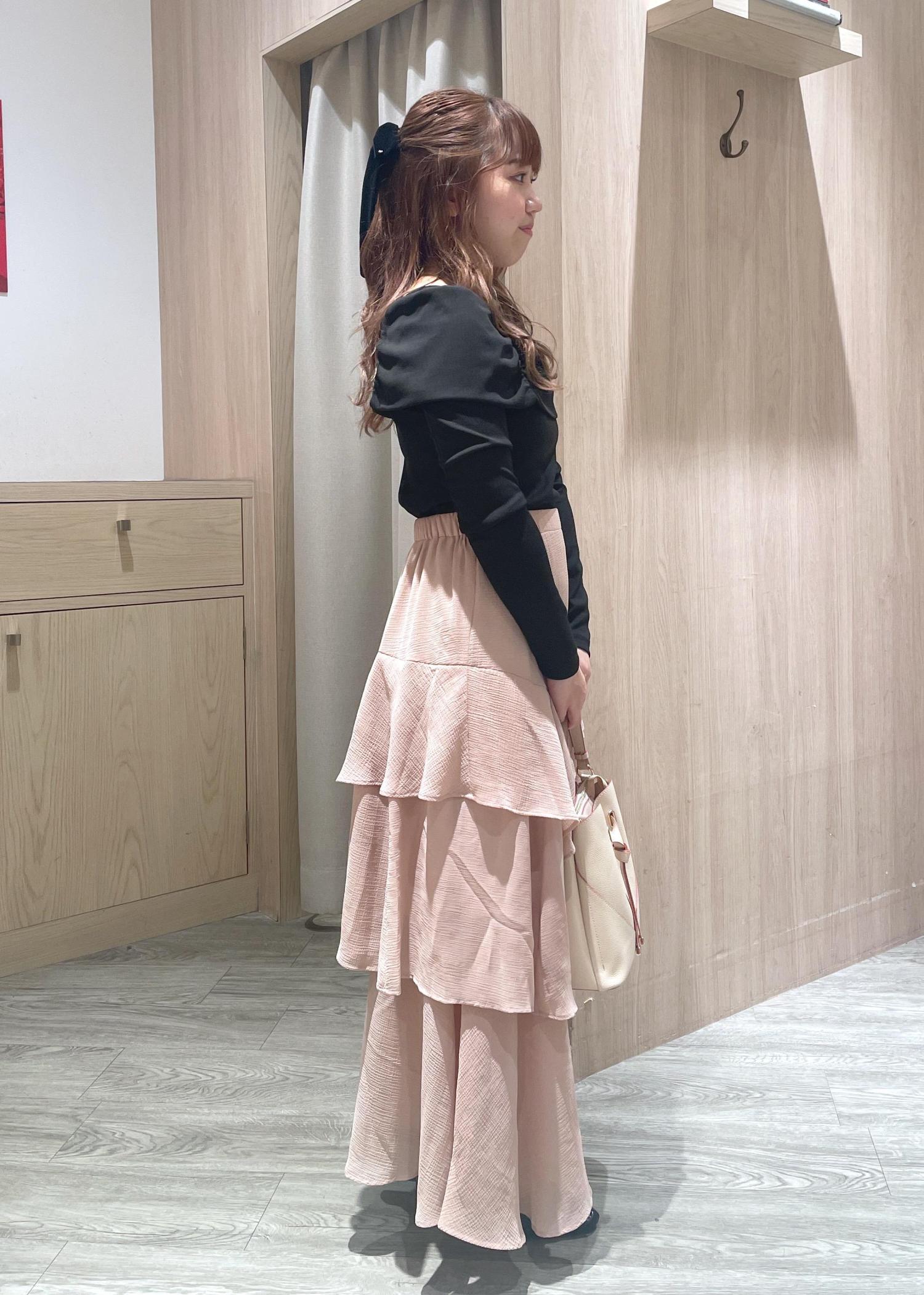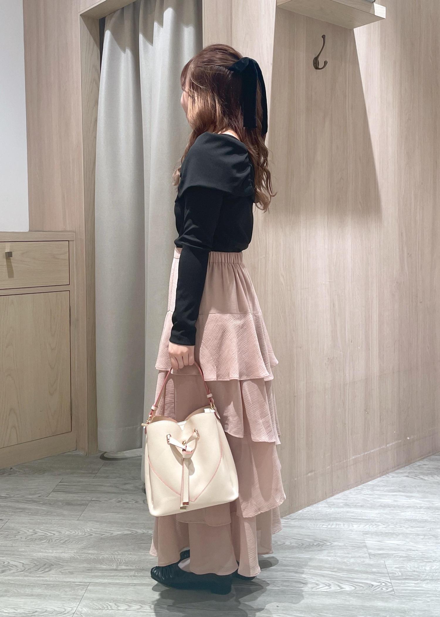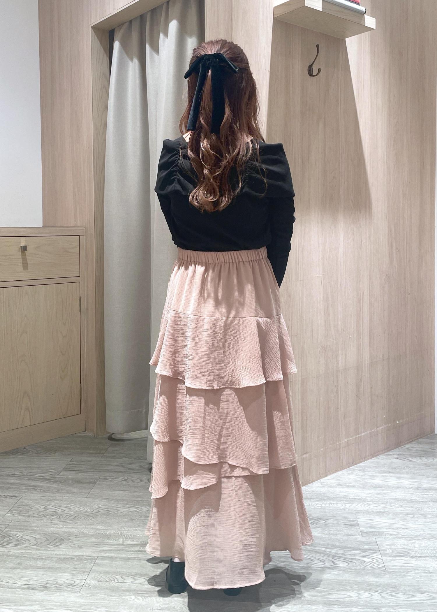 オフショルトップスにティアードスカートを合わせた甘めフェミニンコーデです♪