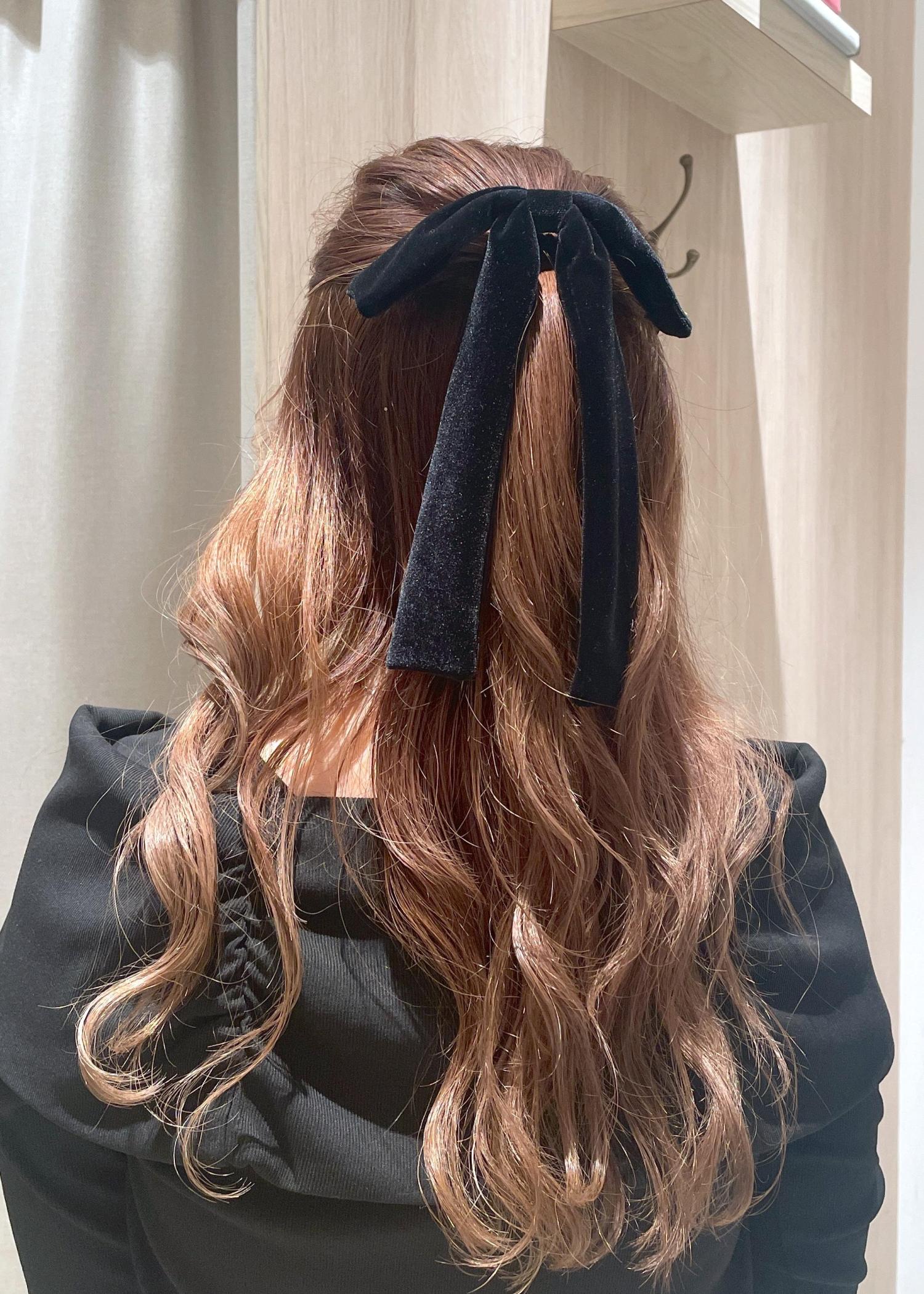VISベロアリボンヘアカフブラック / F¥2,189レビューゴムの結び目に挿すだけでヘアスタイルが可愛らしく決まります♪
