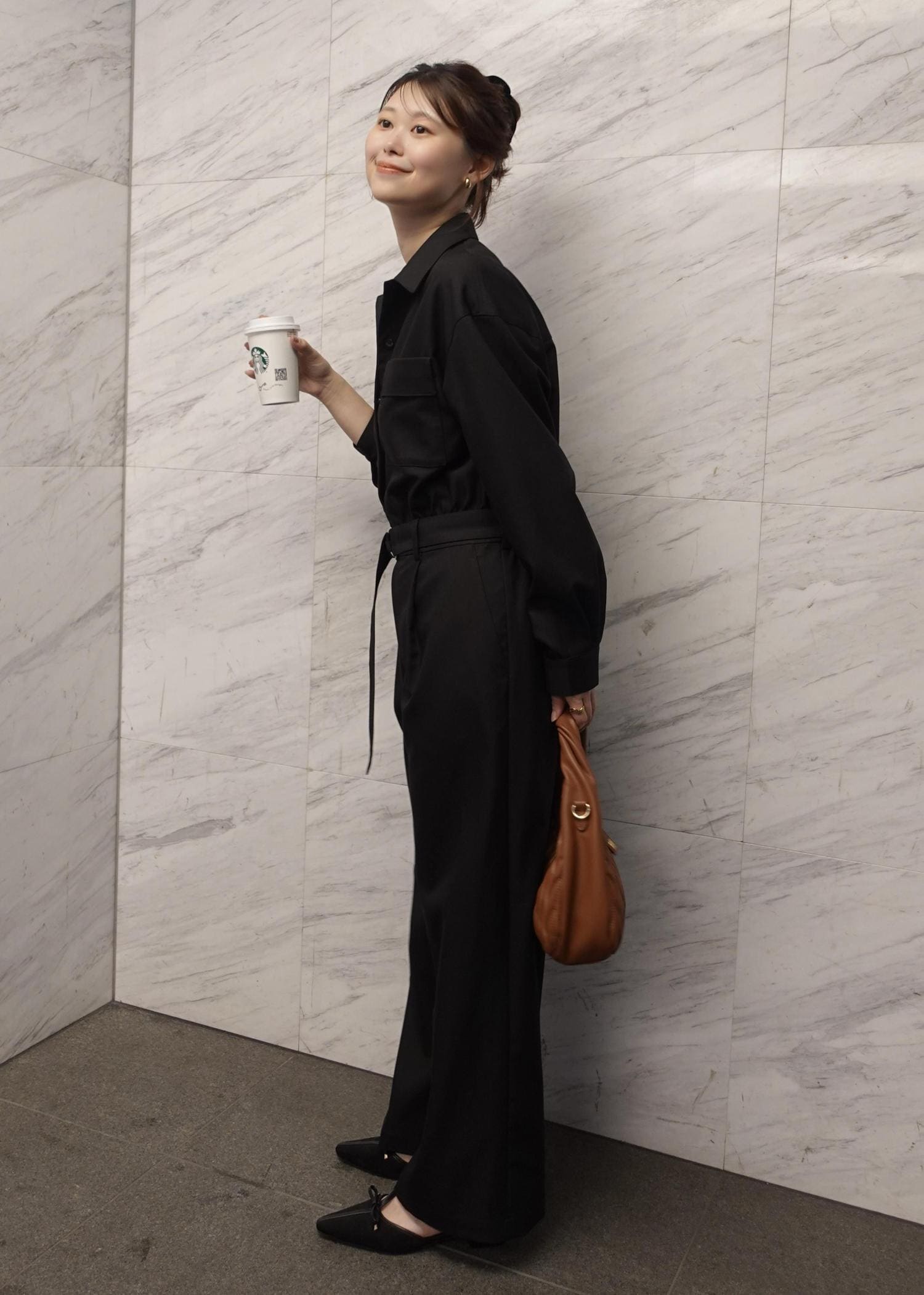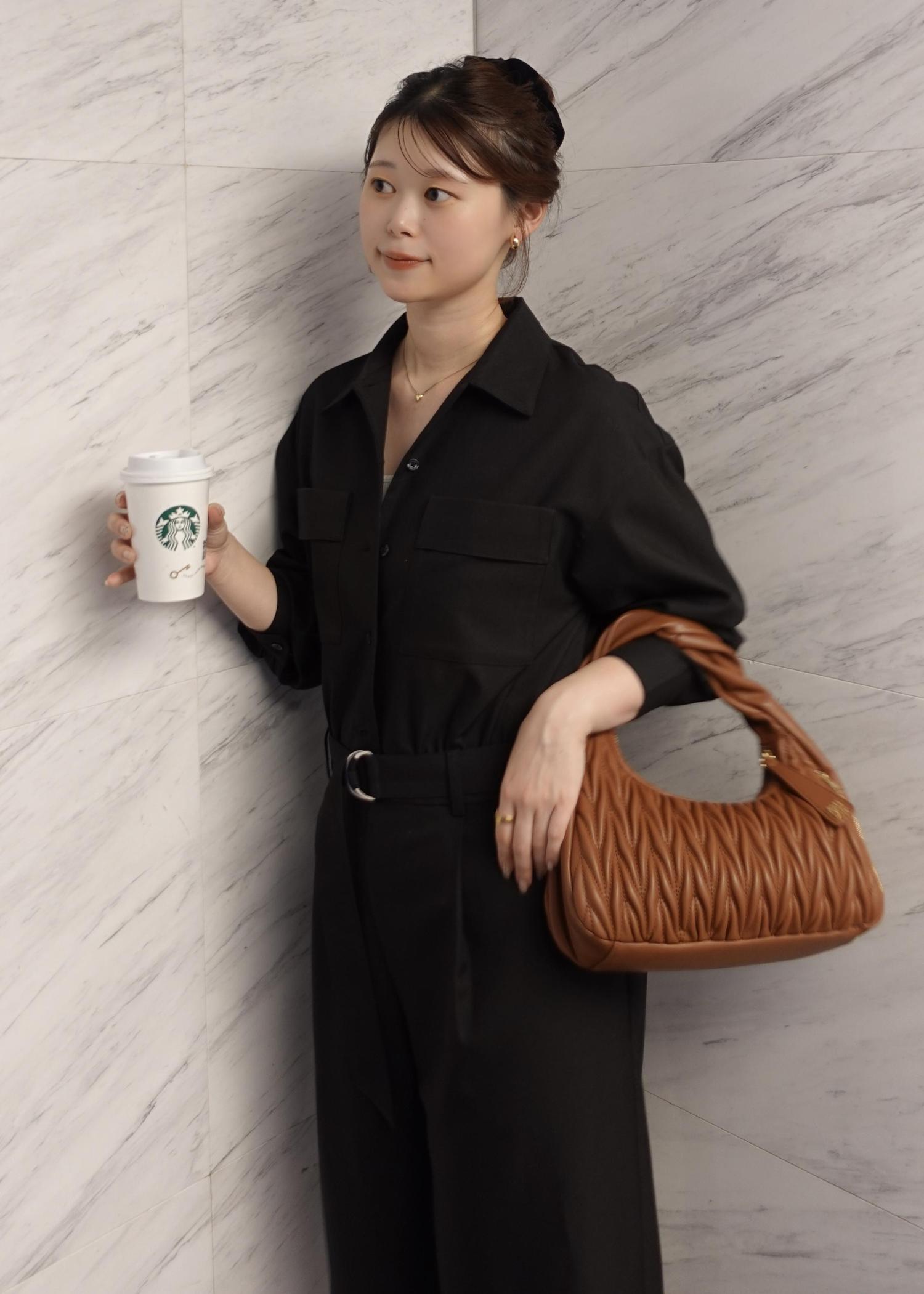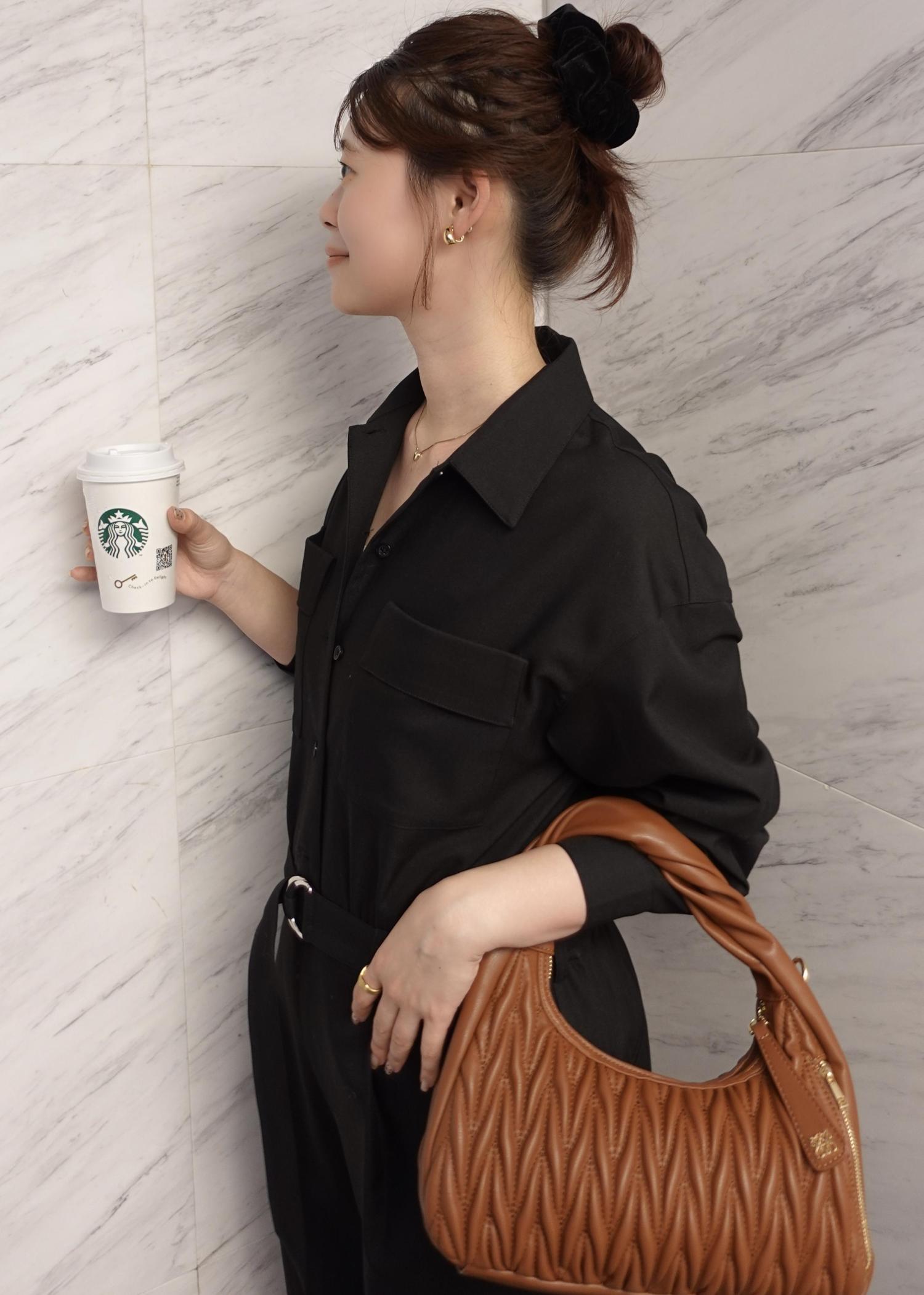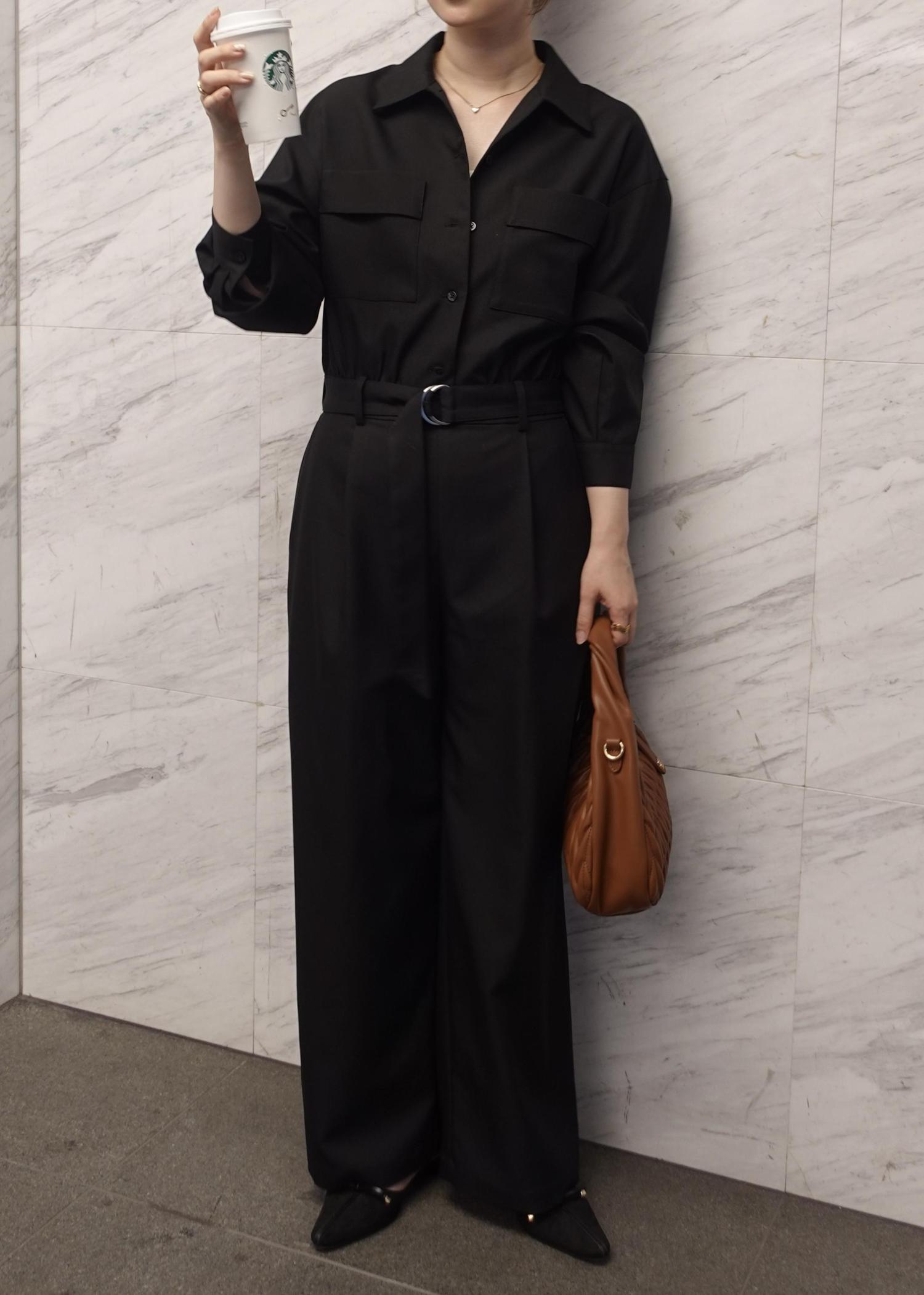 大人っぽさを一気に出してくれるジャンプスーツはブラックに、足元はフラットで綺麗めに!