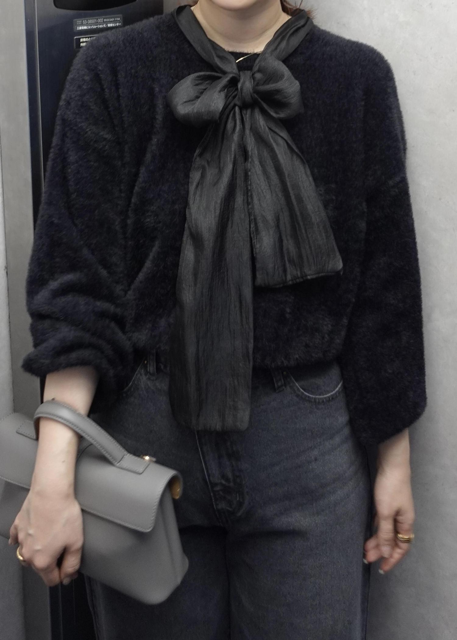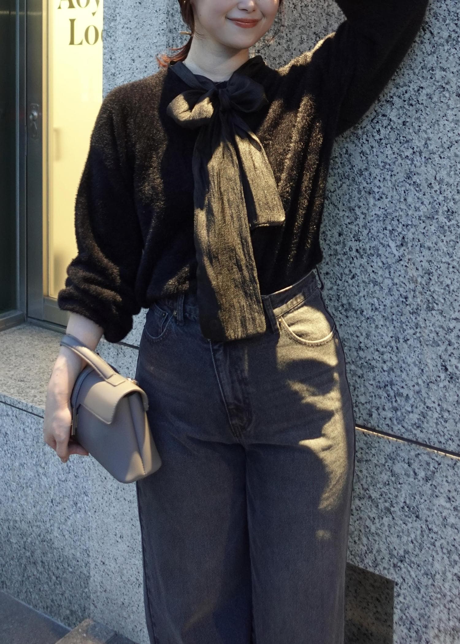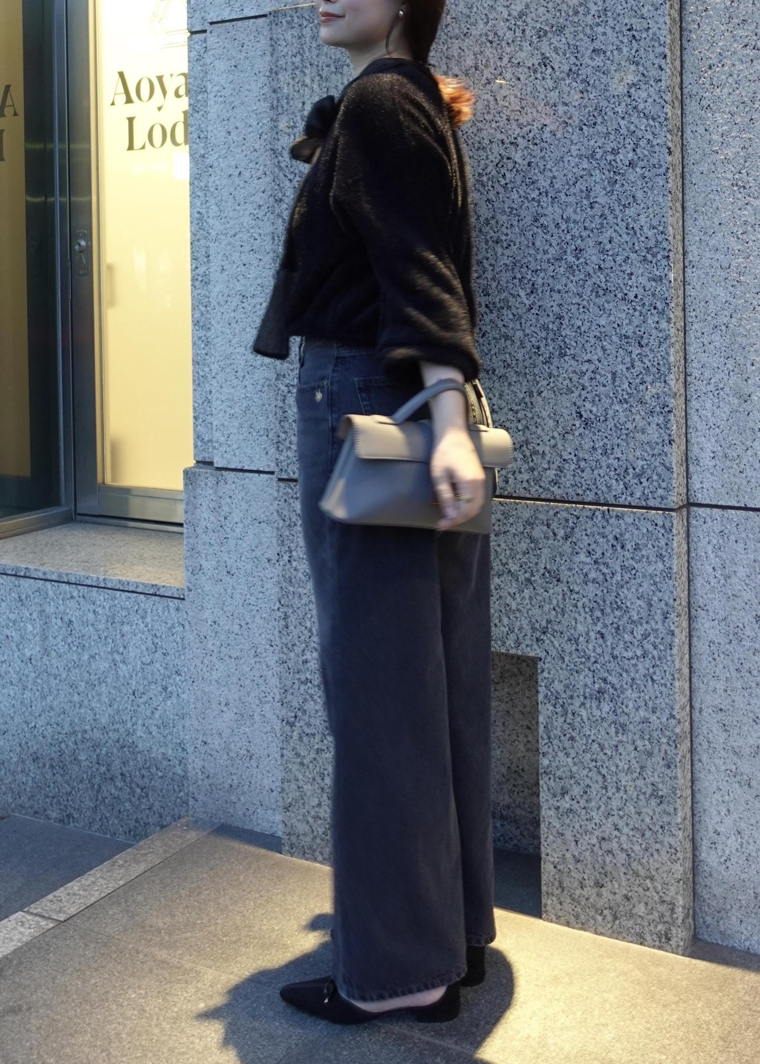 リボンとフェザーニットのコンビネーションのトップスは甘さ控えめなブラックに、デニムも同系色のブラックでシンプルでも大人の甘さもプラスしたコーディネートにしてみました!