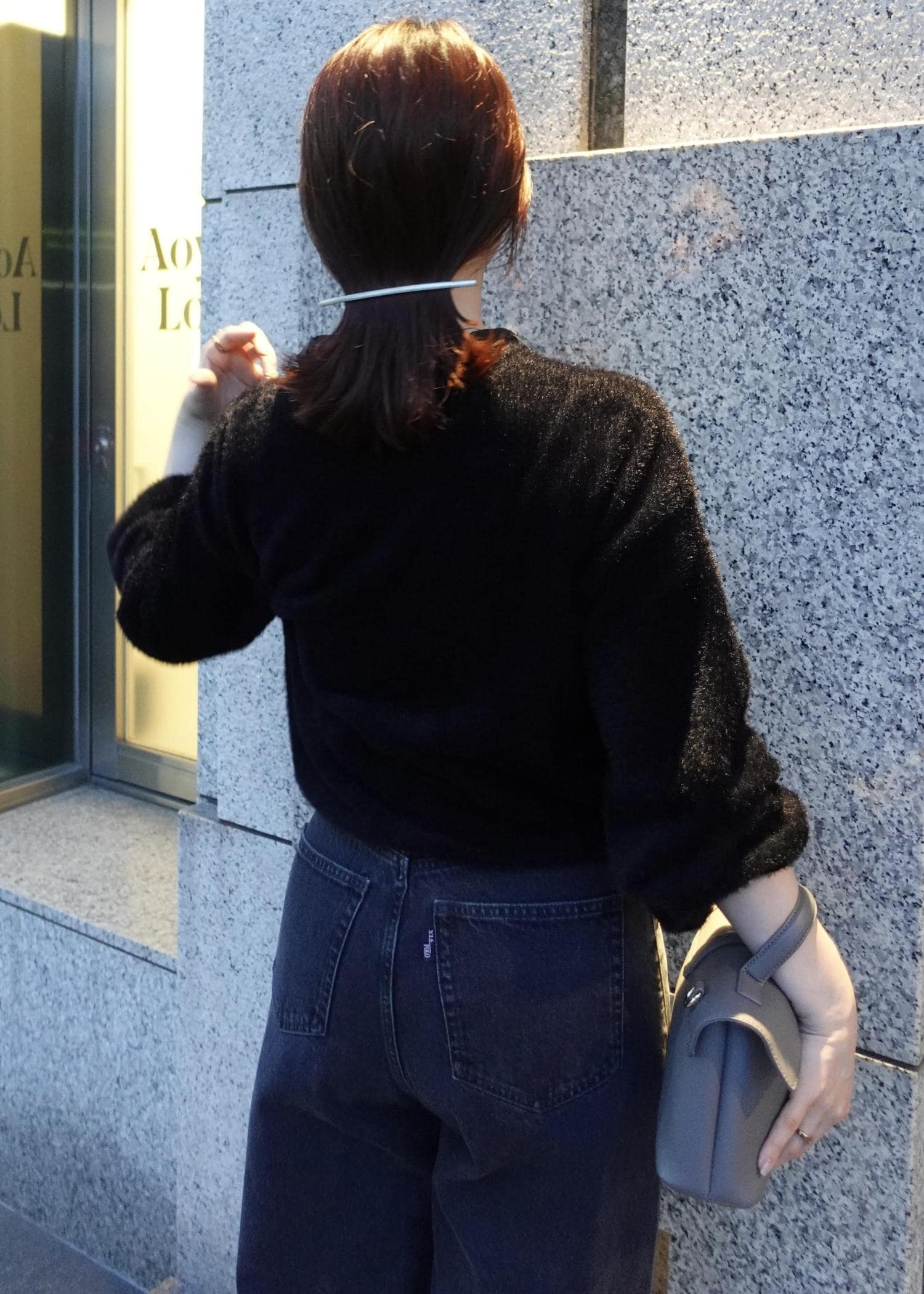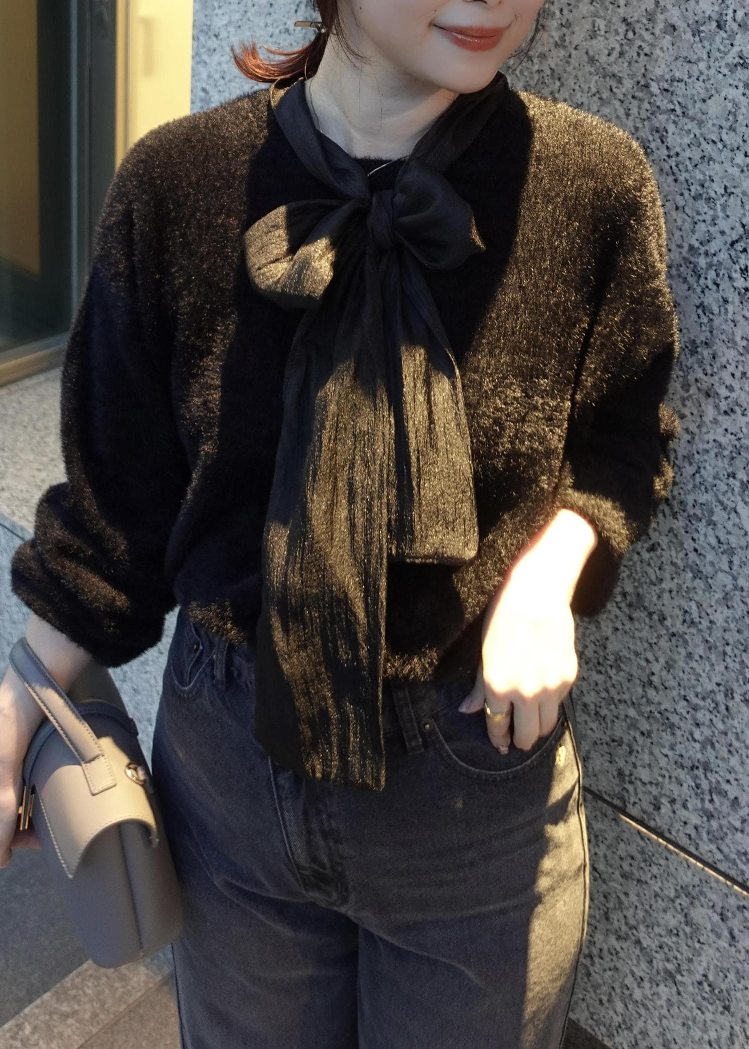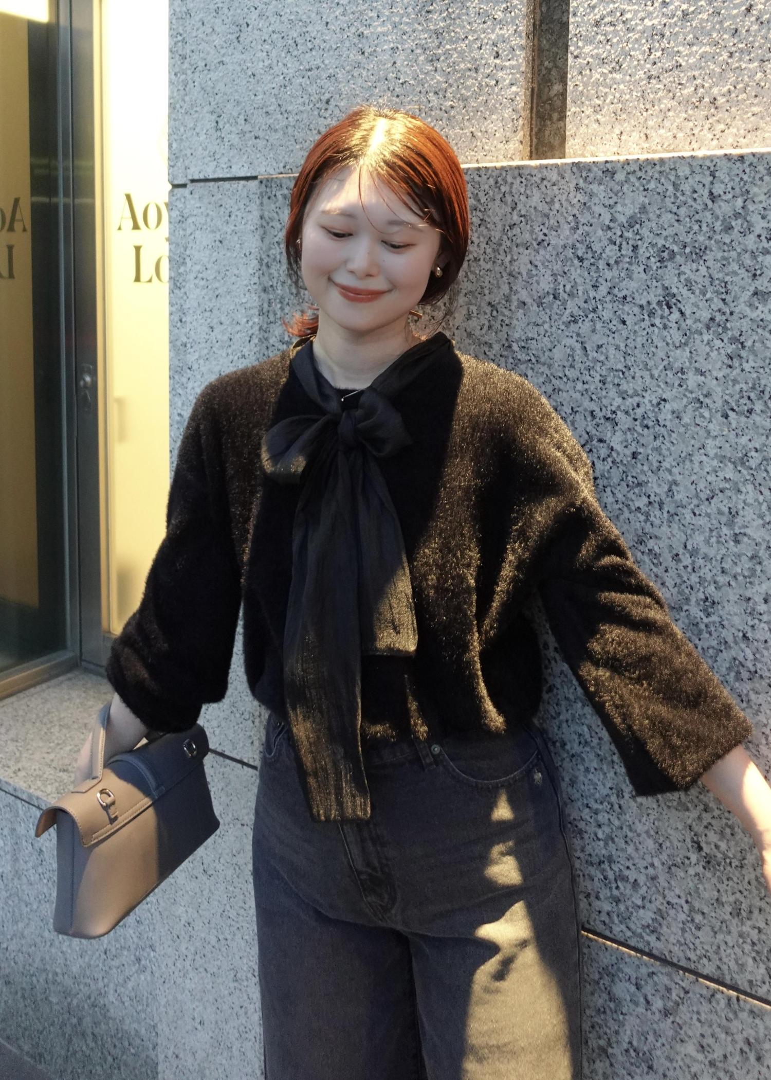 リボンとフェザーニットのコンビネーションのトップスは甘さ控えめなブラックに、デニムも同系色のブラックでシンプルでも大人の甘さもプラスしたコーディネートにしてみました!