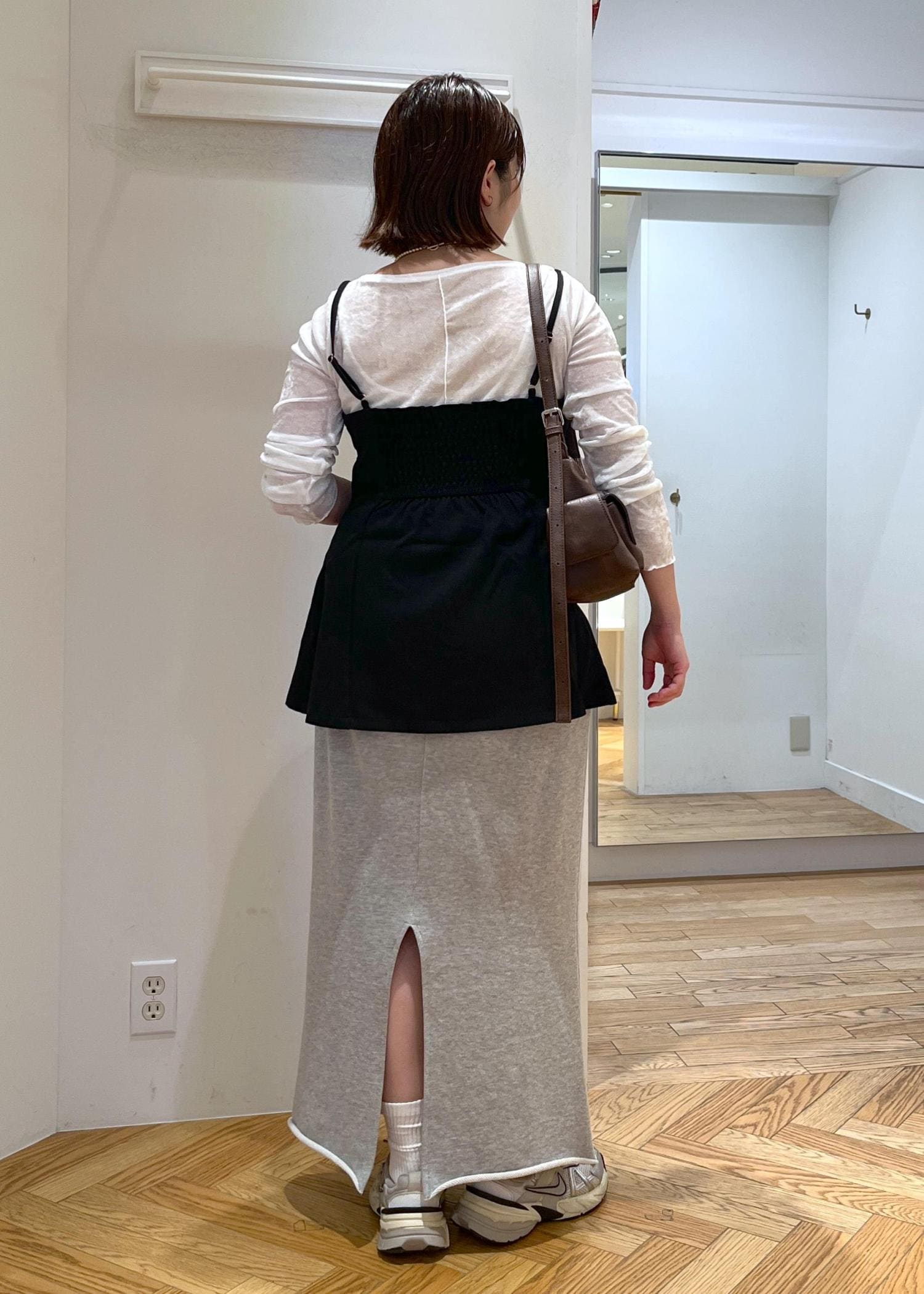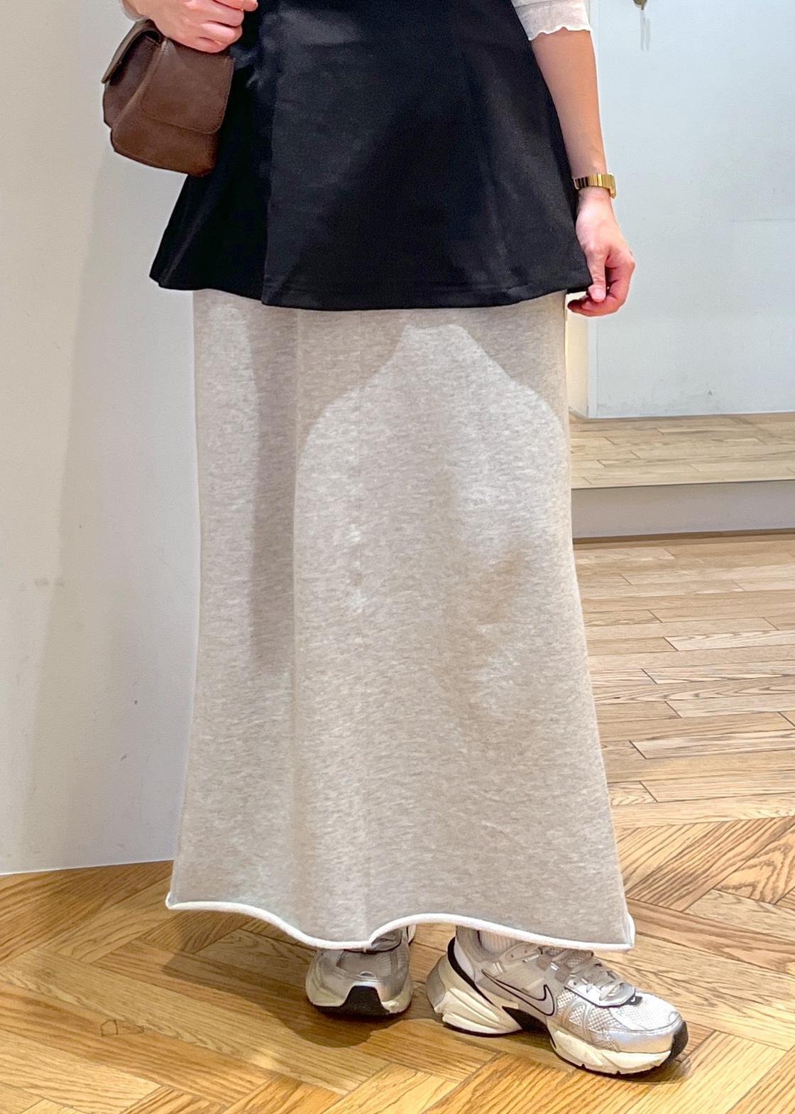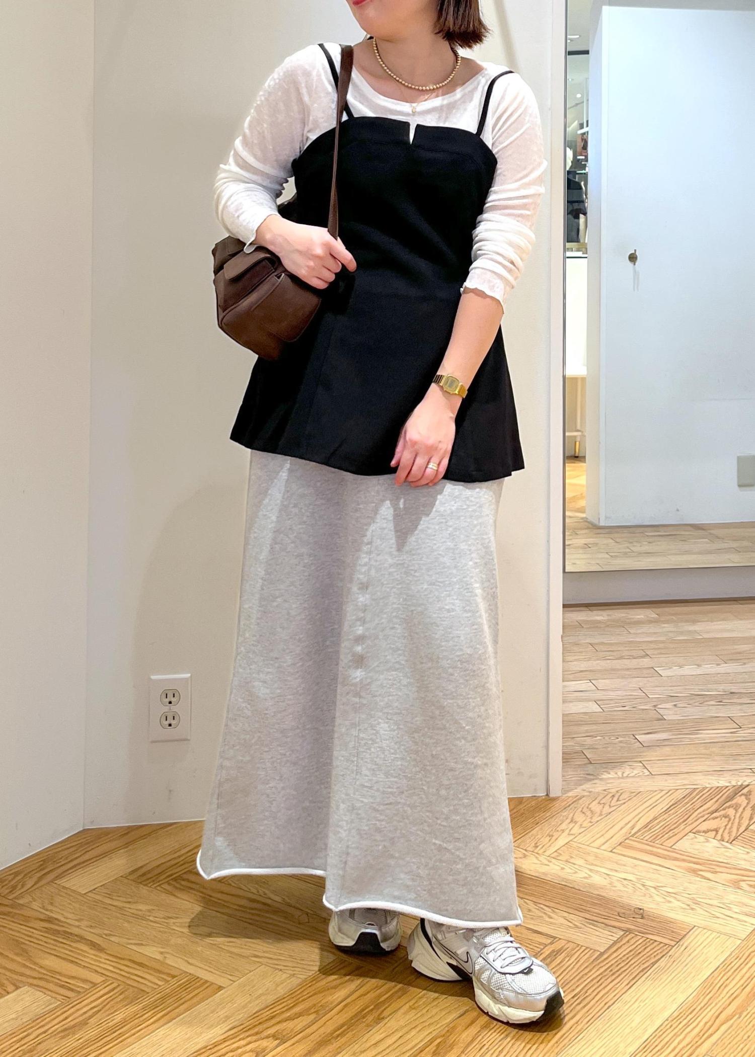 アクティブなスタイルで着たかったので、ボトムはスウェットスカートを合わせ、足元もスニーカーでまとめました!