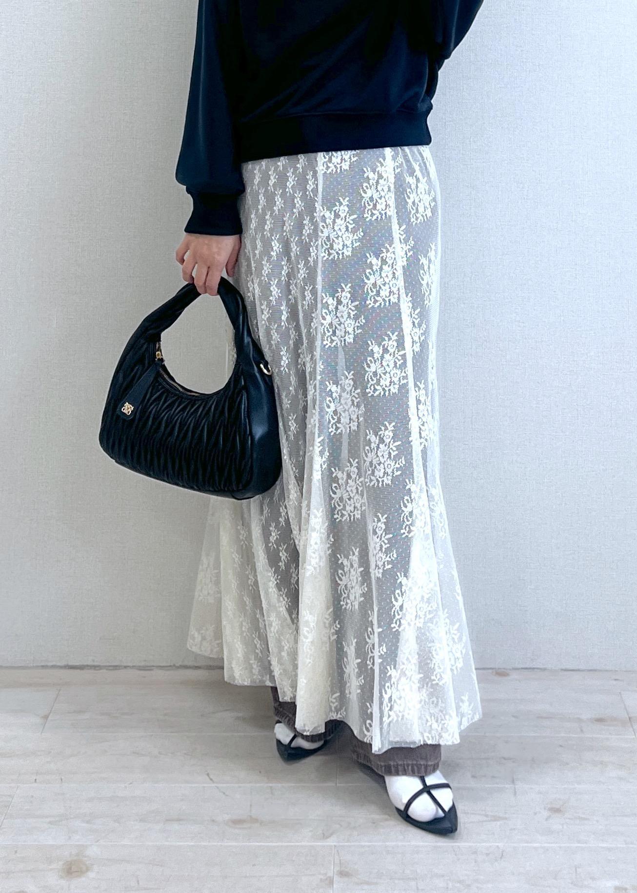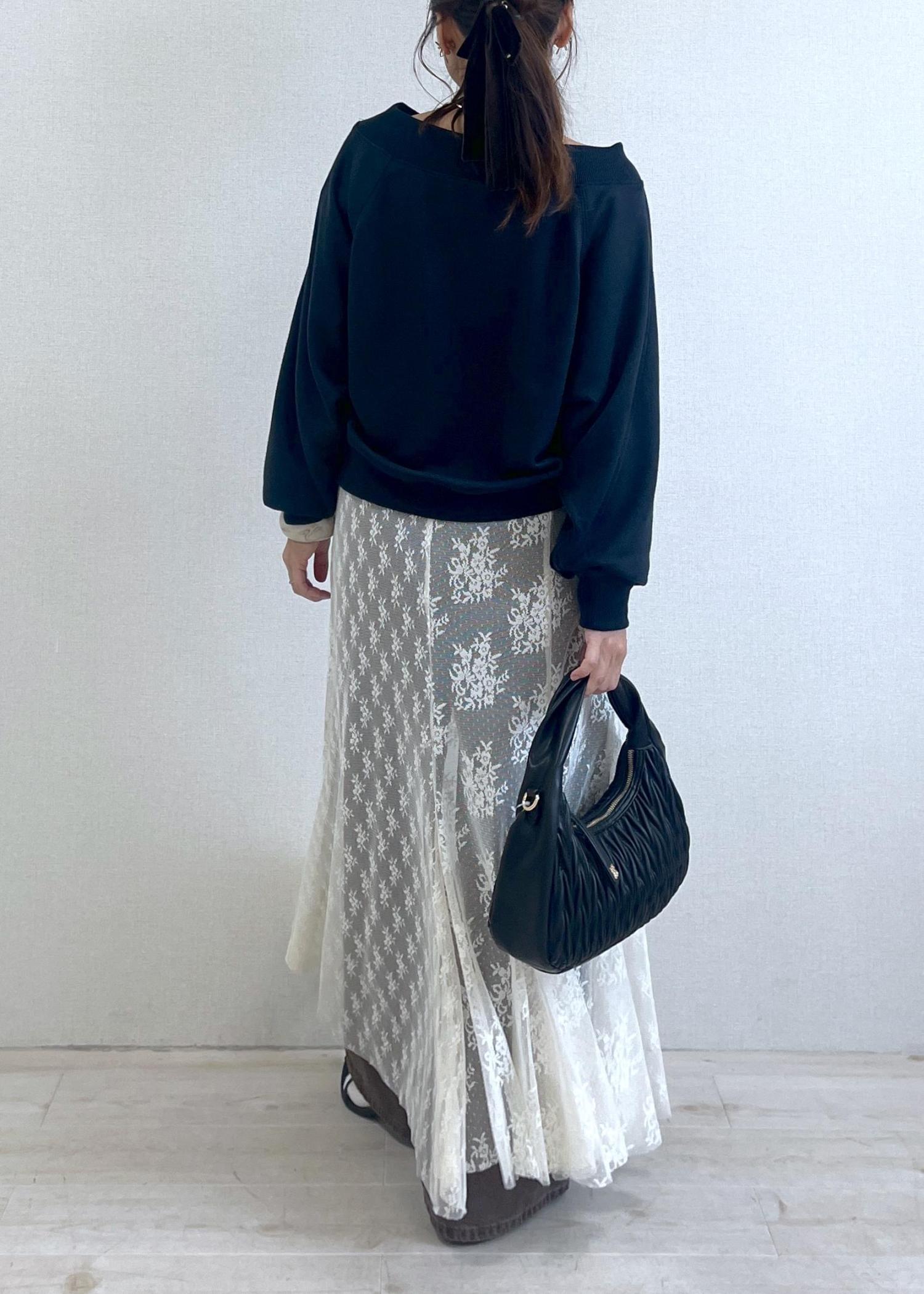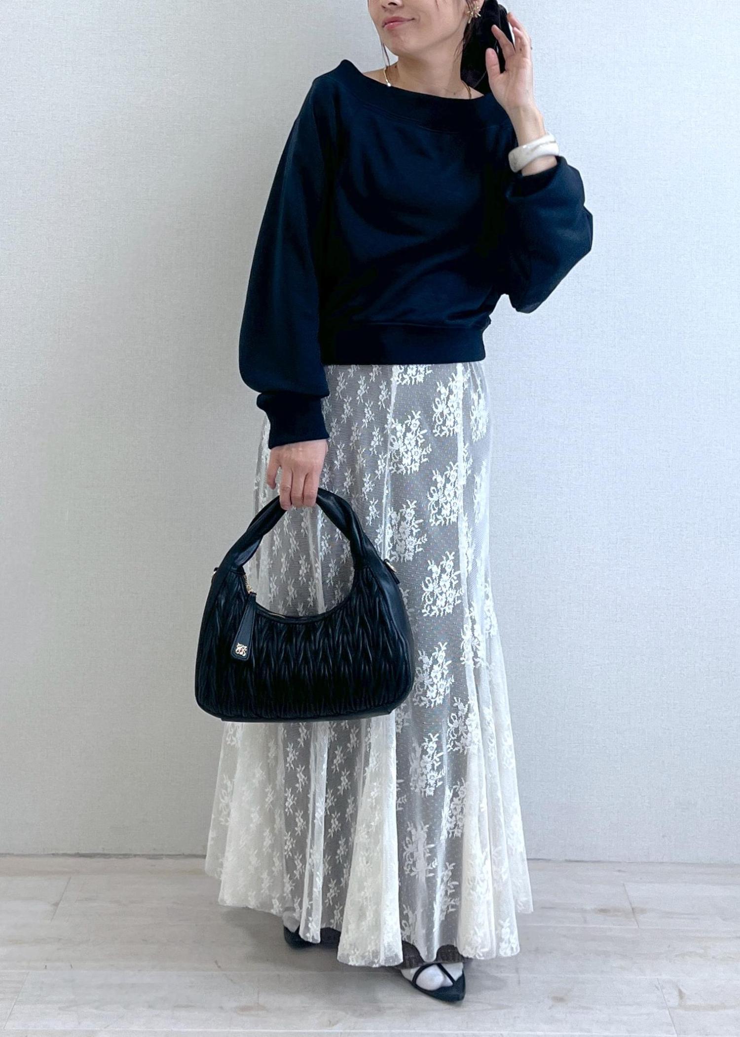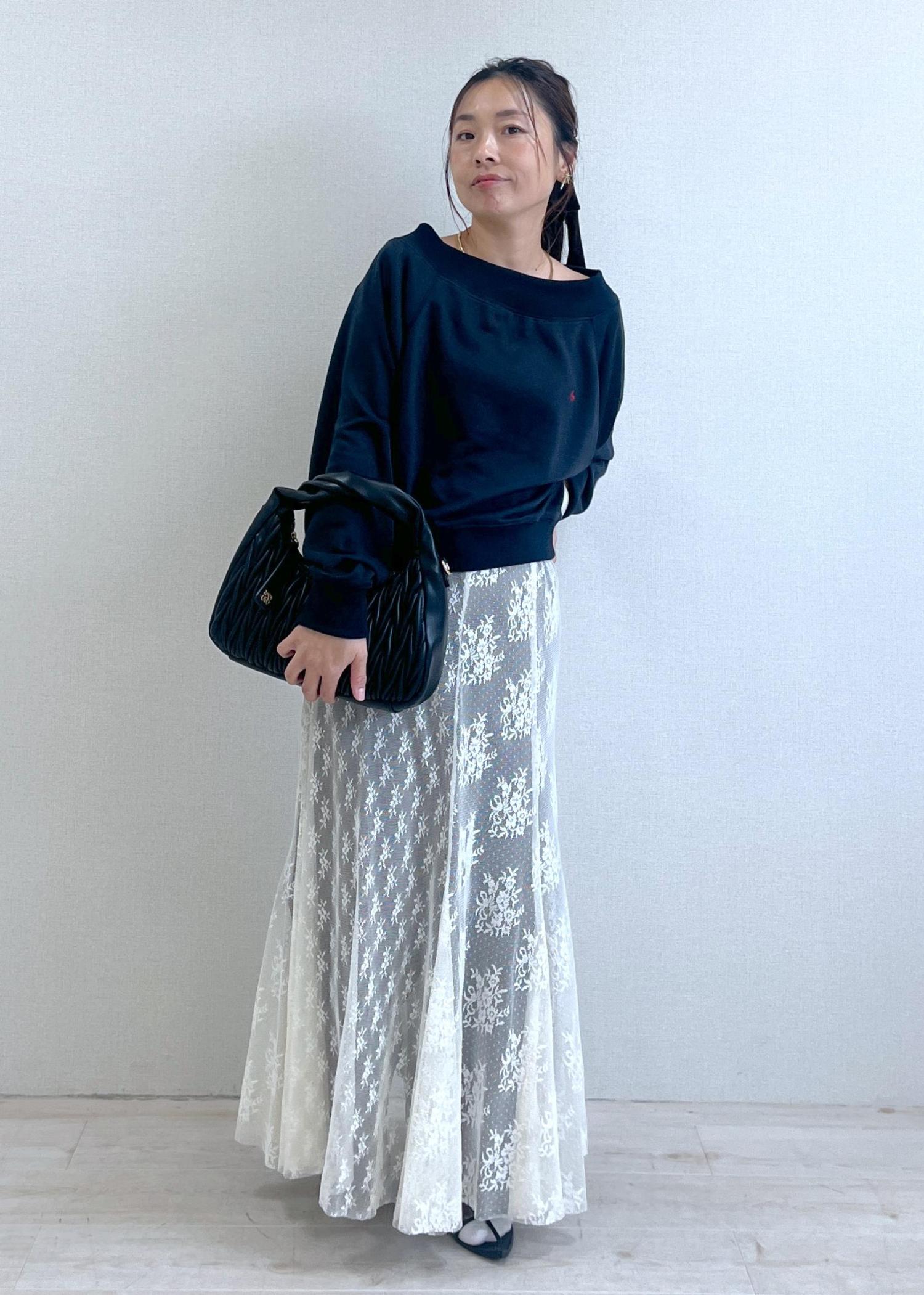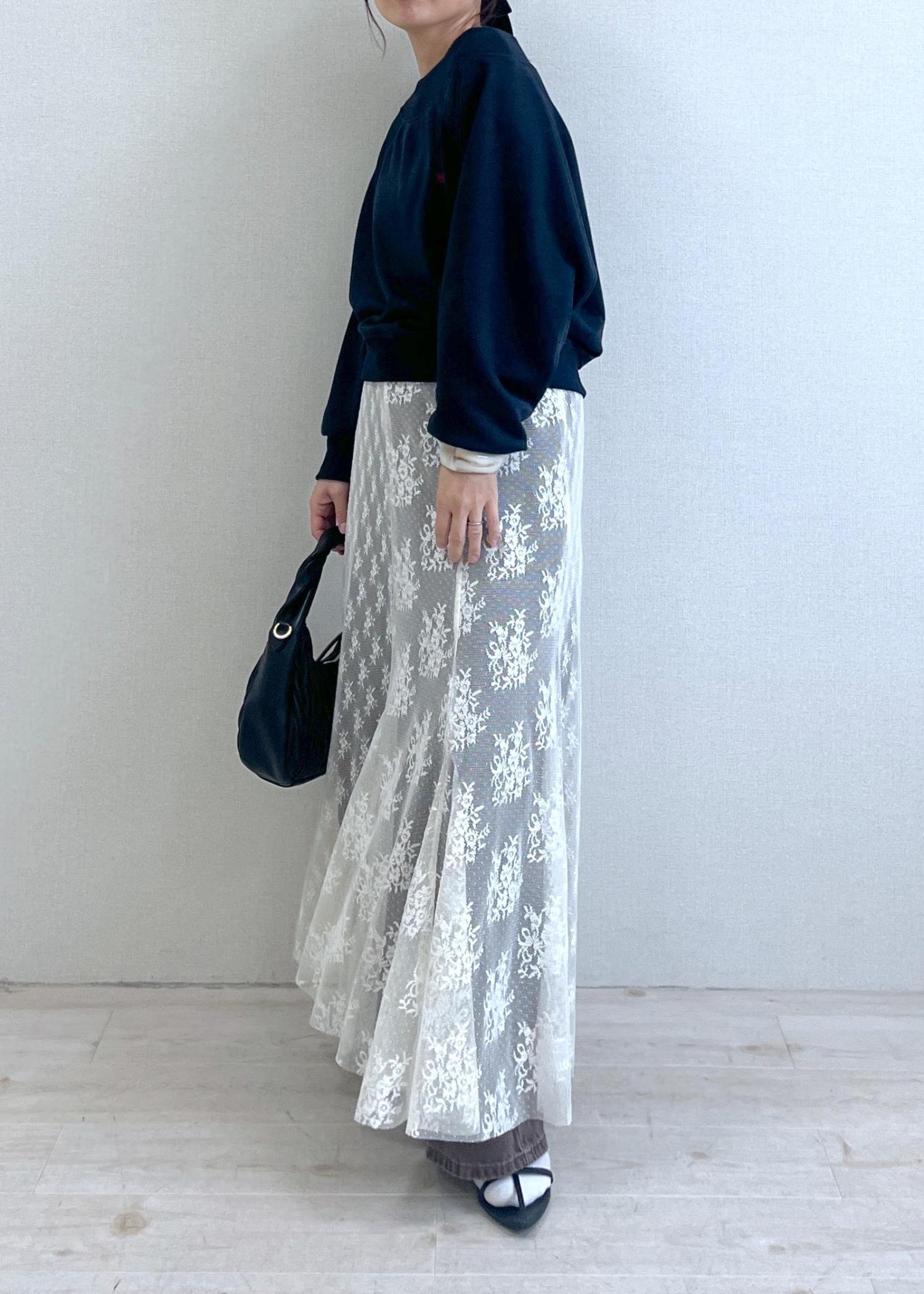 甘くなりがちなレースも、落ち着いたカラーリングとフレアシルエットで大人っぽく仕上がります。