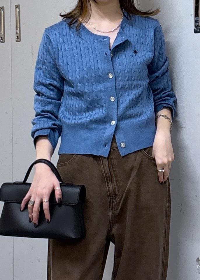 コンパクトなサイズ感のカーディガンと少し腰履きなデニムのバランスも抜群!