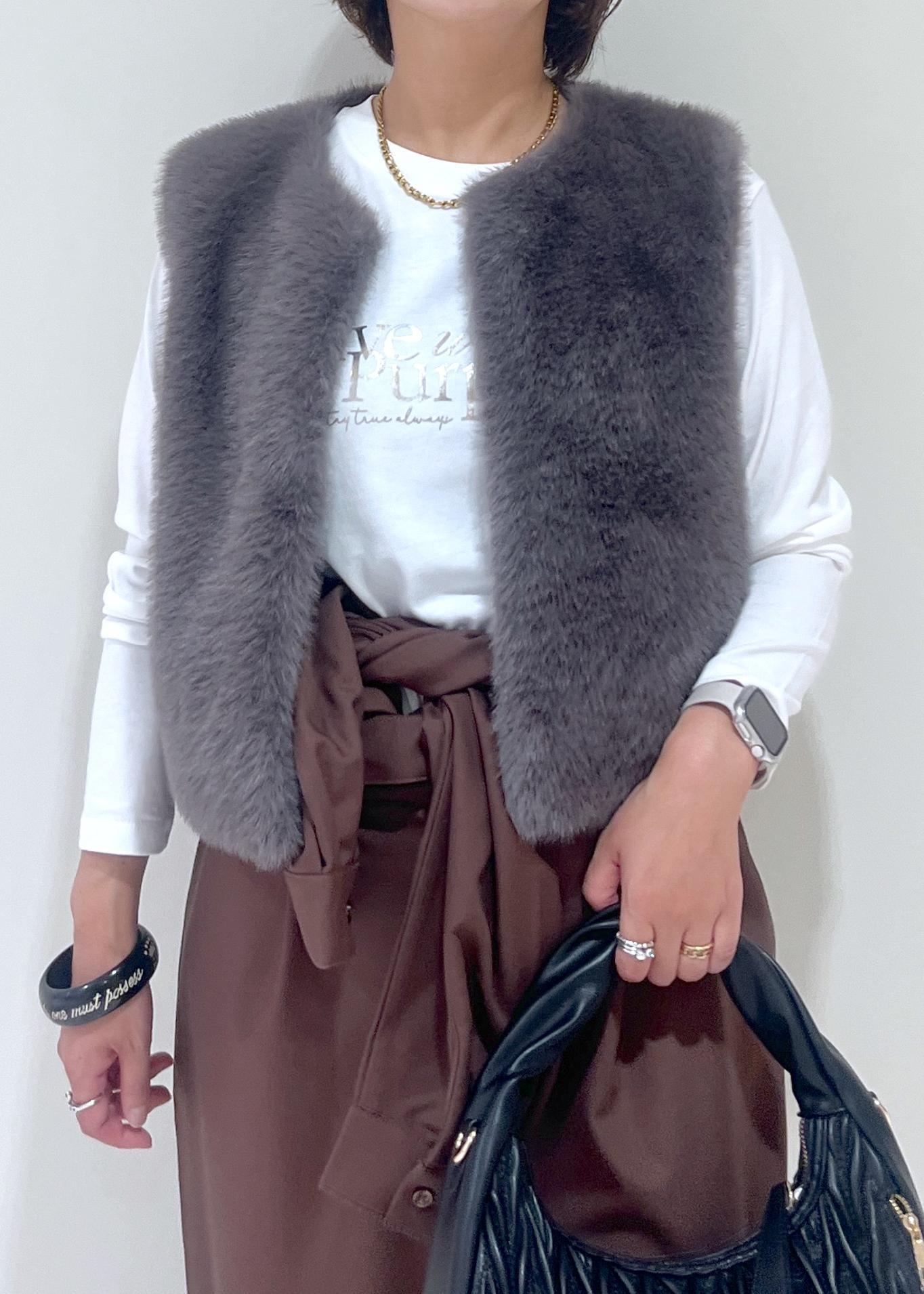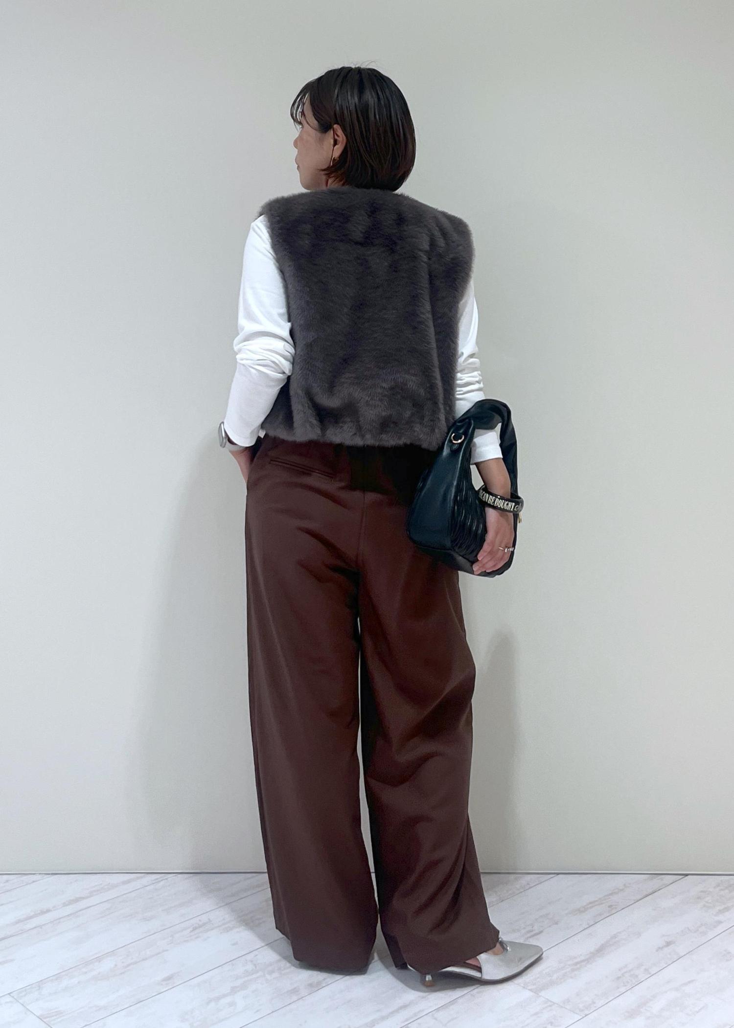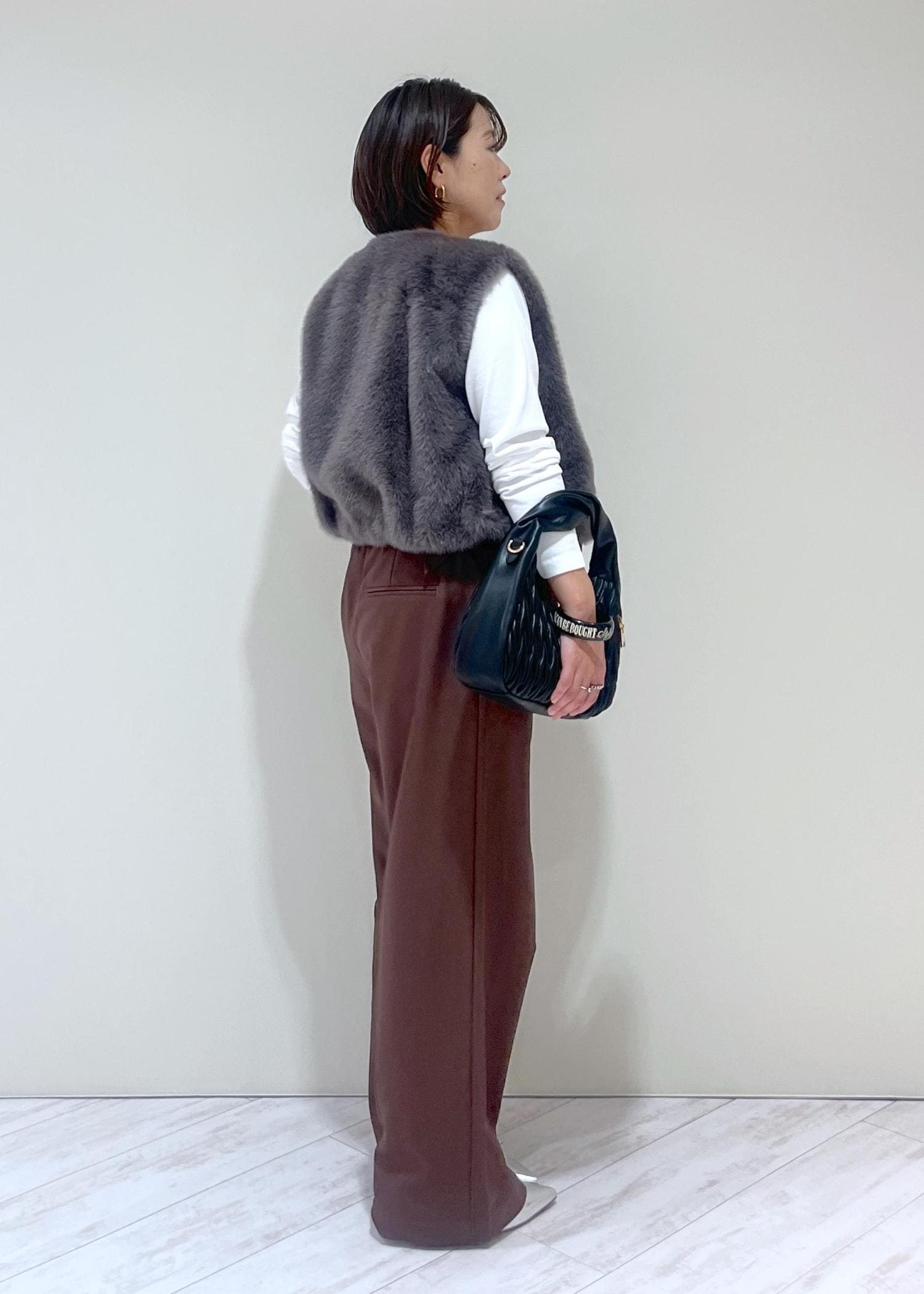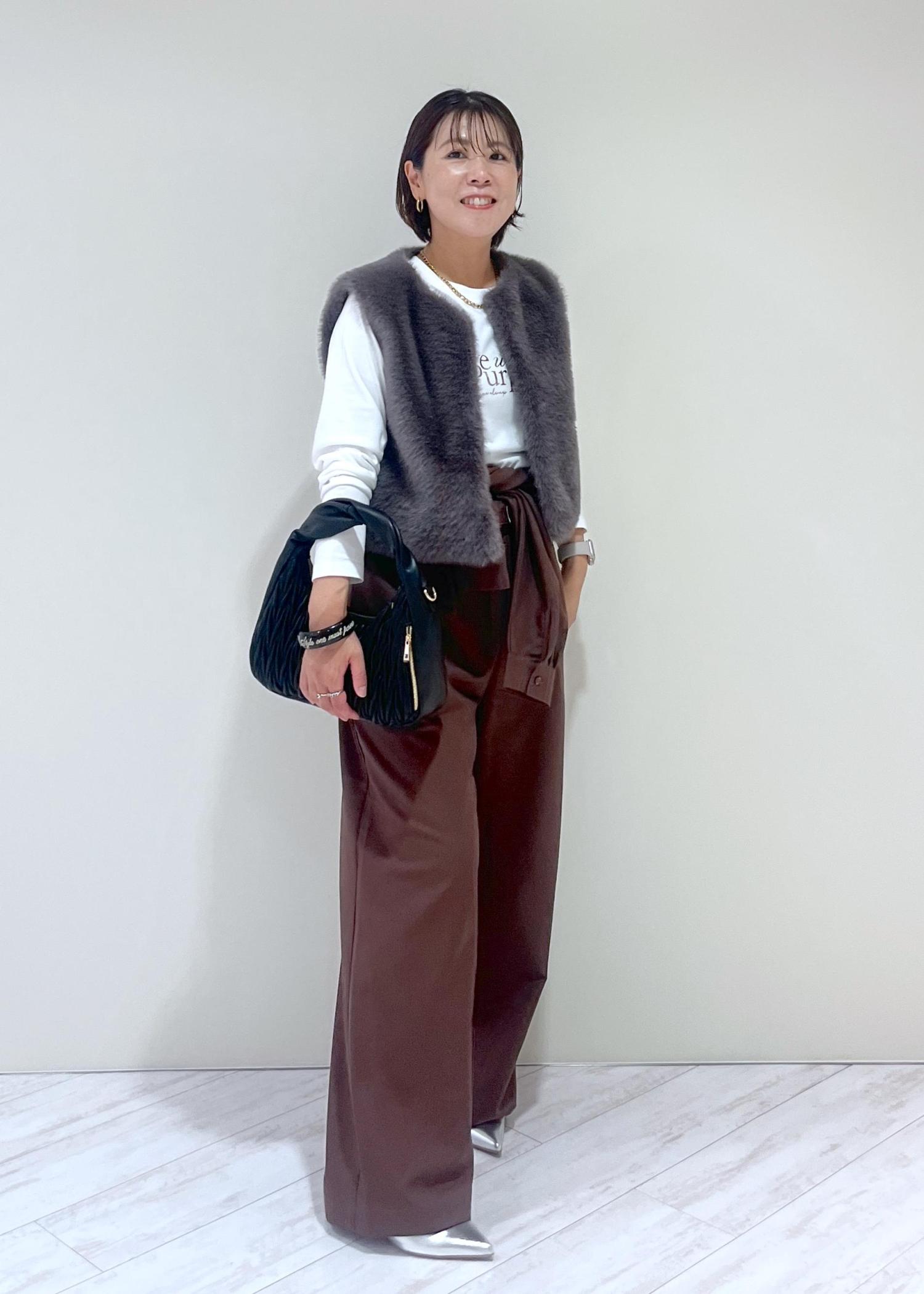 1枚でそのまま着てもかっこいいジャンプスーツをあえてパンツにし、ファーベストを合わせて大人かっこいいスタイリングにしました!